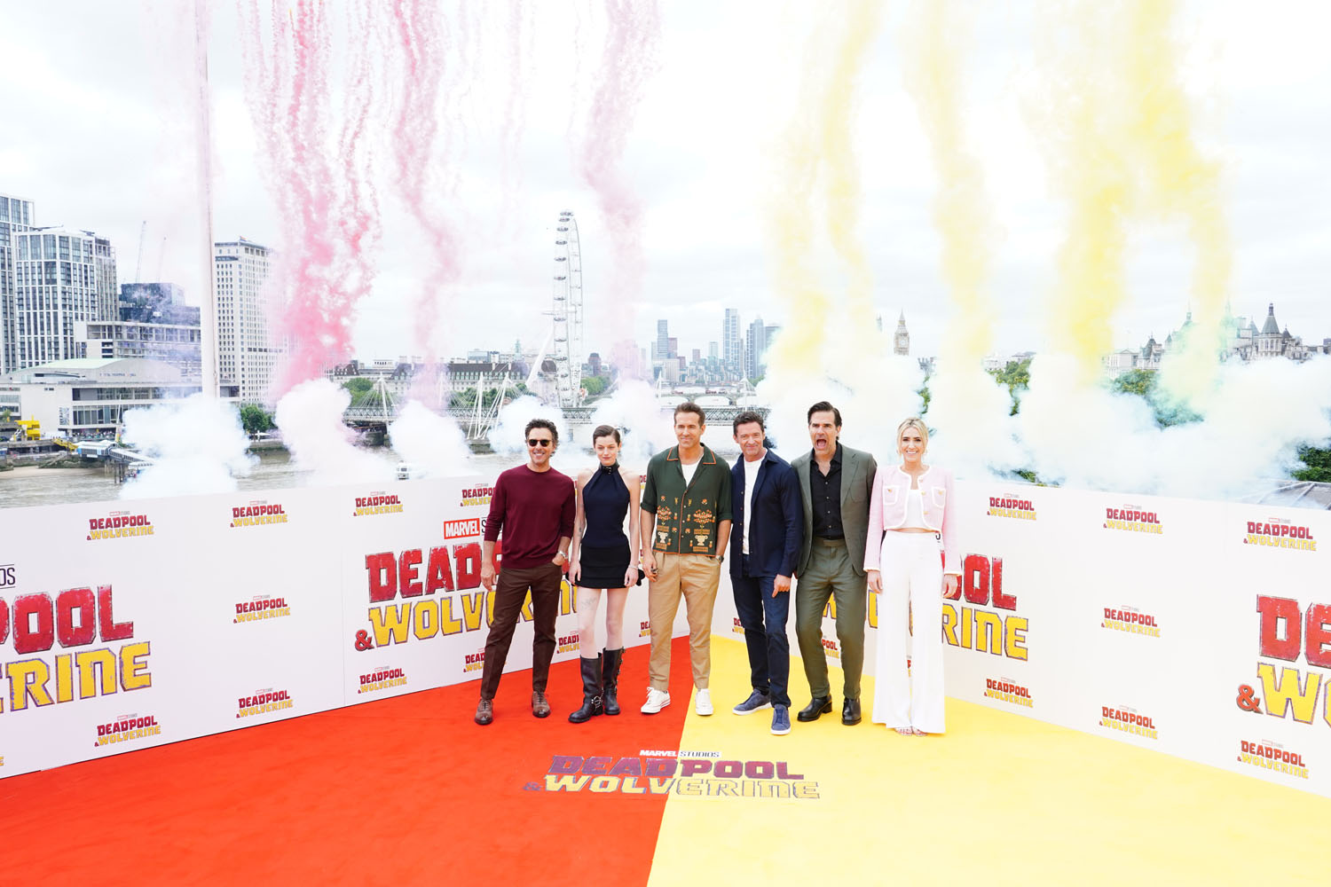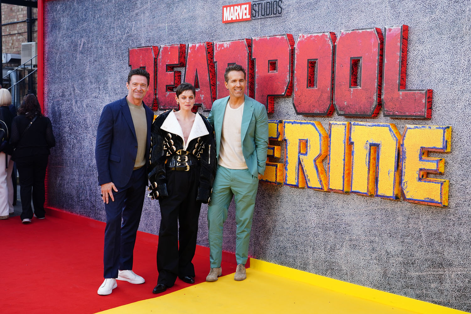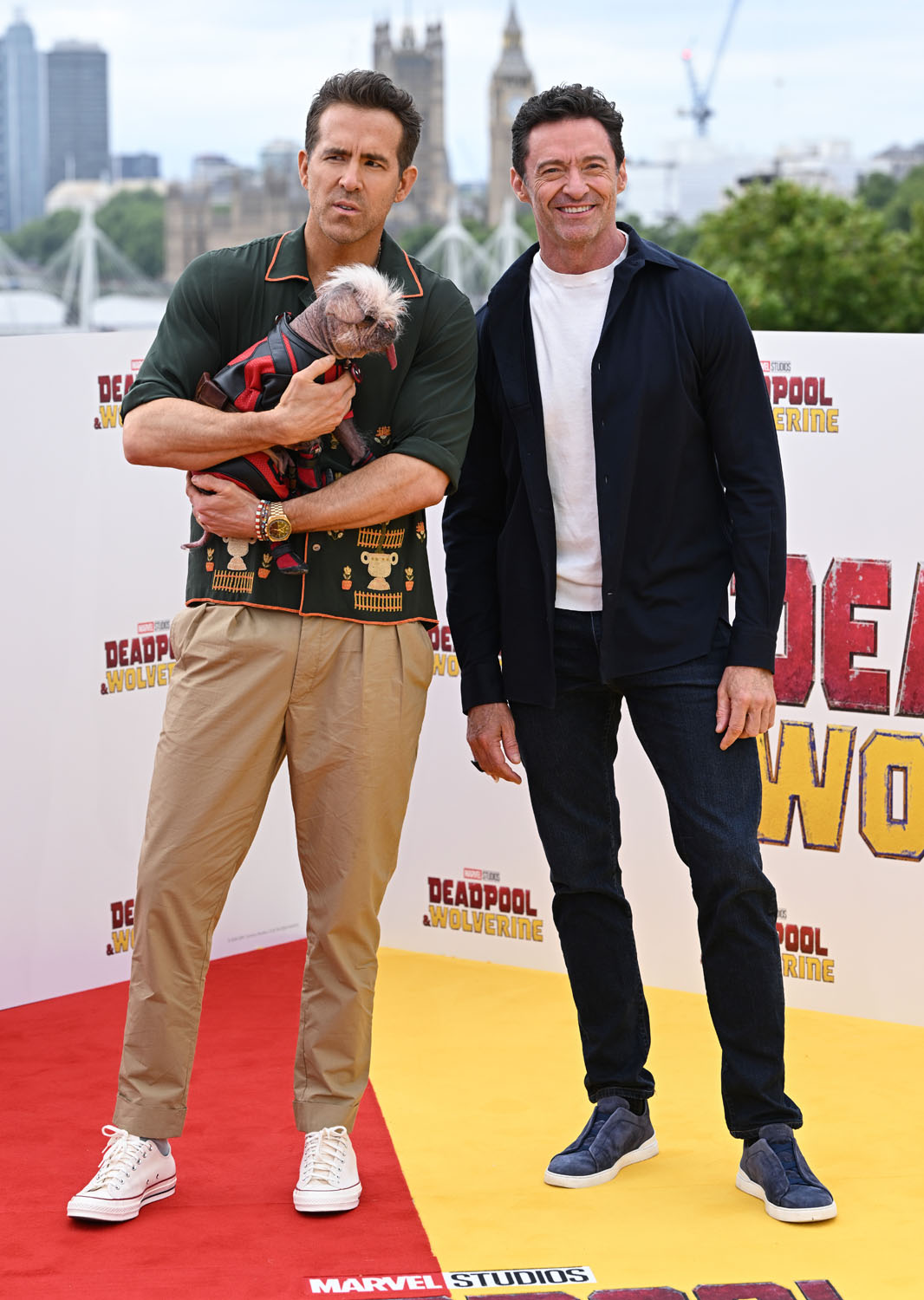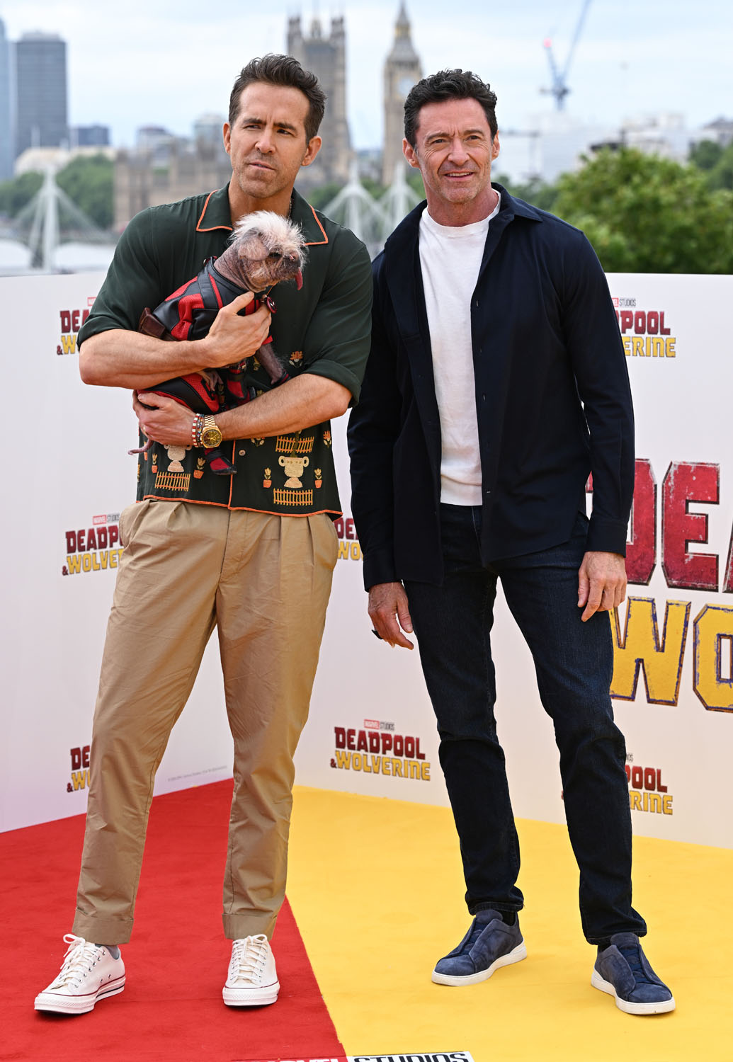 Here is Ryan Reynolds, Hugh Jackman, Emma Corrin, director Shawn Levy, and Peggy the dog in London yesterday. Emma Corrin looks AMAZING. Also attached - shots of the cast at the London photo call today.