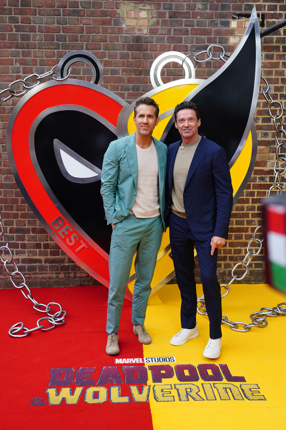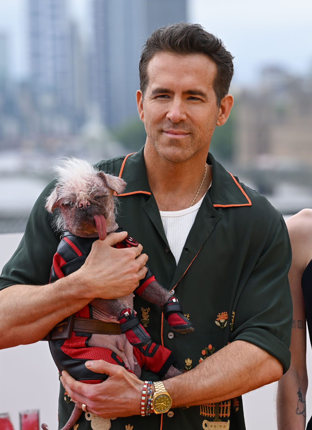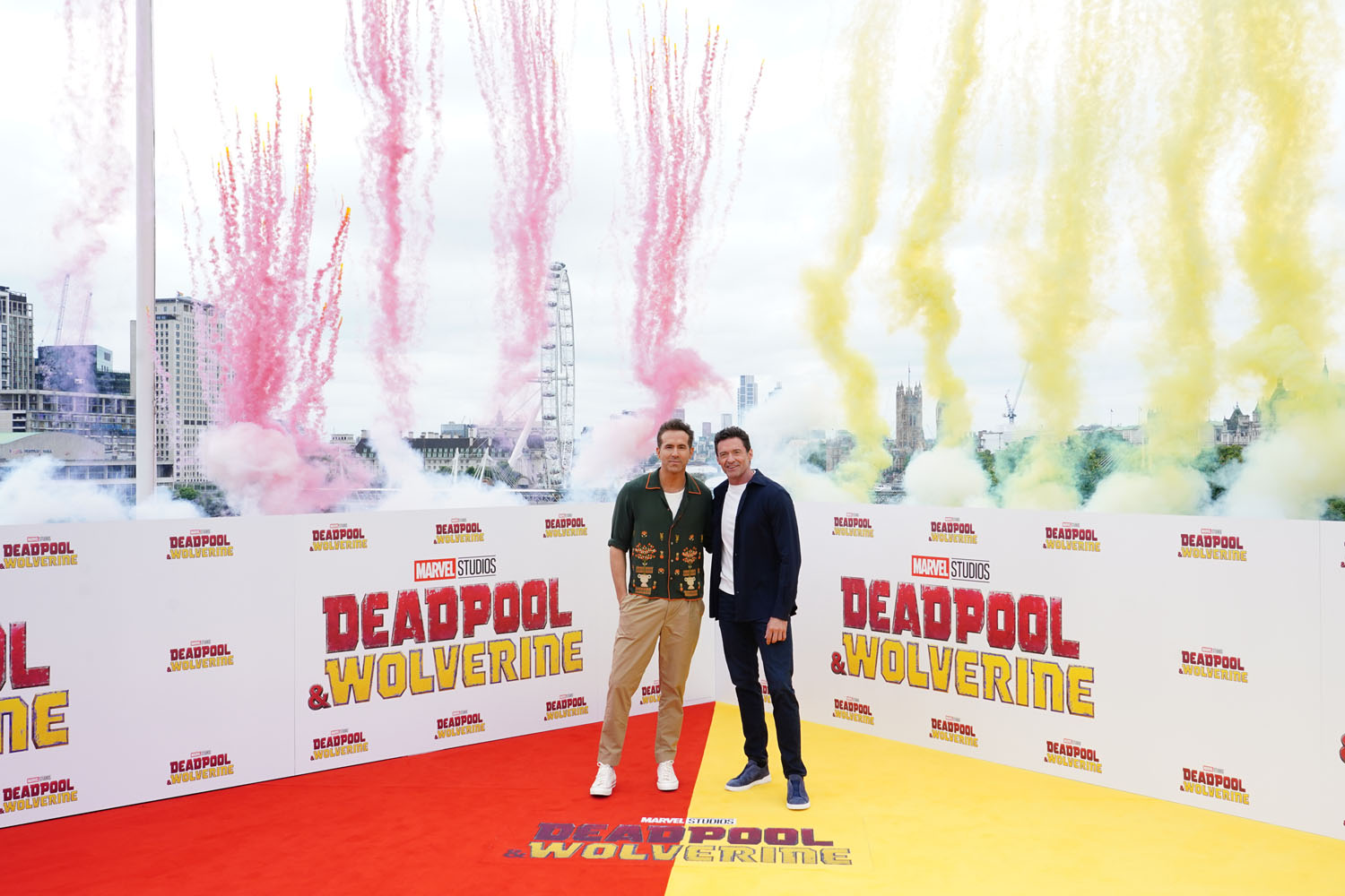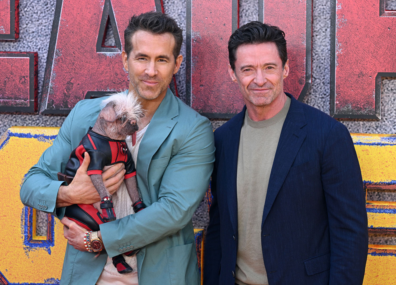 Here is Ryan Reynolds, Hugh Jackman, Emma Corrin, director Shawn Levy, and Peggy the dog in London yesterday. Emma Corrin looks AMAZING. Also attached - shots of the cast at the London photo call today.