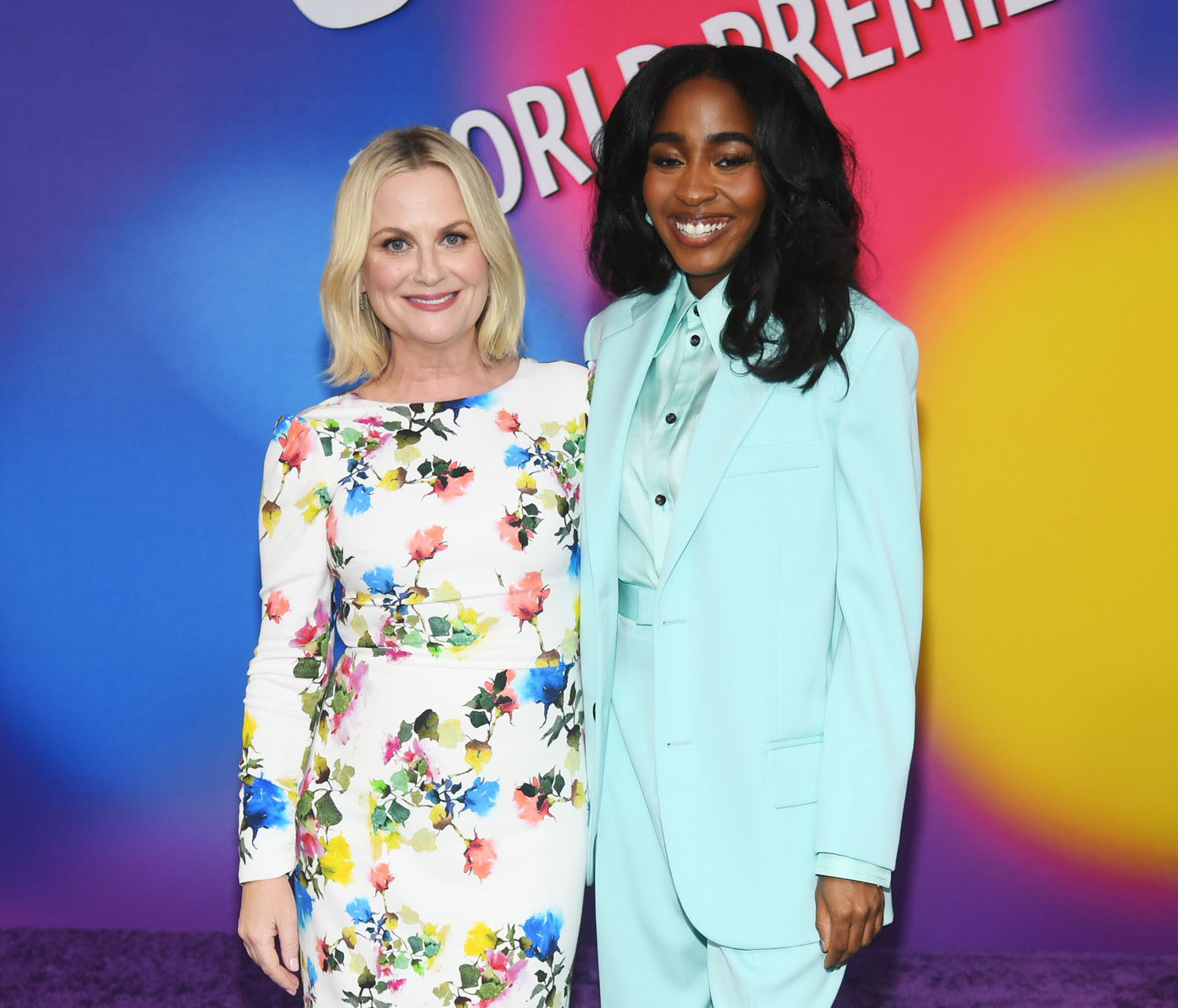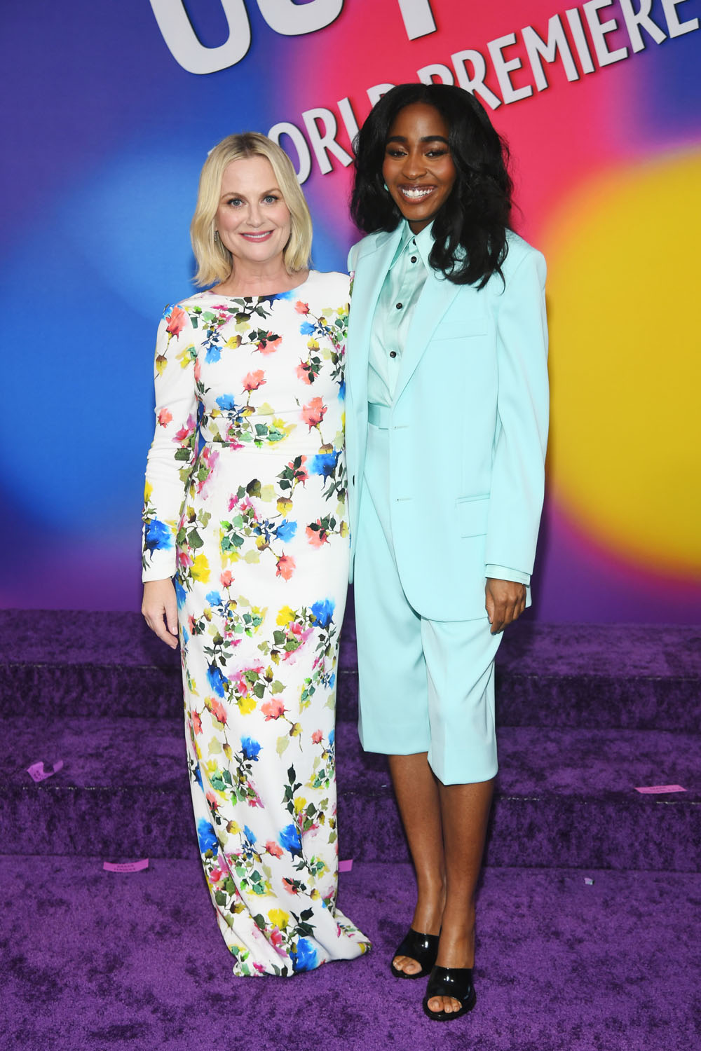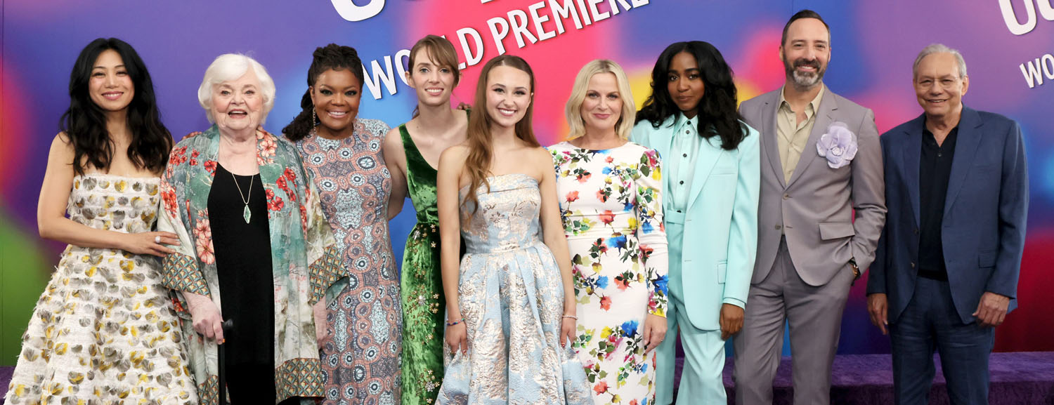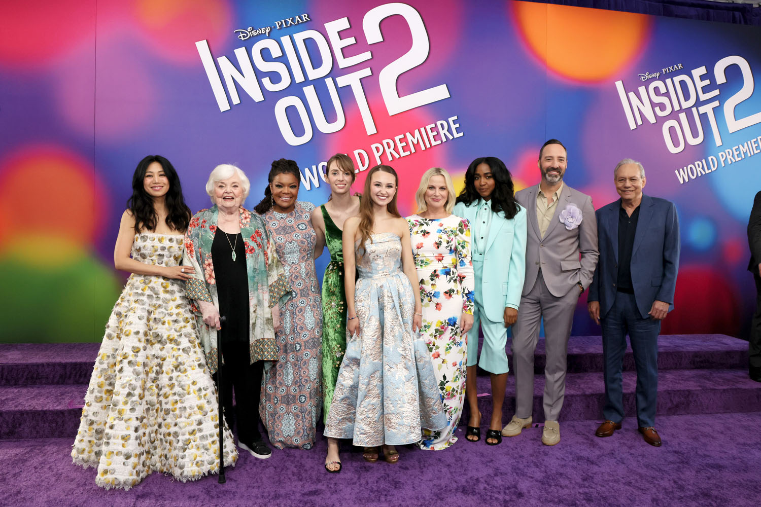 Most of the original cast is back, including Amy Poehler, who wore a fun floral frock to the premiere, Phyllis Smith, Lewis Black, Kyle MacLachlan, and Diane Lane. But there are some new voices aboard as the now-teenaged Riley’s emotions. Liza Lapira is taking over from Mindy Kaling as Disgust, and Tony Hale has replaced Bill Hader as Fear. There are also new emotions like Adele Exarchopoulos as Ennui, Maya Hawke as Anxiety, Paul Walter Hauser as Embarrassment, and Ayo Edebiri as Envy. Ayo showed up in a sky-blue suit with short trousers, very summer fun.