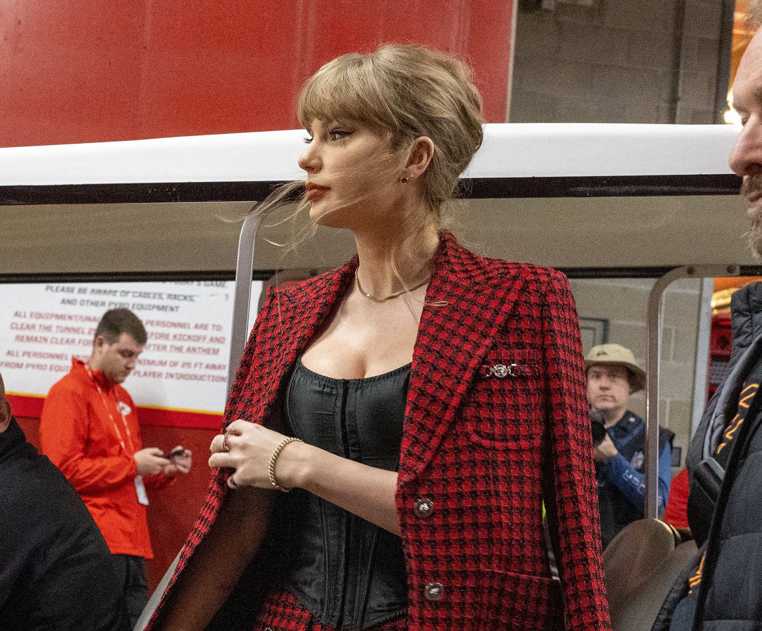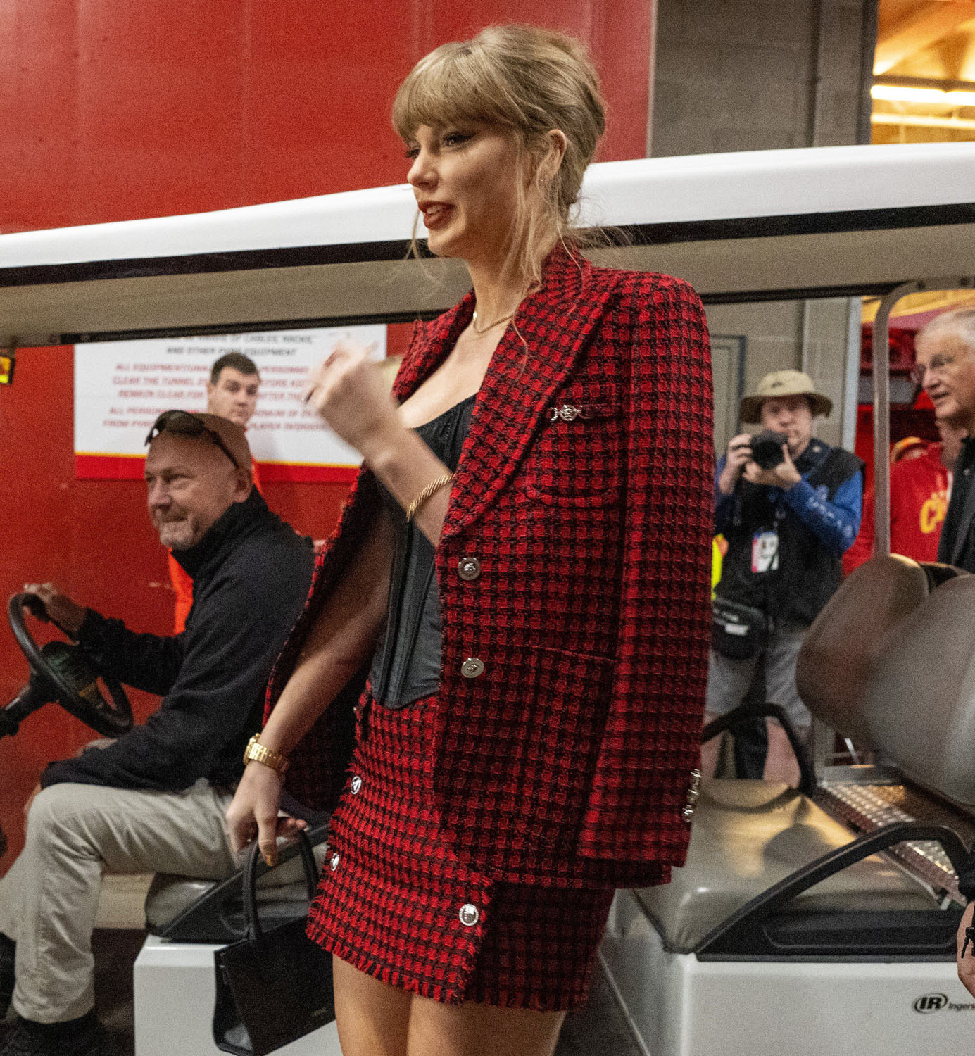 That was Friday. On Sunday Taylor was in KC for Travis’s game, wearing Versace and a corset. Thanks, but I hate it. The suit is fine, but the corset (Victoria’s Secret) is a miss, because of the front dip. I get that she’s out here trying to high-low with the price points but I don’t think she has the eye for it. You know what could have saved it for me though? A different pair of boots. There are other Versace options that are so much less basic: the riding boot, for example, if she’s not that adventurous. But, like, if we’re talking to the Taylor who decided to take that Vivienne Westwood out for a ride, go for broke in the Versace ribbon cage boots, with the hardware to match the suit! That’s the call that would have gagged me.