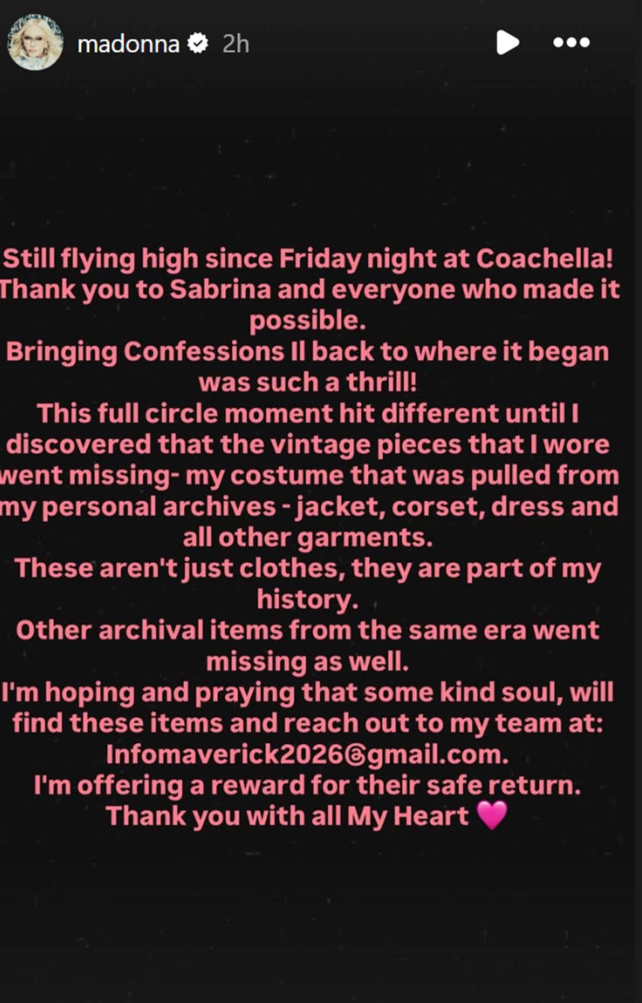 Popstars like Madonna meticulously catalogue their clothes, accessories, props, notes, photos, and more. For example, in her documentary, I Am: Céline Dion, Céline brought us into the warehouse where many of her costumes are stored. And Madonna has given us a glimpse into her archive before, on Instagram, though that video has since been scrubbed from the grid. Now a few of the pieces that were taken out of the vault and should have been returned have been swiped from her possession. Madonna broke the news herself on IG stories – the pieces she wore at Coachella are missing, and she’s appealing for their return.