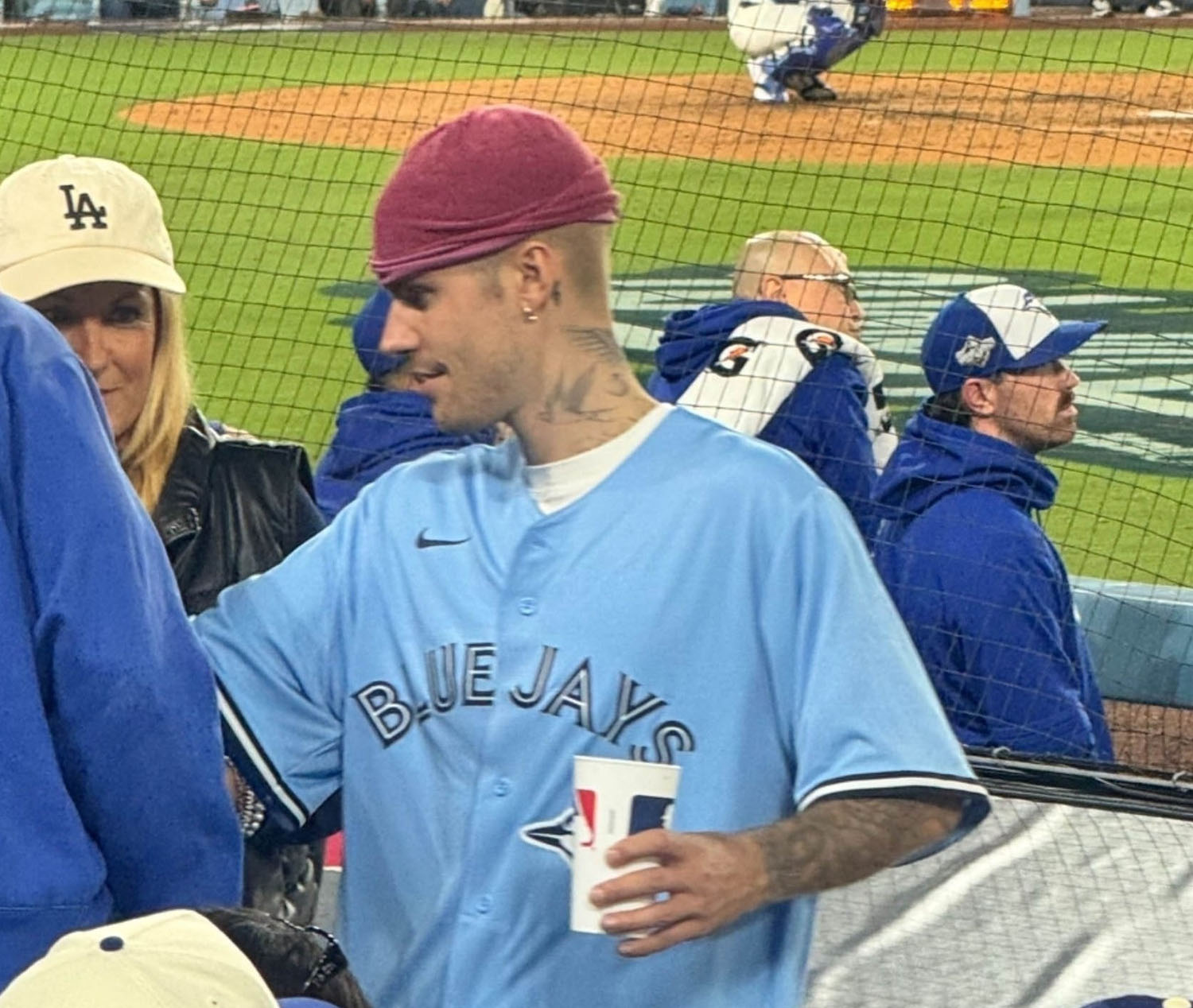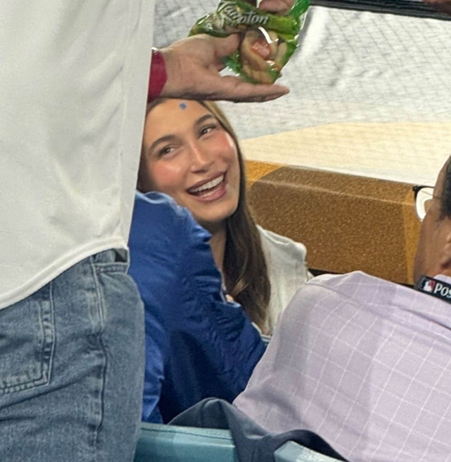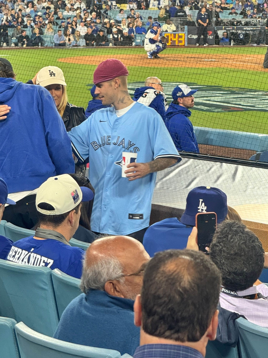 Didn’t see Will in the stands but there were several glimpses of Simu Liu and also Justin and Hailey Bieber. JB was wearing a Shane Bieber jersey. Hailey was wearing a blue pimple patch.