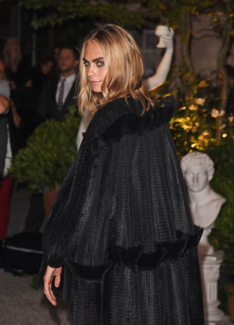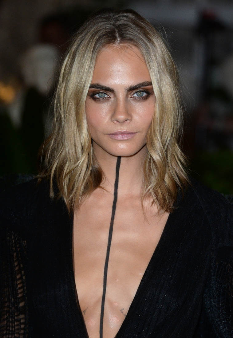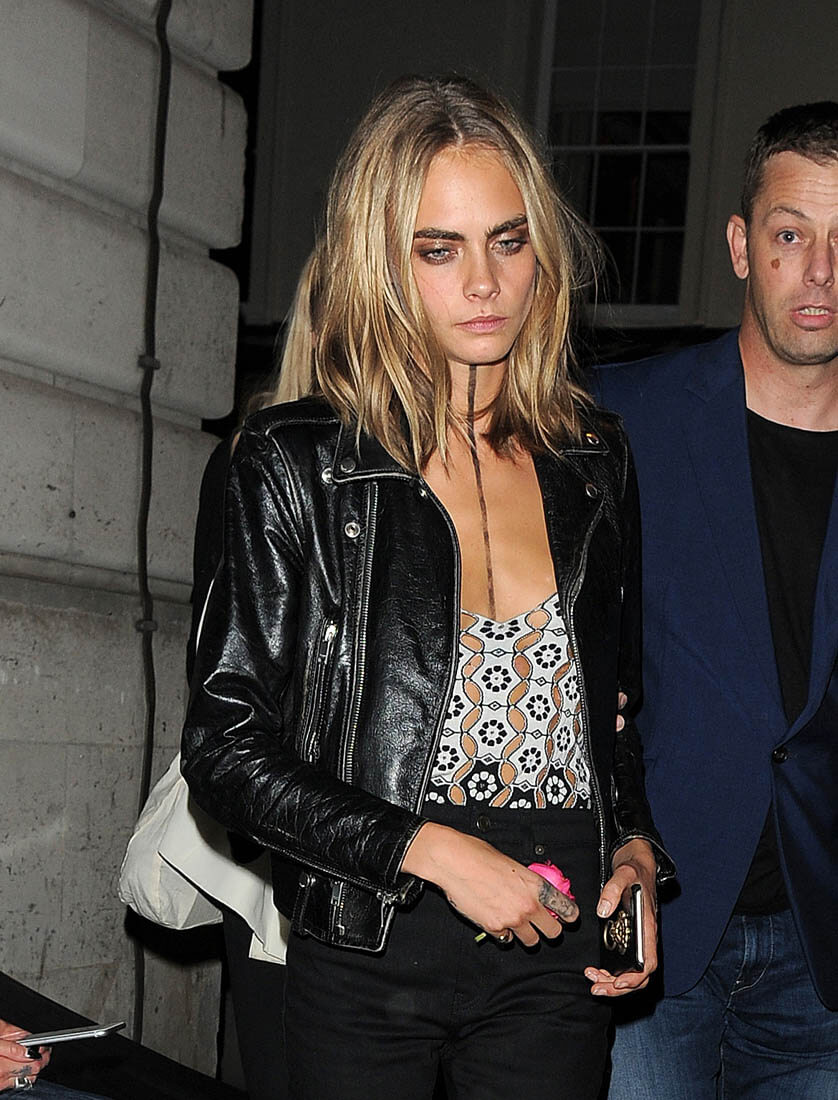 It’s fashion week in London. Yesterday was the Burberry show. And Cara Delevingne showed up in a wonderfully dramatic black dress with a cloaked back that I wish I could afford. Still, that wasn’t the highlight of her look. The highlight of her look is what appears to be a black line painted from under her chin, down her chest, all the way to her navel. Some are wondering if it’s a permanent tattoo or whether or not it’s a new trend in accessorising temporarily applied.