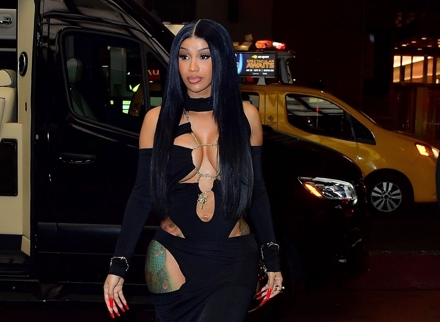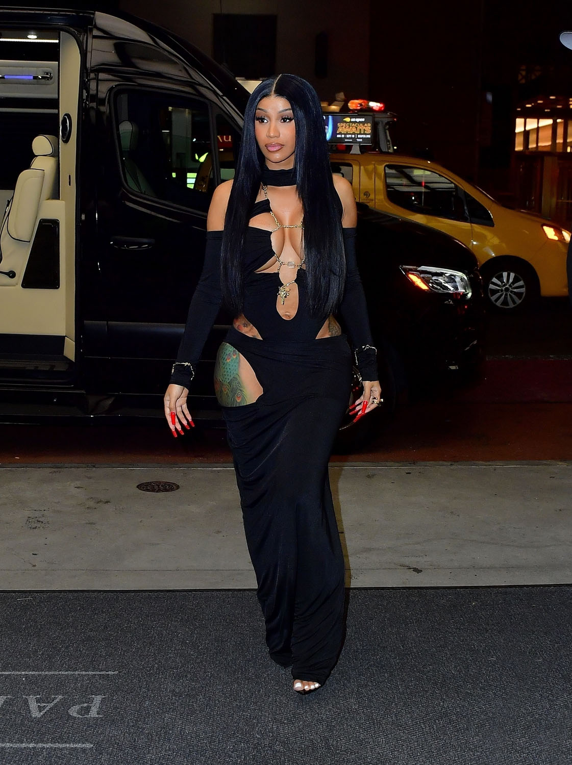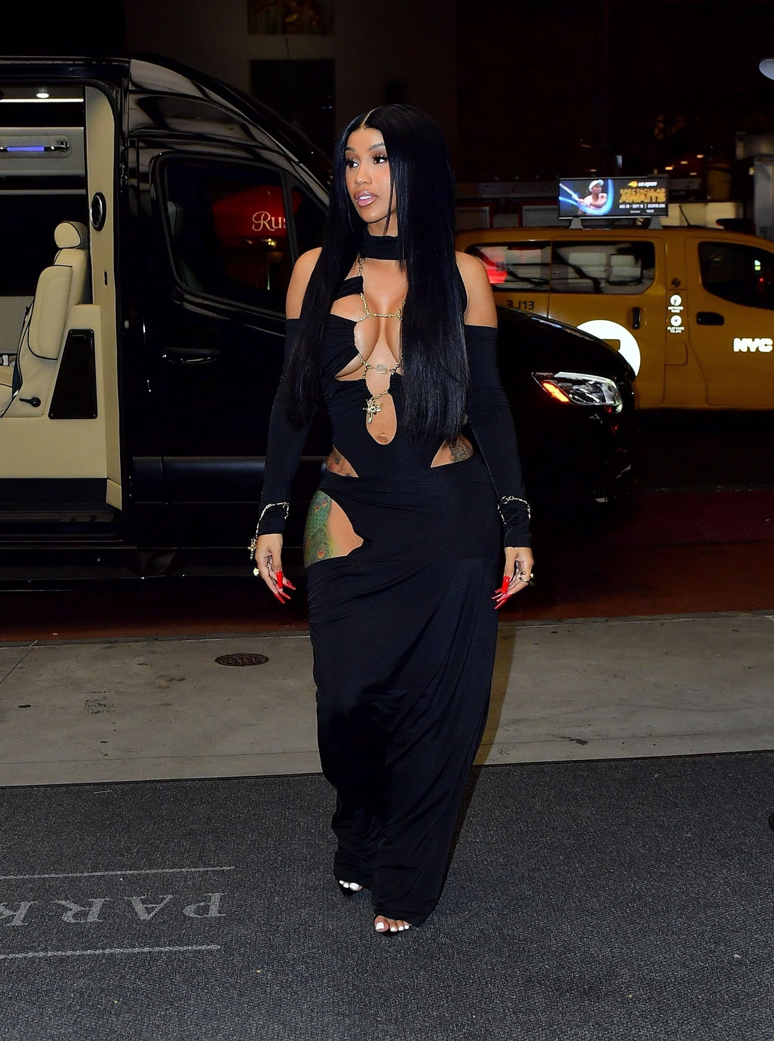 Here’s Cardi stepping out in New York last night making sure we all get fresh photos to go along with the “Bongos”. I really like her in this dress, with the high collar, the big cutout on only one side and both shoulders open with chains holding together the middle. “Bitch, I look like money” is what she says at one point in the song. That’s the whole look.