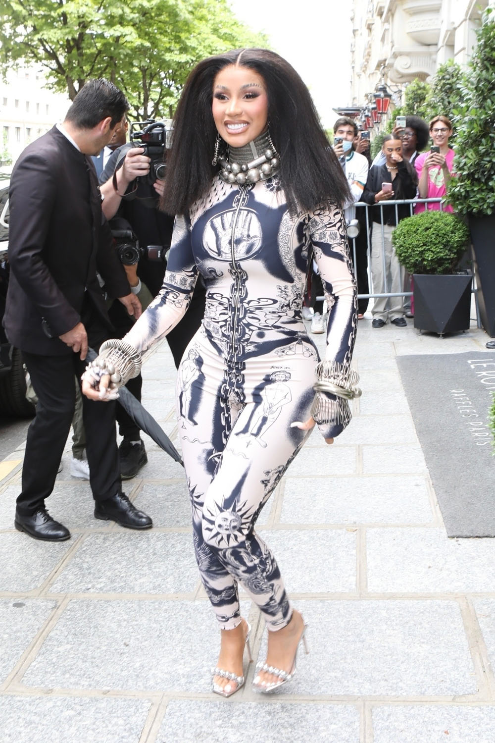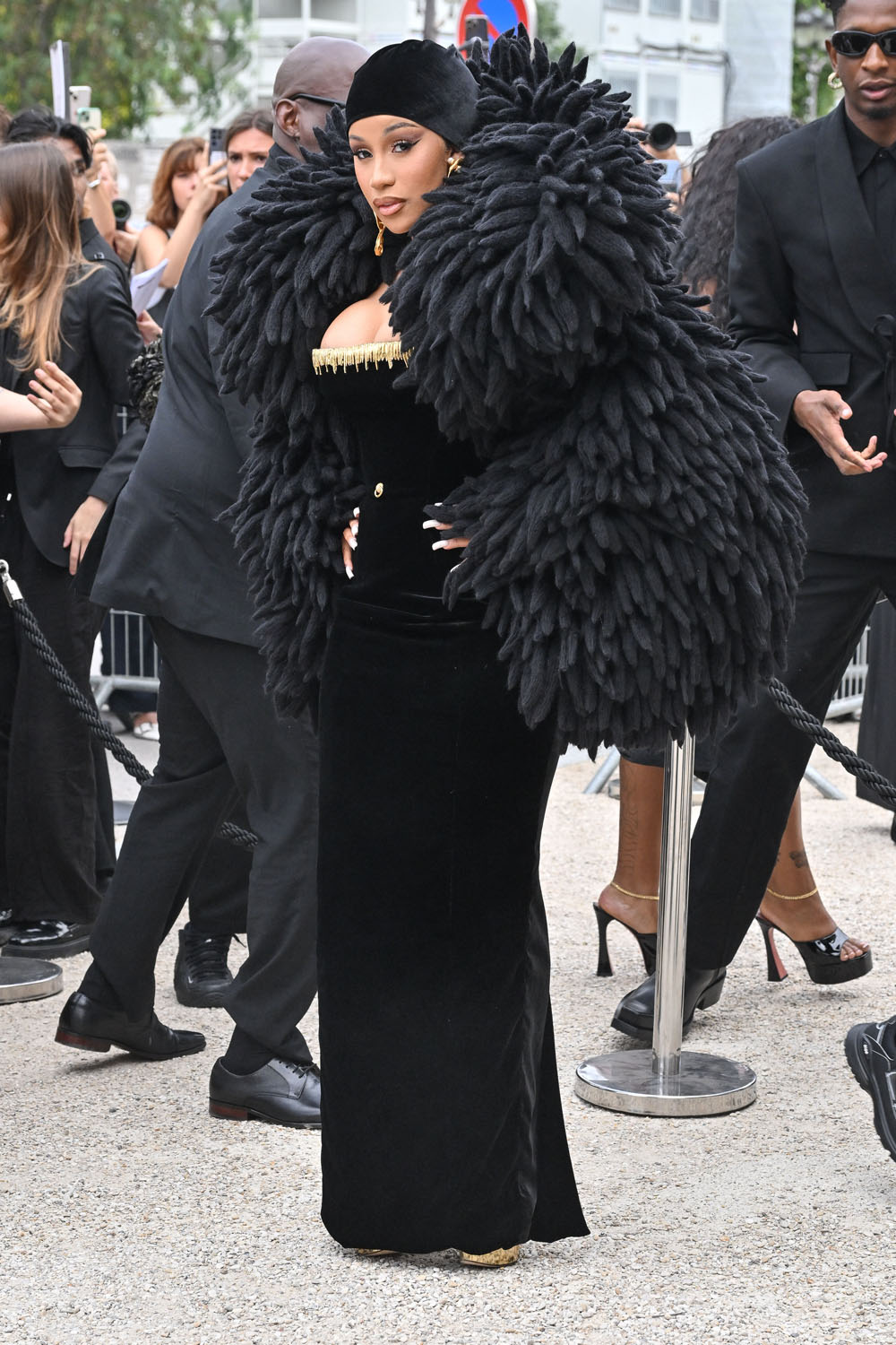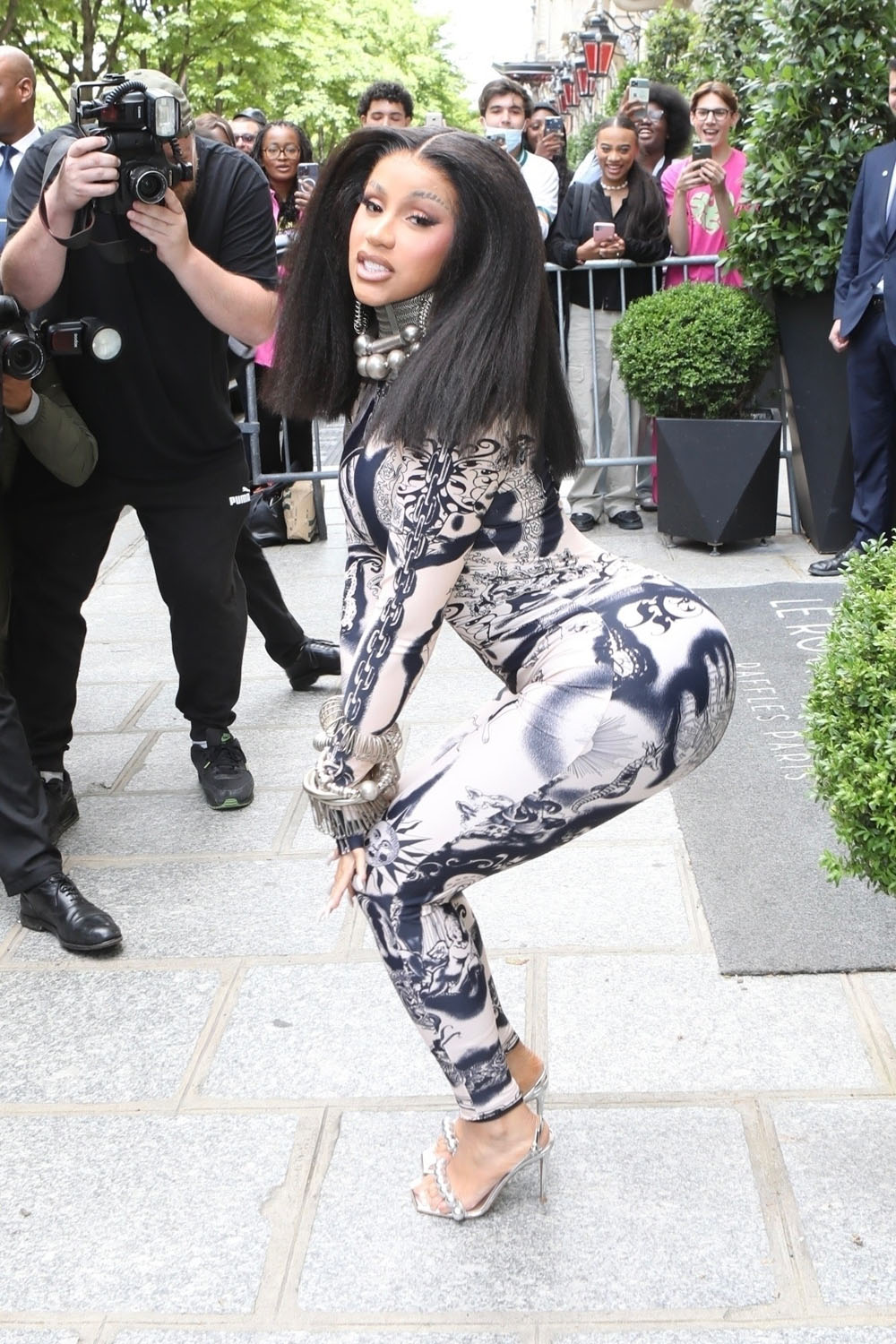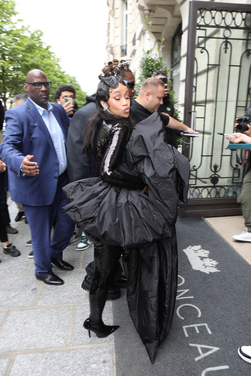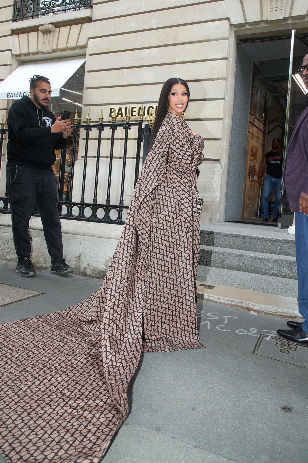 Cardi has taken over from Celine, swanning out of the hotel serving some stupidly good looks but the key to this isn’t just the clothes, it's the performance. It’s the performance of personality. Check her out in this bodysuit with the matching cape with the train, like royalty: