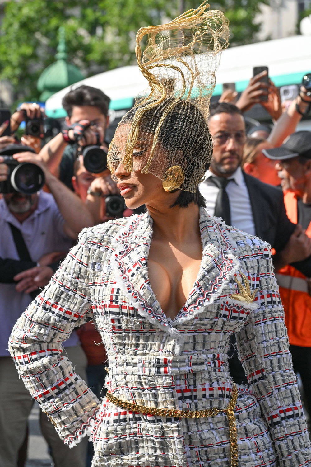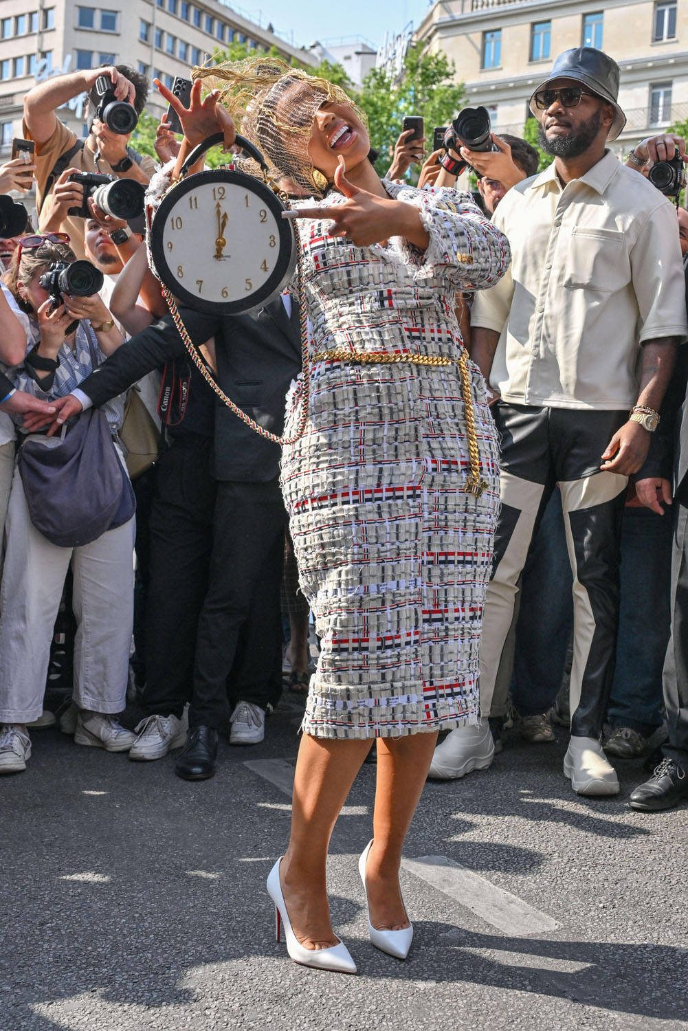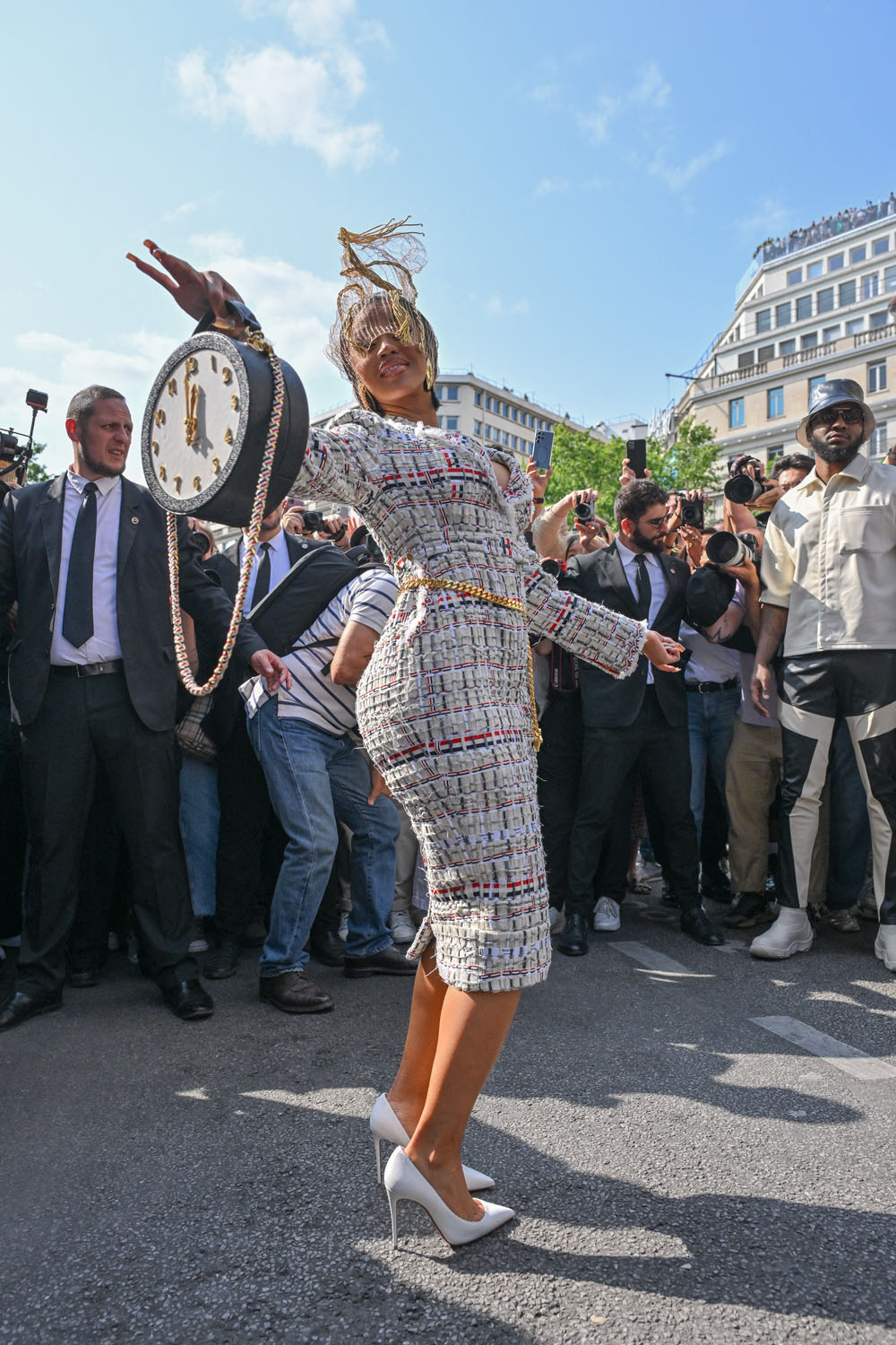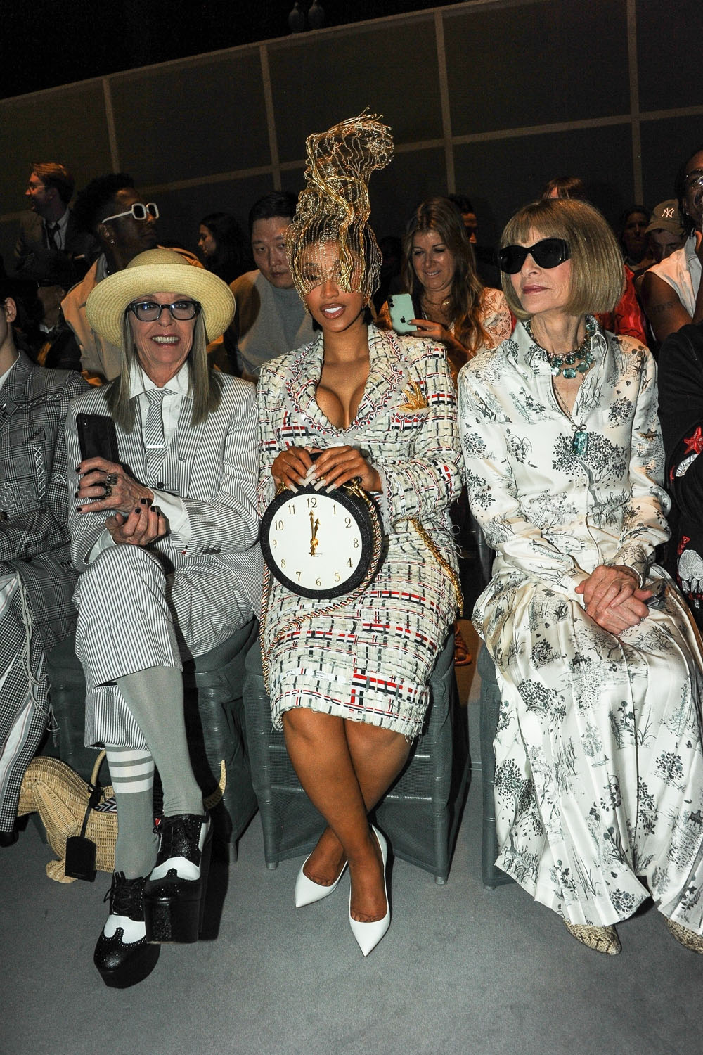 It was an entirely different aesthetic at Thom Browne who dressed Cardi in a headpiece and a tweed set that fit her perfectly and an adorable clock purse.