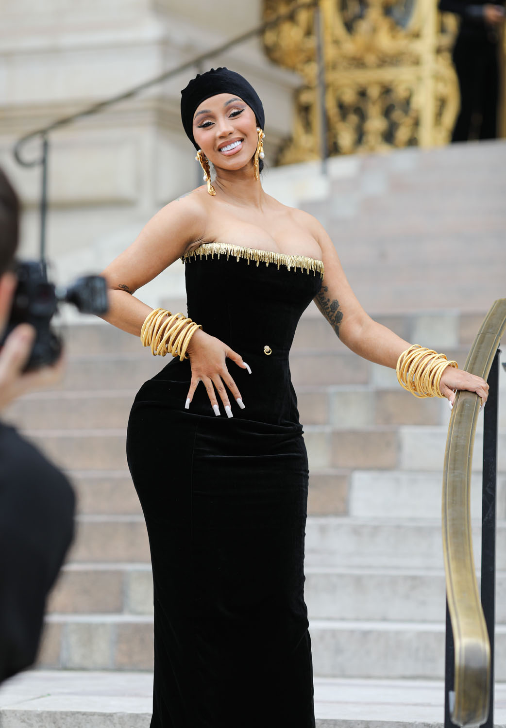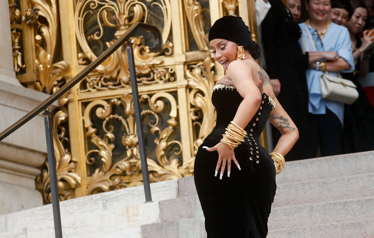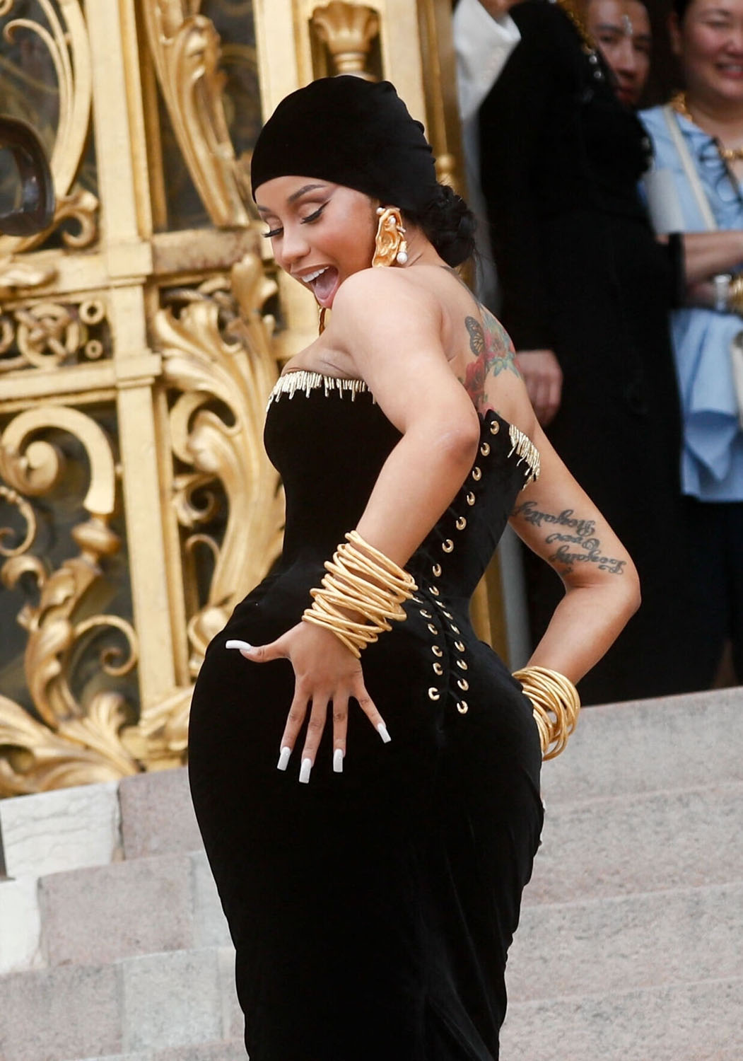 The ass was also on display when Cardi went to Schiaparelli in an exquisite corseted dress that she wore with a velvet durag and a dramatic stole that she took off later.