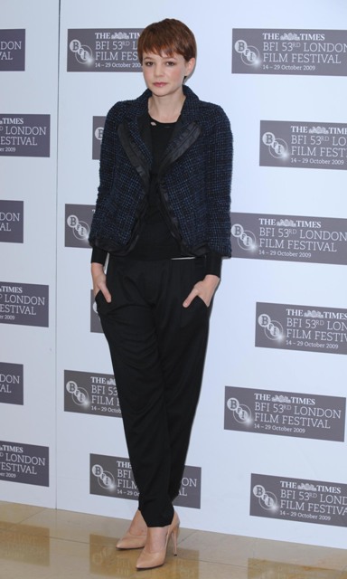 This is Carey today with co-star Dominic Cooper who is getting increasingly smarmier and Nick Hornby who wrote the screenplay promoting the film in London. And she’s stylish too, non? Thank you for not trying to look like everyone else. LOVE HER PANTS.