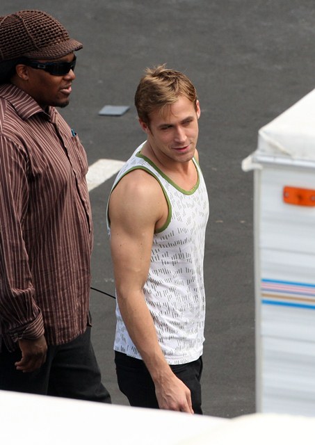 Carey Mulligan and Ryan Gosling on the set of Drive today in LA.