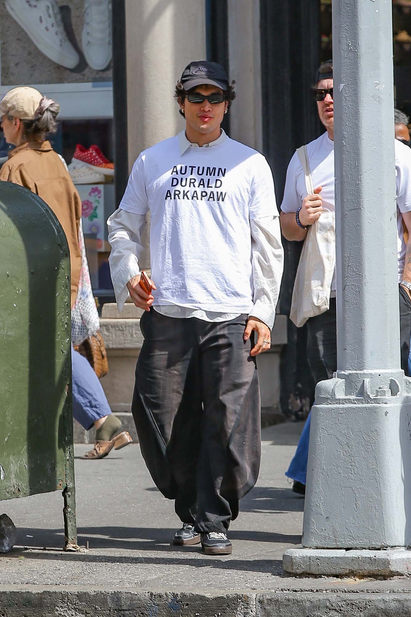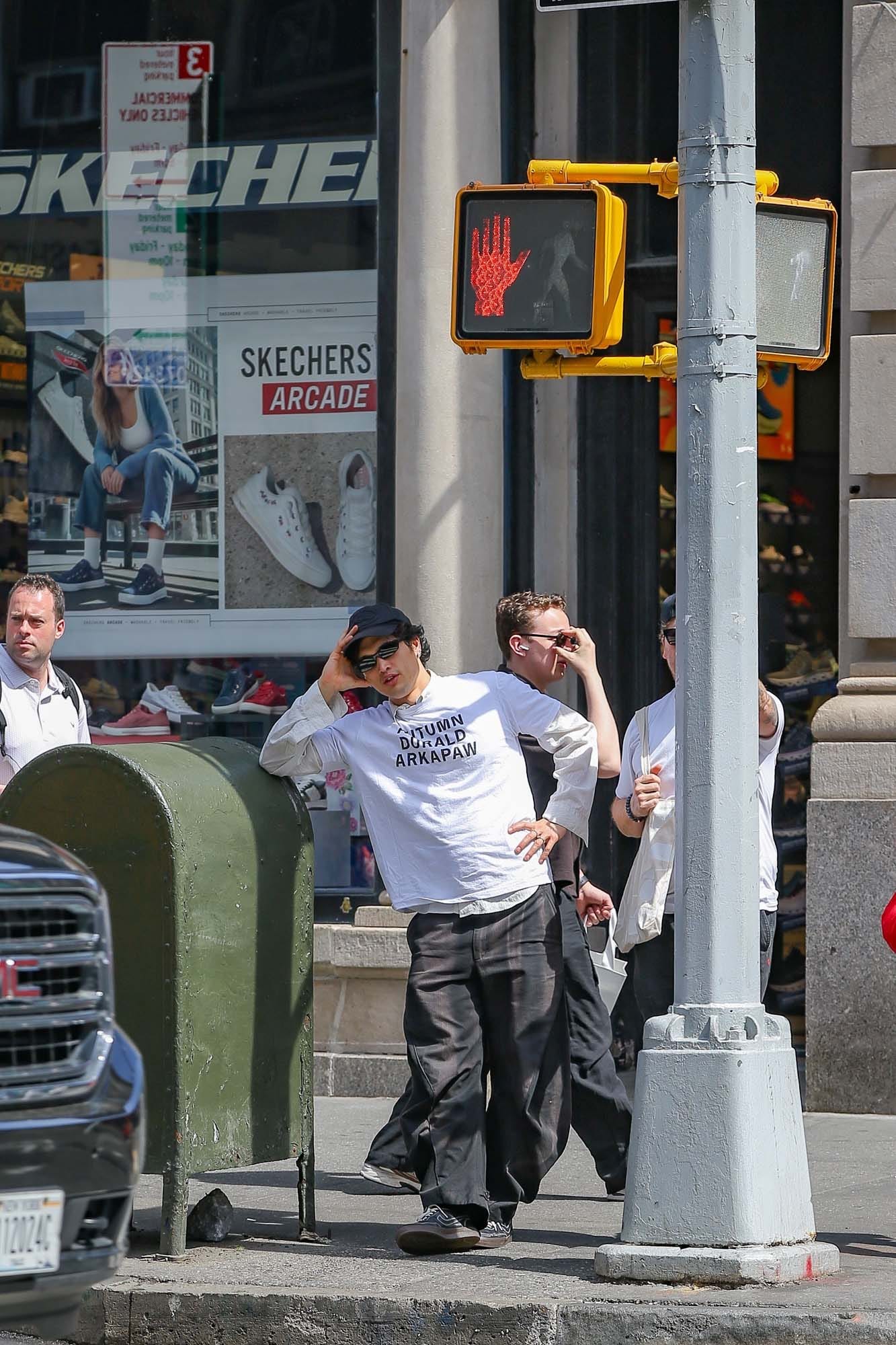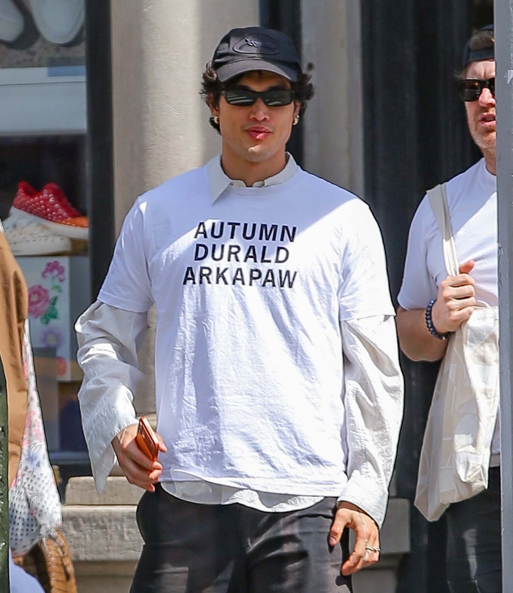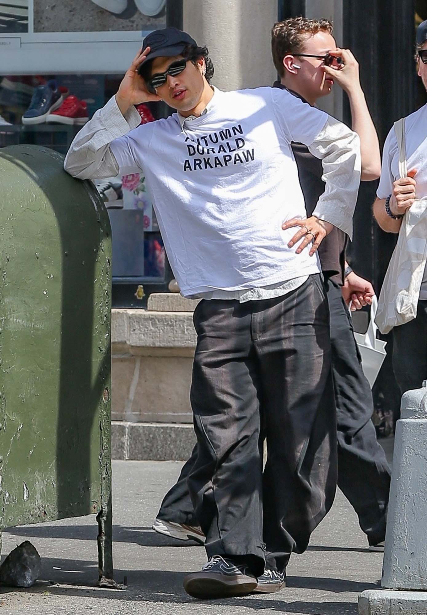 Charles Melton, on the other hand, DID try with some sort of “sweatshirt over a suit” situation that I am not into at all. I am, however, super into Charles Melton walking around New York earlier in the day in a shirt that reads “Autumn Durald Arkapaw”.