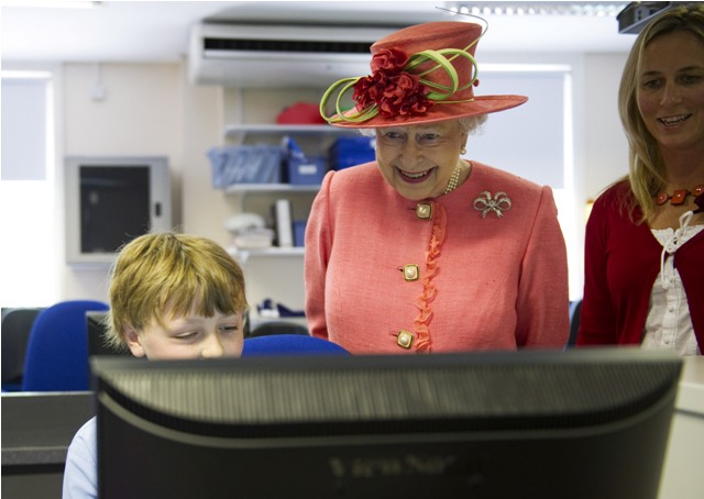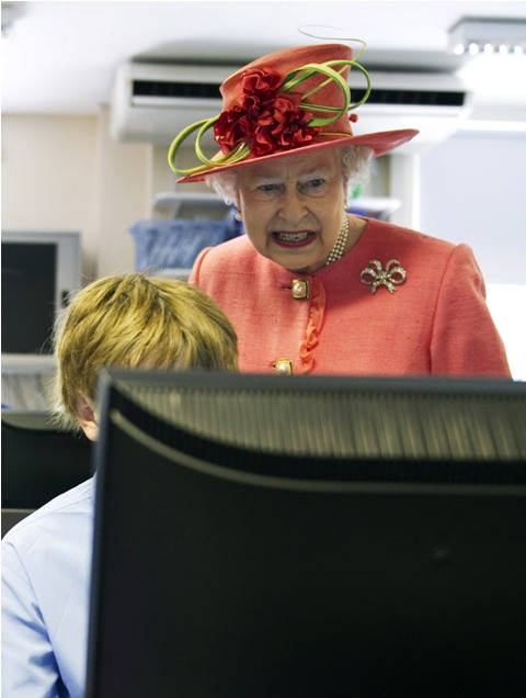 Anyway Her Majesty and her gloves visited a school today in Windsor. She watched some kids perform a ballet demonstration and a scene from the summer show. She also dropped in on the IT department. Imagine that kid for the rest of his life can tell the story of how he showed the Queen a video on YouTube. What would happen if he went click happy on the wrong link? They say that the Queen has a signal for when she wants to stop talking to someone. I can’t remember all the little codes that they listed. I’m sure one of you know-it-alls will send me a guidebook in the next 5 minutes. My point though is that while I don’t think there would be specific code signal for “tell them to turn off this dirty video”, there MUST be one for, like, uncomfortable, inappropriate occasions when the Queen has been exposed to something super offside and kinky.