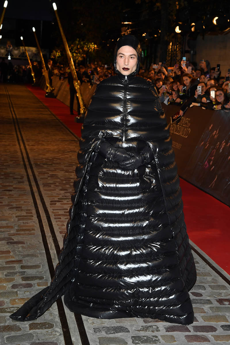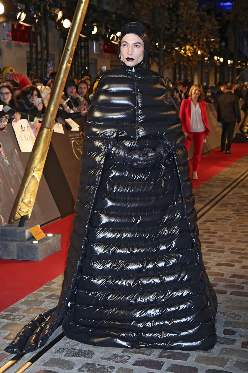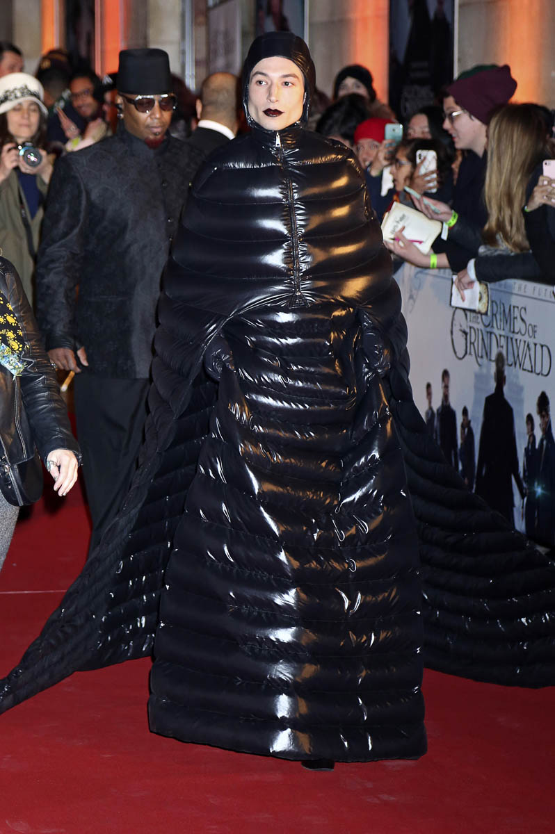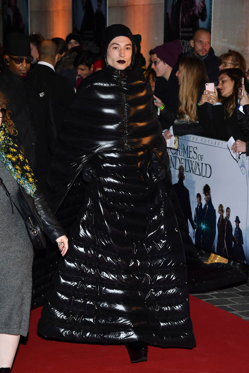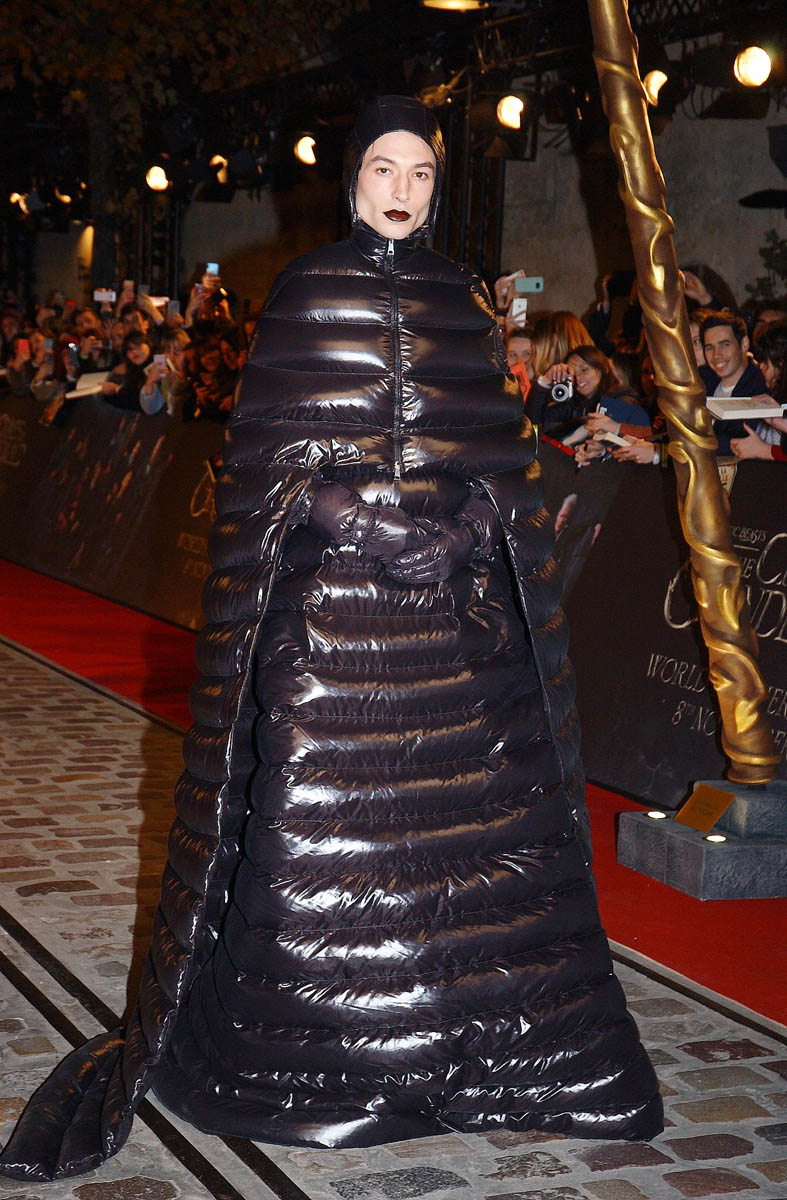 Here’s Ezra Miller in Moncler at the Fantastic Beasts: The Crimes of Grindelwald premiere in Paris last night. It’s AMAZING. It’s a winter puffer cosplaying Darth Vader. And he COMMITS. Of course he does. You don’t choose an outfit like this without intending to stunt. This is a stunt. This is also a message (it’s not, really, but I wish it was) to Jared Leto to go f-ck himself. Because, usually, it’s Jared Leto doing the most on the red carpet and Ezra Miller came to say that he’s here to show that Jared’s previous efforts have been child’s play.