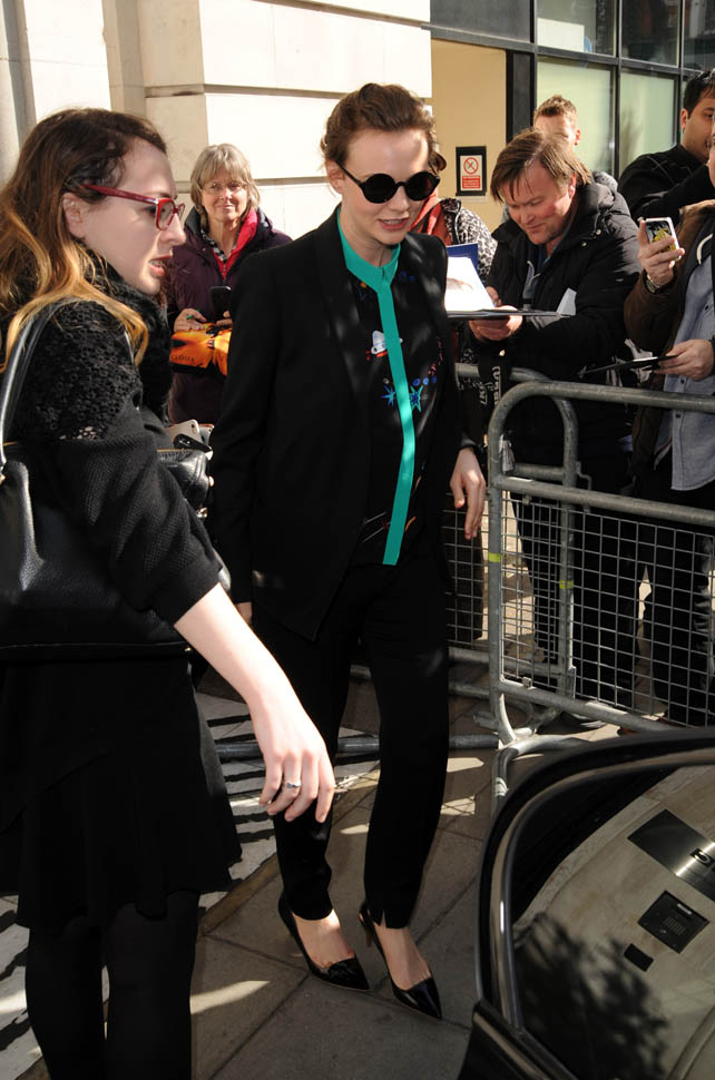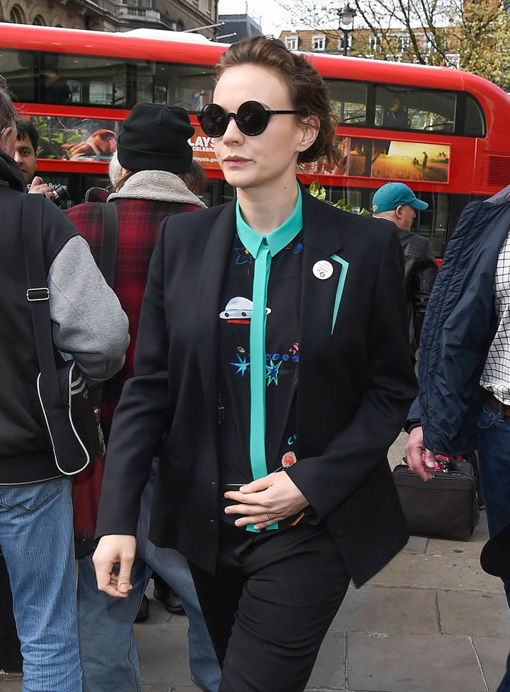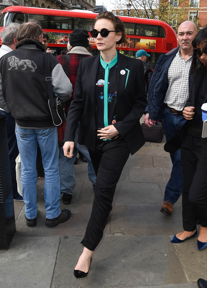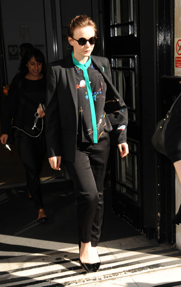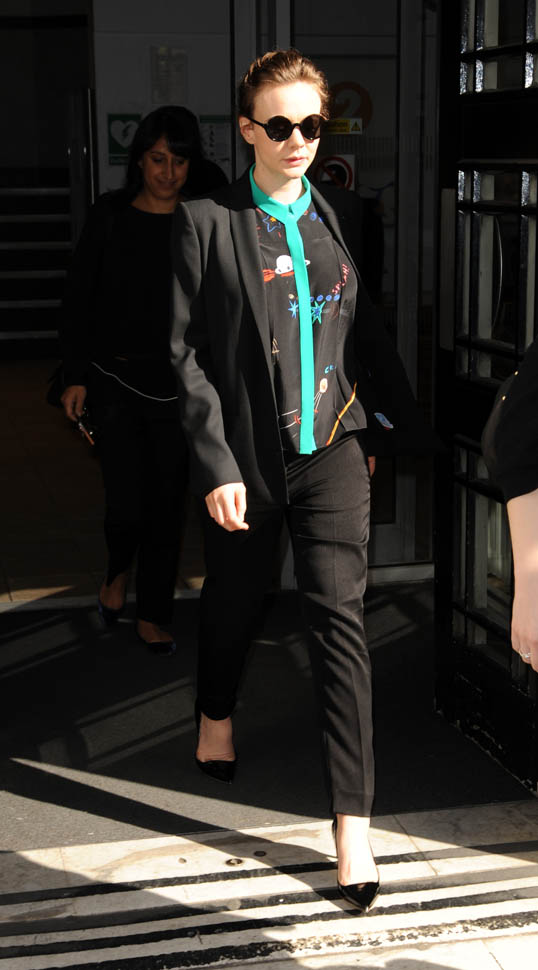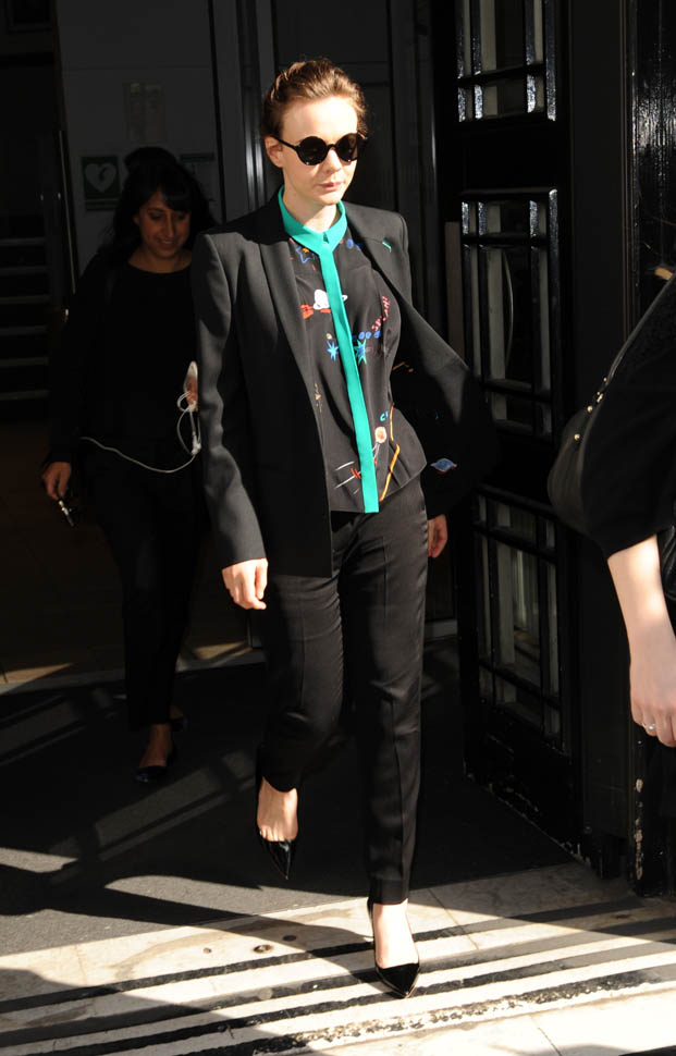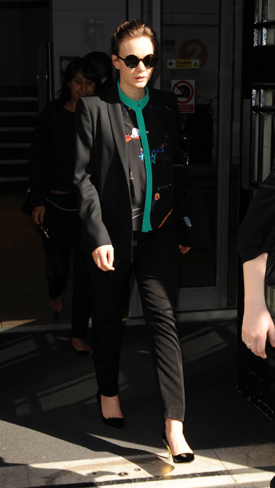 I was kinda bummed out by Carey Mulligan’s dress choice at the Far From the Madding Crowd premiere the other day. But holy sh-t, check her out today in London. That shirt. The green trim. Coordinated with the trim on the blazer. I need this.