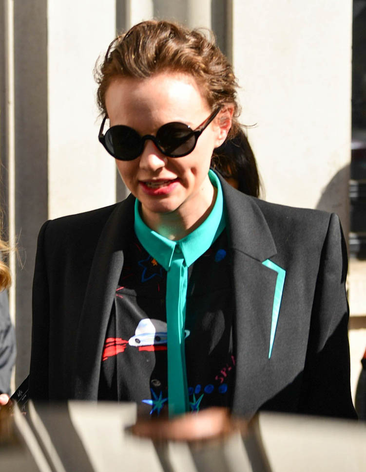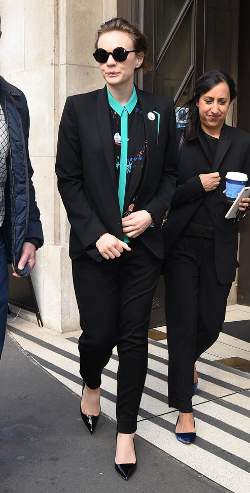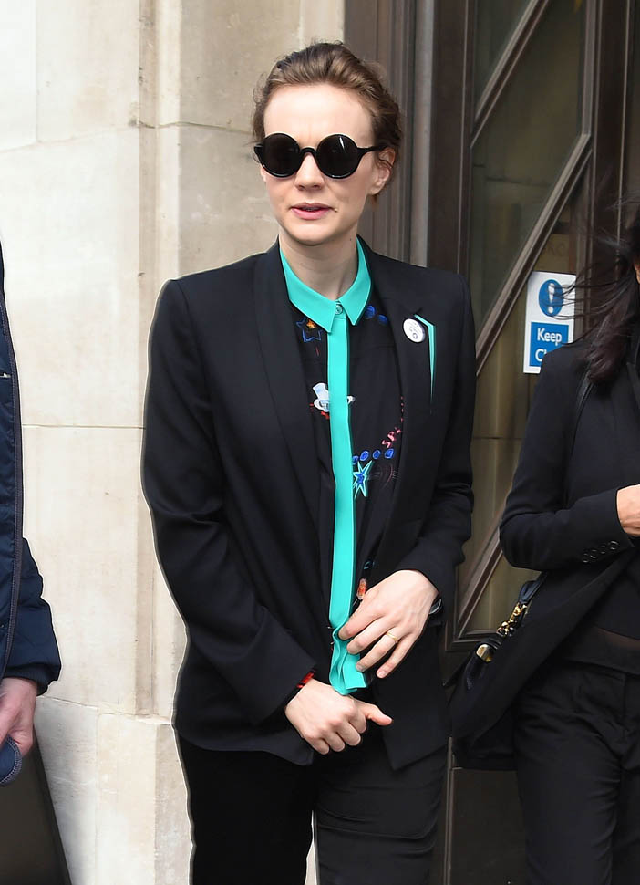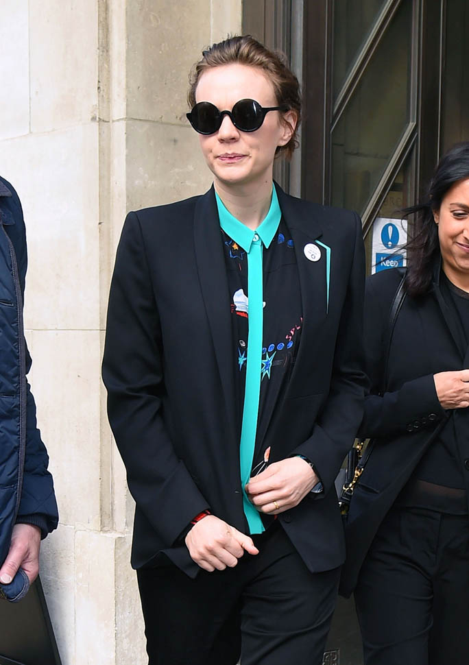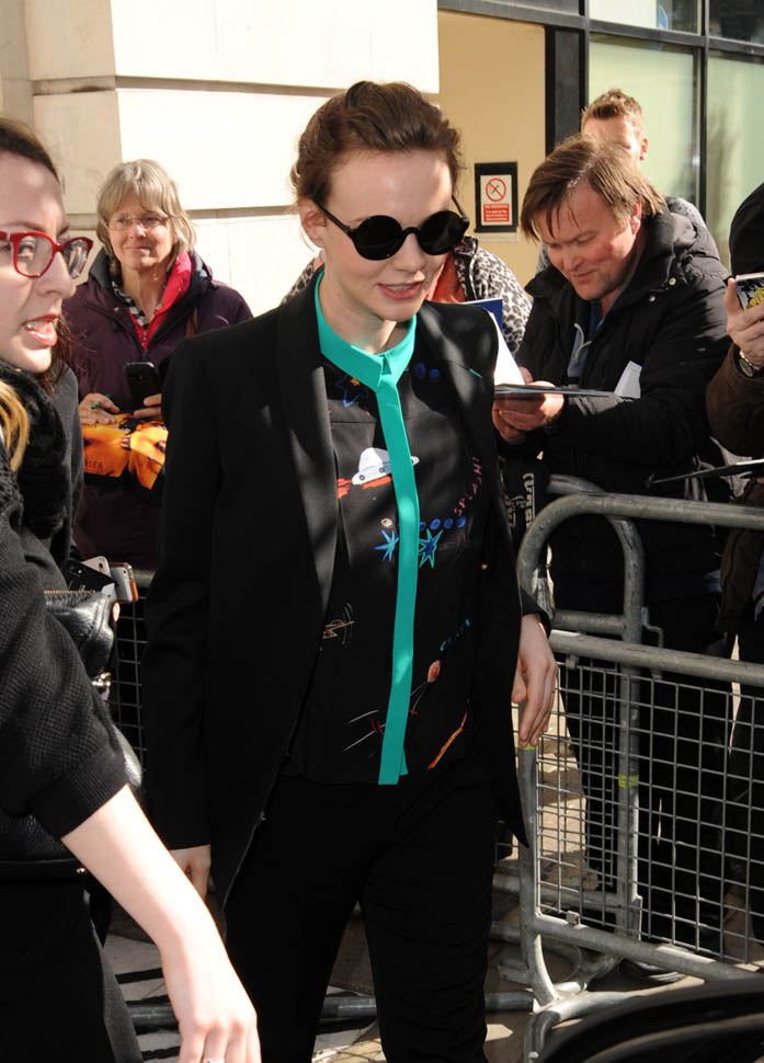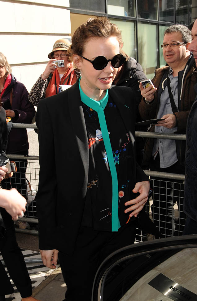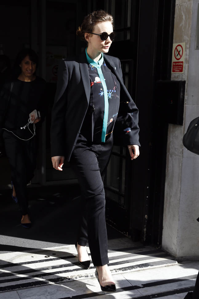 I was kinda bummed out by Carey Mulligan’s dress choice at the Far From the Madding Crowd premiere the other day. But holy sh-t, check her out today in London. That shirt. The green trim. Coordinated with the trim on the blazer. I need this.