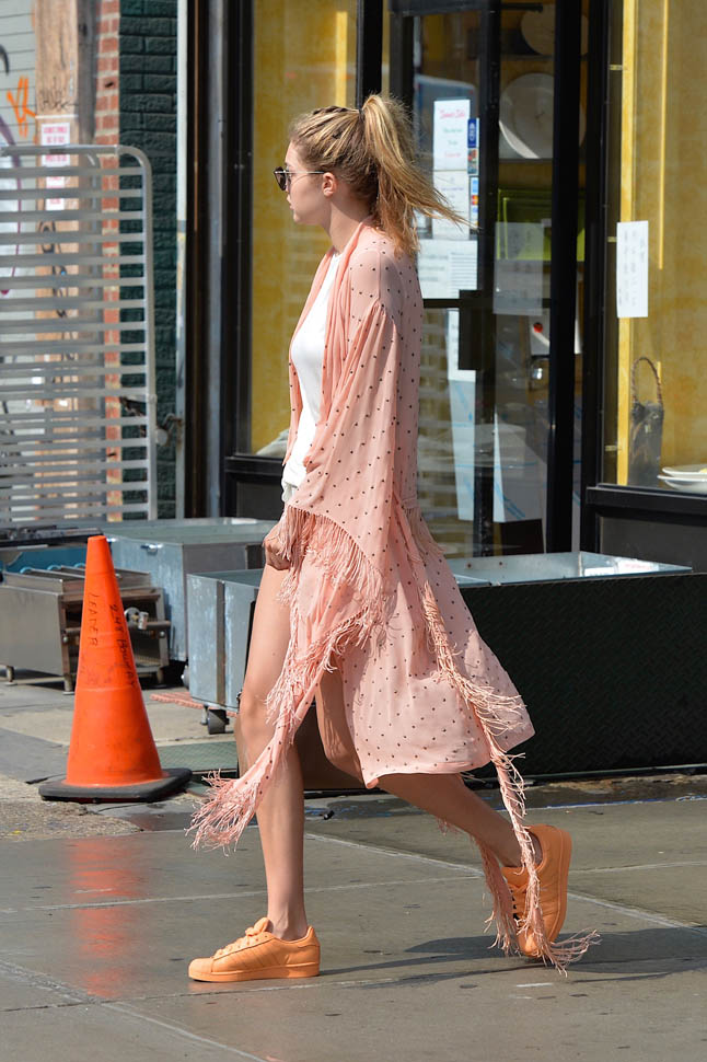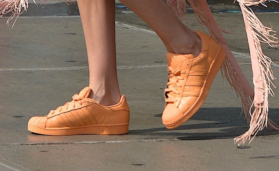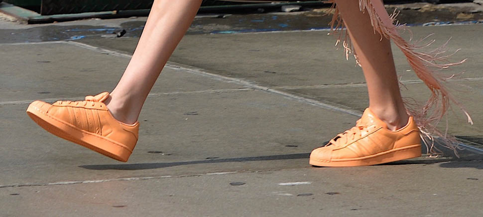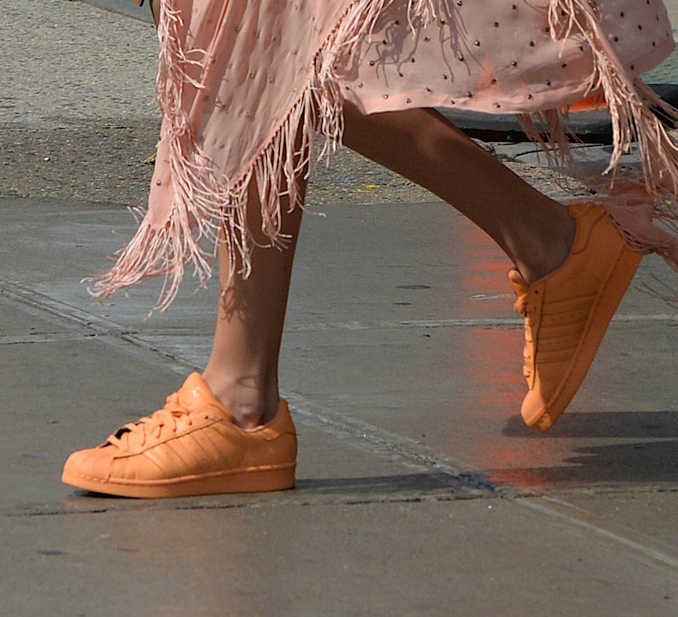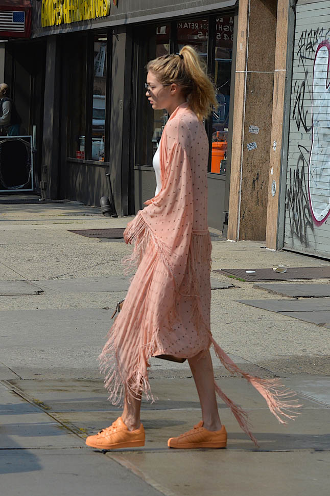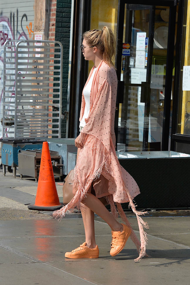 This is, like, really old school orange. She’s a model, she can get away with whatever mismatch she wants. But what happens when a regular person with regular length legs – ok, fine, short stubby legs – works these out? Because I think I really like them.