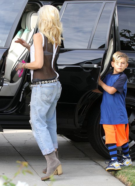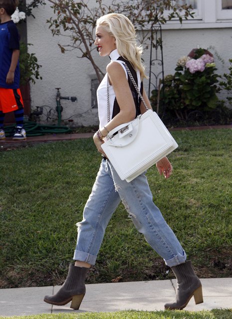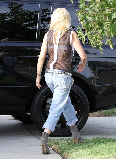 From the front I love this situation a lot. Especially on her with the boyfriend jeans and the lezzie boots. But that sh-t is unforgiving at the back. I mean, if you forget to sweat off even one piece of cheese on the treadmill, it’s right there, jiggling around in that back mesh that has been cut very generously. You see how the white part is made narrow, so as to flatter from the front? The downside is that the back is therefore that much wider – not a problem for Gwen Stefani whose 43 year old body is perfect, but definitely for those of us carrying summer + Thanksgiving + I-am-not-a-celebrity-I-don’t-care-that-much around our waists.