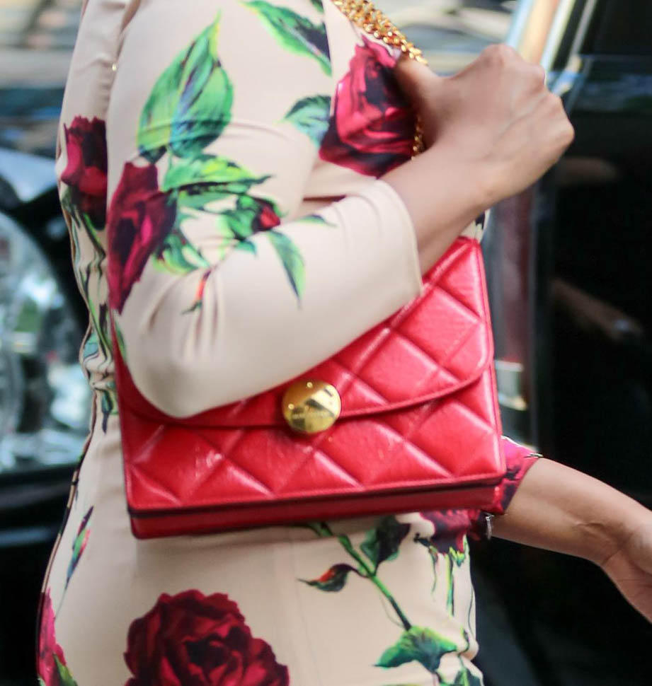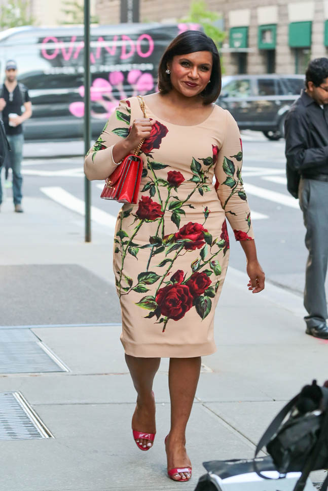 This is when red is most tolerable. It’s still the main event but it’s not all over the place. It’s in the print, a gorgeous print. And the bag. And it might be the best outfit Mindy Kaling has ever worn.