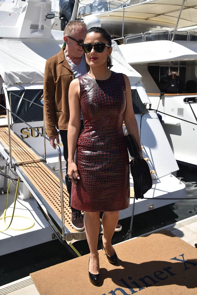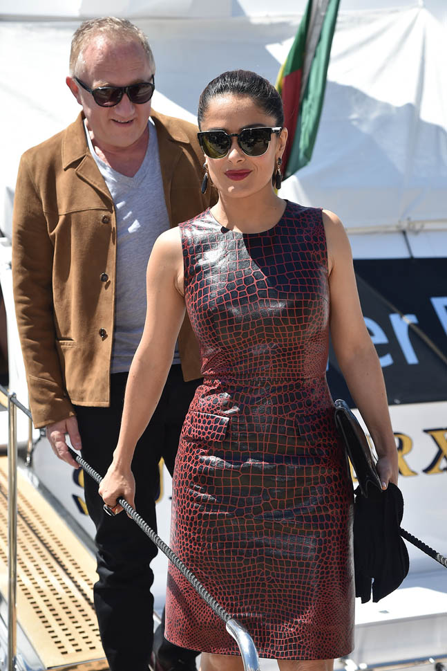 Salma Hayek in red leather, not unlike what was underneath Julianne Moore’s red velvet – click here for a refresher. And last night in a gown stitched in gold that was meant to look like grommets? I feel like it would have been effective if it was just the skirt that was patterned instead of the entire dress. Imagine the effect. All black up top and then cascading gold circles tiered and fluttering around on the bottom. Better non?