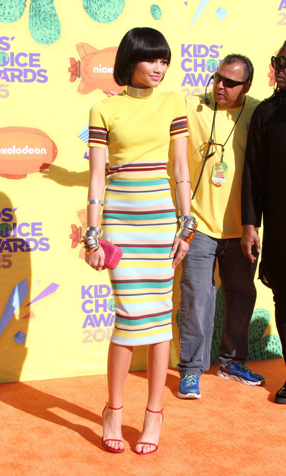 Am obsessed with her style. She has great instincts. The heavy-fringe 70s wig at Kids’ Choice on Saturday? On top of that gold choker that picked up the stripes in the outfit? Ariana Grande couldn’t do that.
