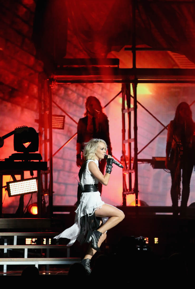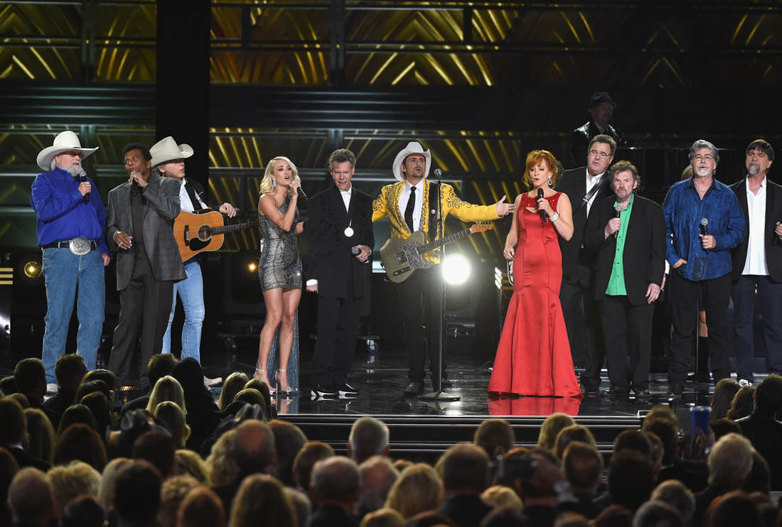 As for all of the outfit changes, because this is a thing now, how many times Carrie changes during the show, some of them were “inspired” by dresses worn at previous CMAs to celebrate the 50th anniversary so, I dunno, I guess she’s supposed to get a pass on the ugly ones. The thing is, um, I wouldn’t have known that the choices were “inspired” by the past. They look exactly like the tacky sh-t she always wears.