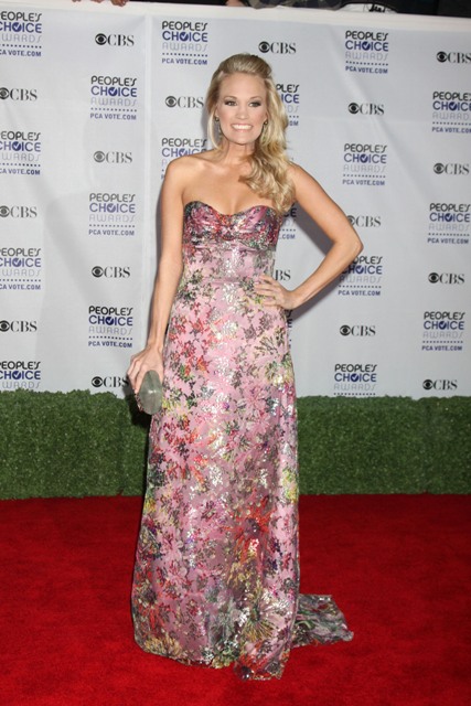 This is Carrie Underwood at the People’s Choice Awards last night arriving in some kind of bedazzler and then on stage in a low budge green tier pageant cast-off with…