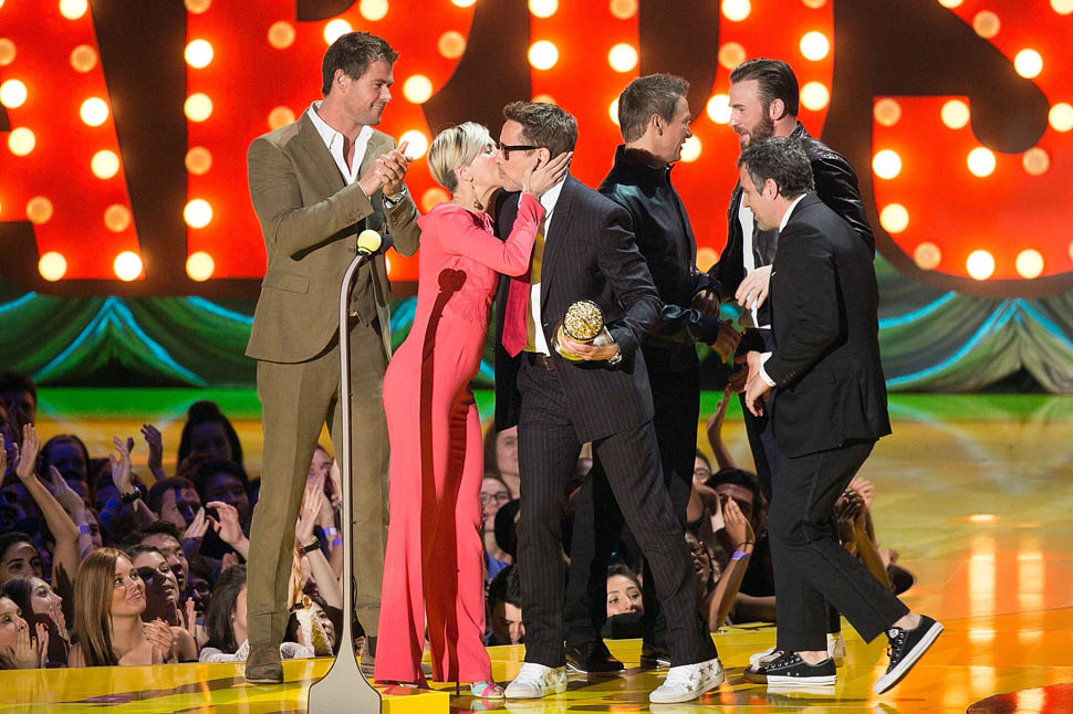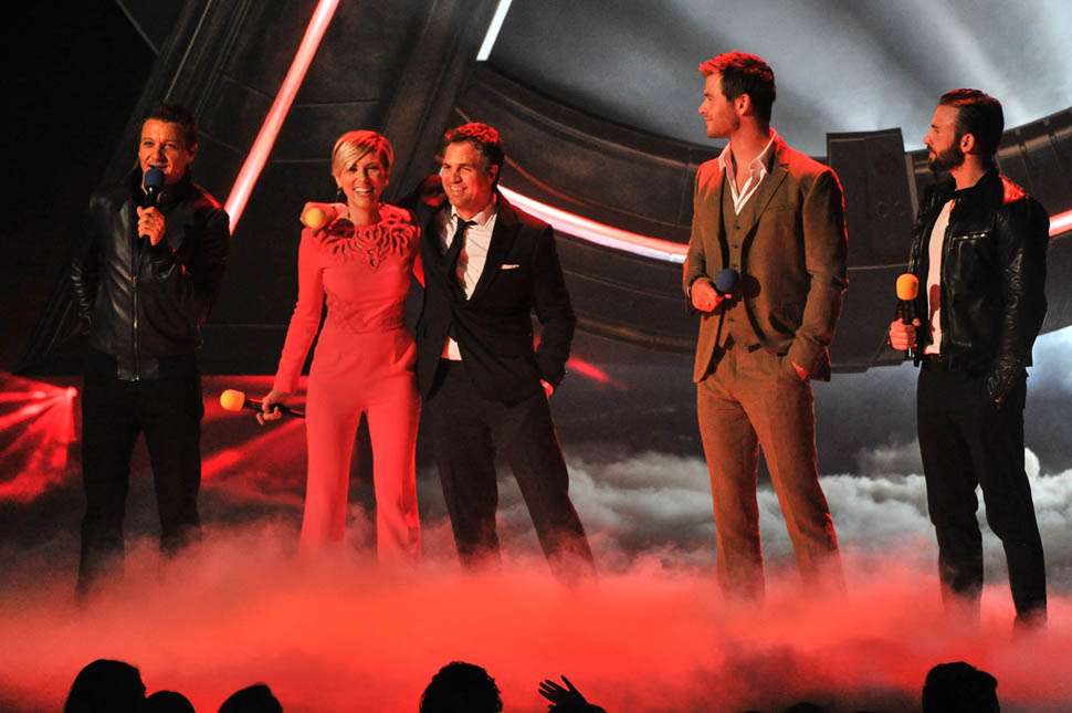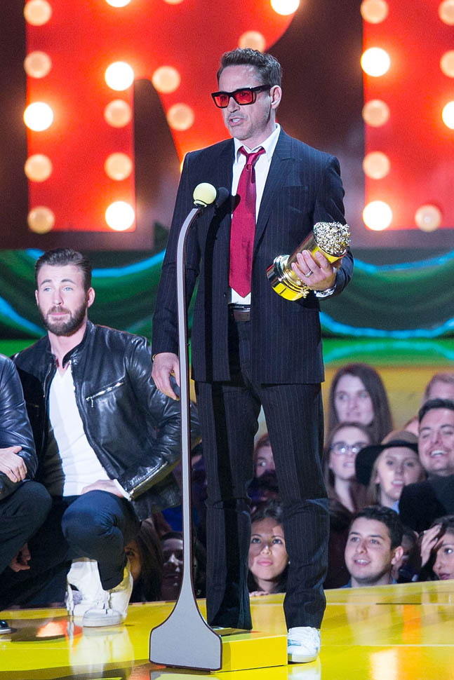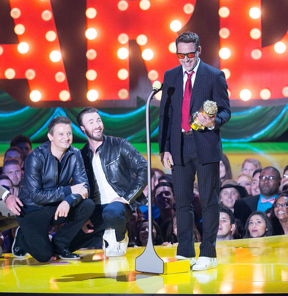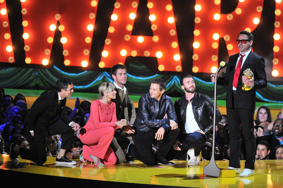 After spending all of Saturday together, the Avengers were all present in group formation again last night at MTV to present RDJ with the Generation Award and introduce a new clip from the movie in which Hulk and Iron Man beat the sh-t out of each other because Scarlet Witch has, evidently, taken over Hulk’s feelings.