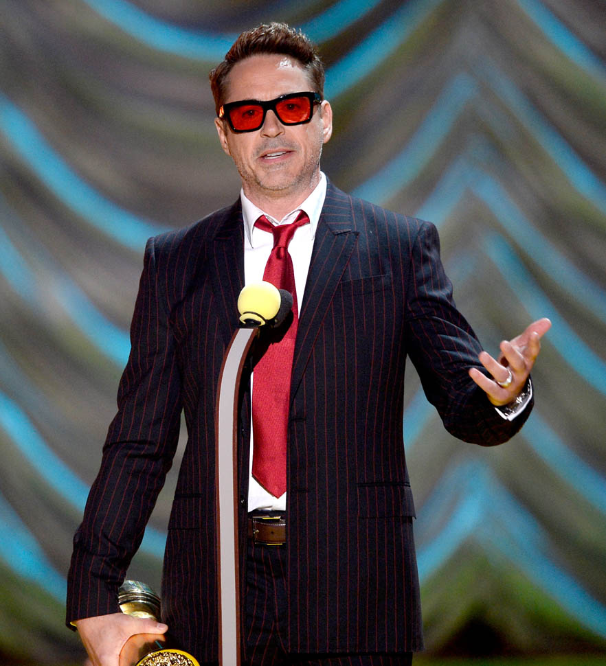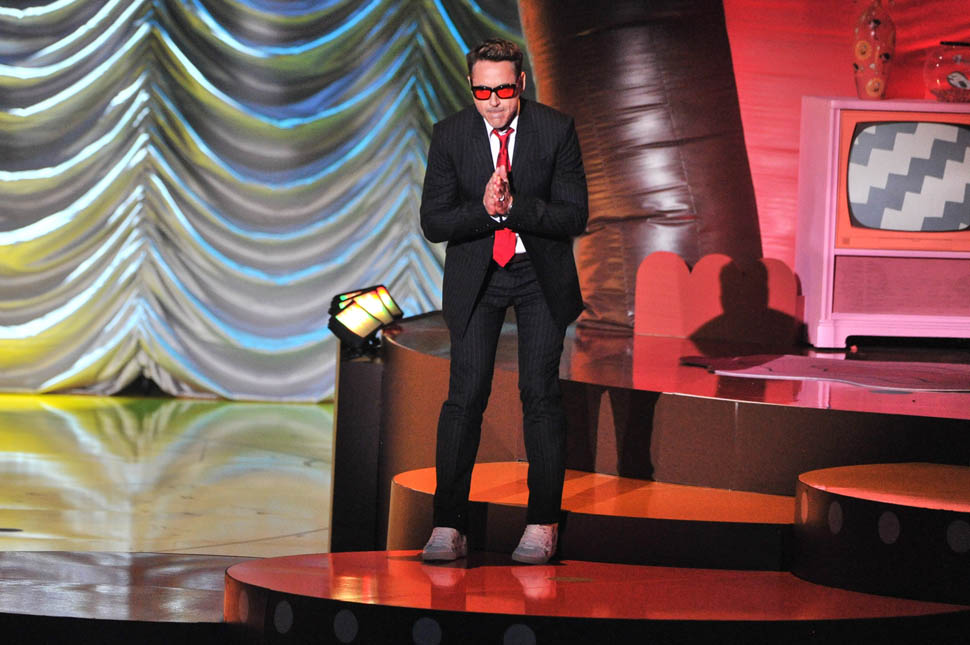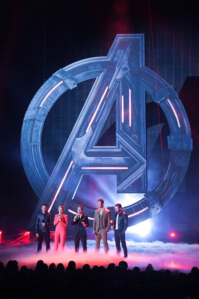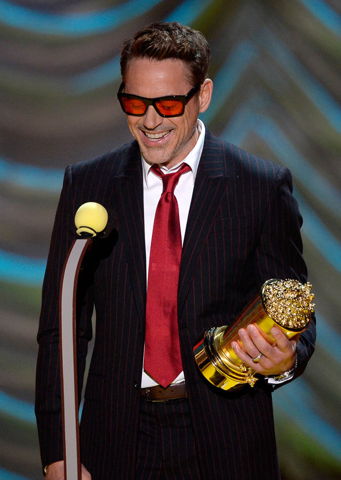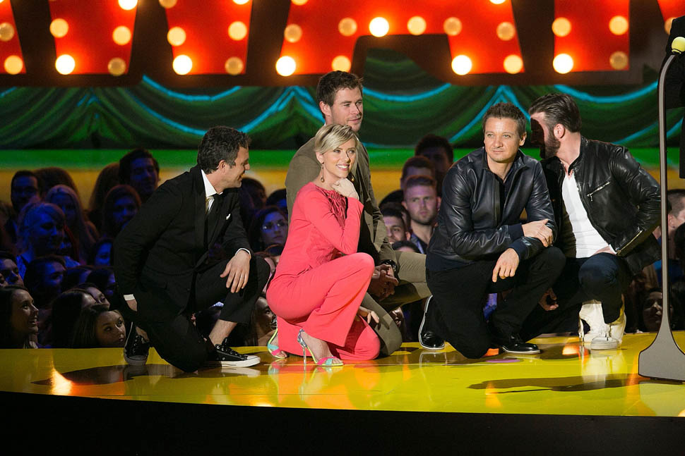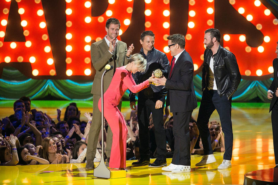 After spending all of Saturday together, the Avengers were all present in group formation again last night at MTV to present RDJ with the Generation Award and introduce a new clip from the movie in which Hulk and Iron Man beat the sh-t out of each other because Scarlet Witch has, evidently, taken over Hulk’s feelings.