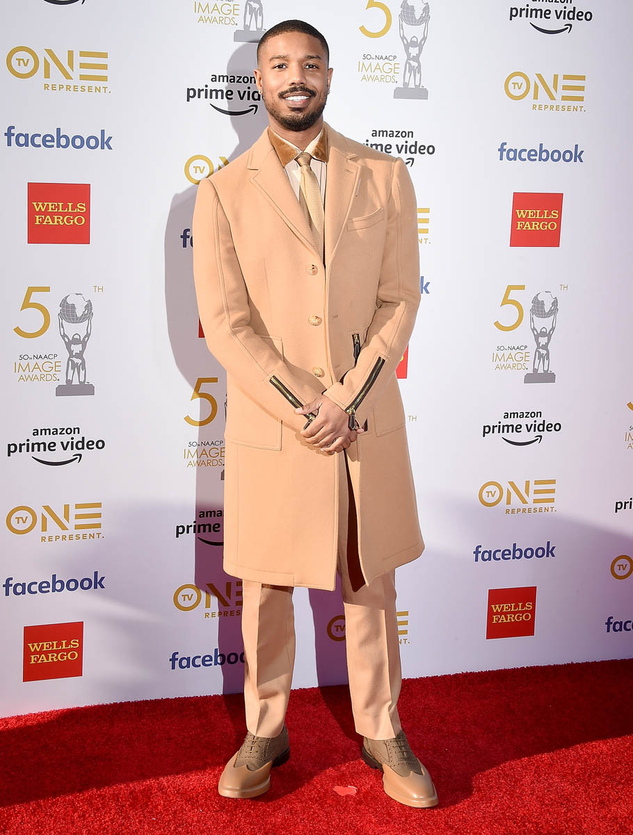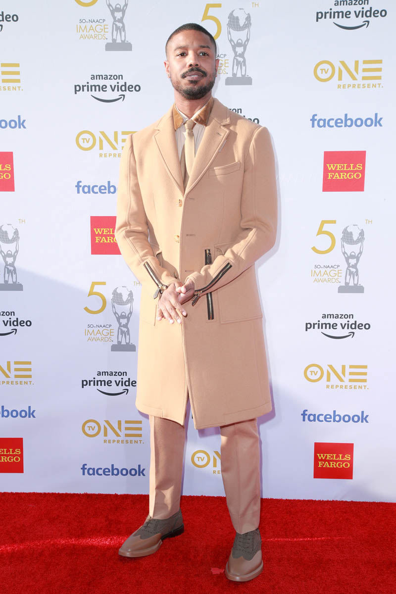 Black Panther was the big winner at the NAACP Image Awards this weekend winning Outstanding Motion Picture, Director for Ryan Coogler, Ensemble cast, Actor for Chadwick Boseman, Supporting Actor and Actress for Michael B Jordan and Danai Gurira, Breakthrough Performance for Letitia Wright, and several more. Looks like most if not all of the whole team was there to represent, along with the casts of black-ish and Beale Street and The Hate U Give and stars like Viola Davis, Thandie Newton, Lena Waithe, Vin Diesel, and John Legend – not to mention BEYONCÉ WAS THERE, so basically this was the most impressive red carpet we’ve seen since the Oscars, with many of the stars serving looks. MBJ, for me, takes it on the men’s side in head-to-toe camel. Look at the velvet detail on the collar! Let Kathleen enjoy this for a minute before I ruin it for her. Or maybe not.