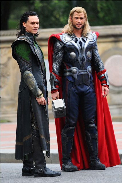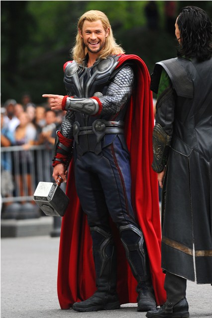 The cast of The Avengers took over Central Park today in New York. There’s Thor Chris Hemsworth walking around with his big hammer. Can you imagine how ridiculous that would feel? I know it’s movie making and suspension of disbelief but, you know, when he’s just standing around without context, it’s really just a dude who got dressed up with his big hammer.