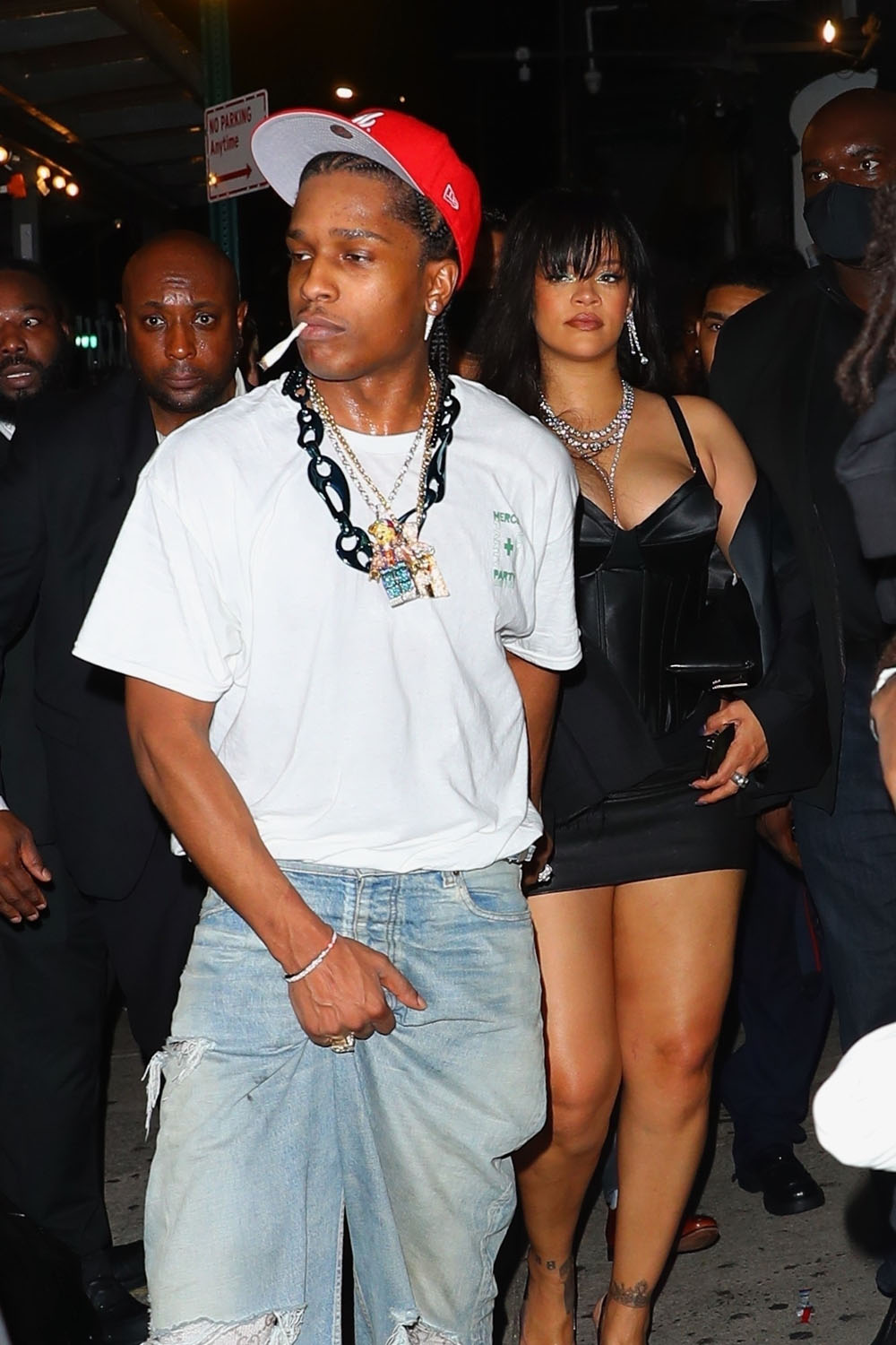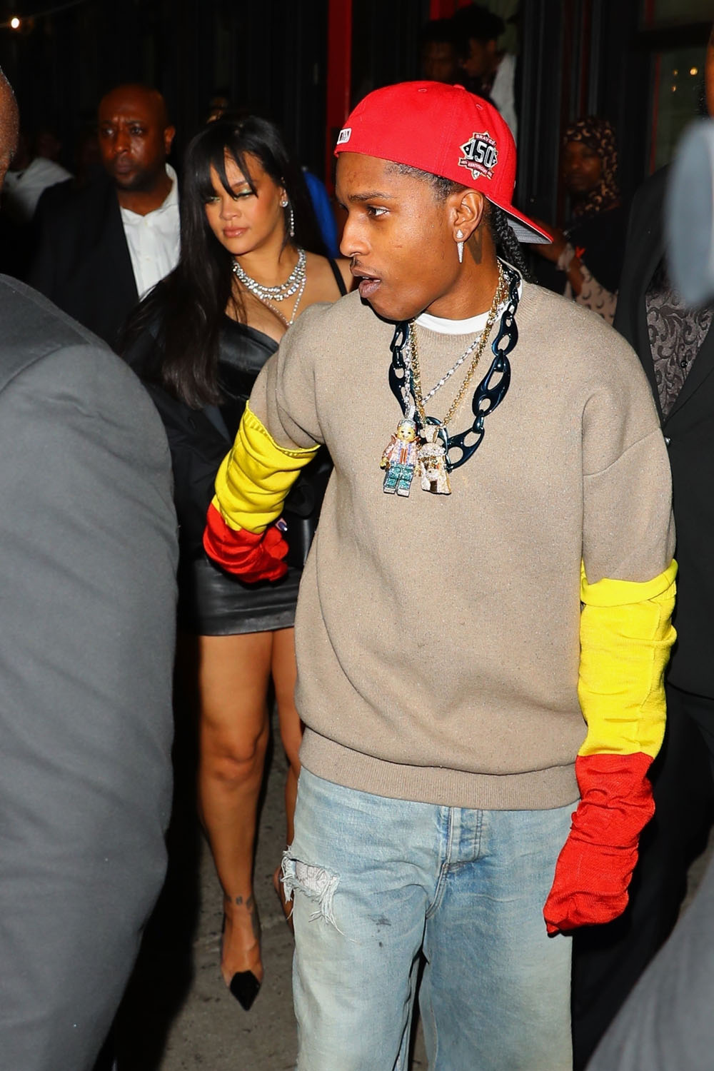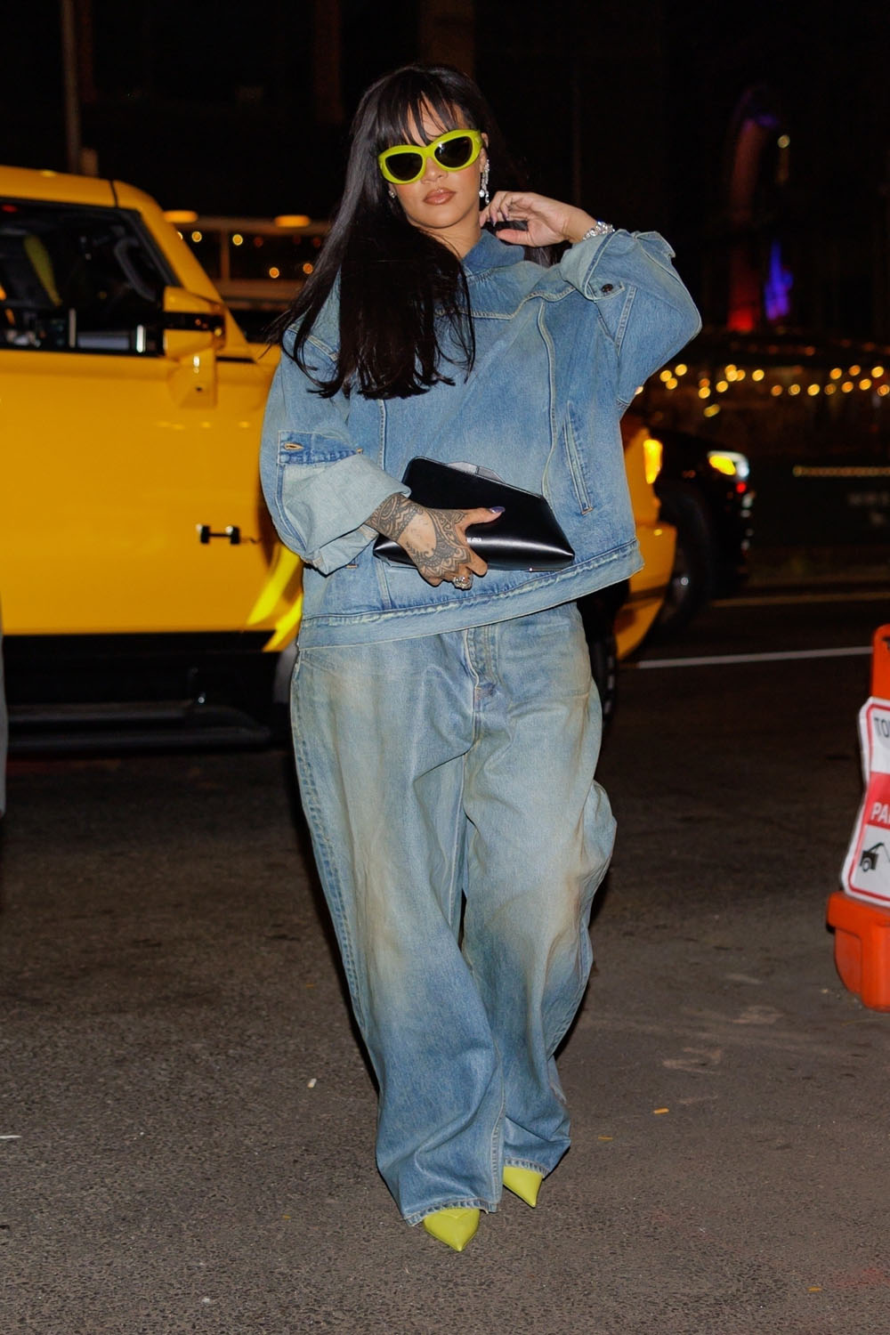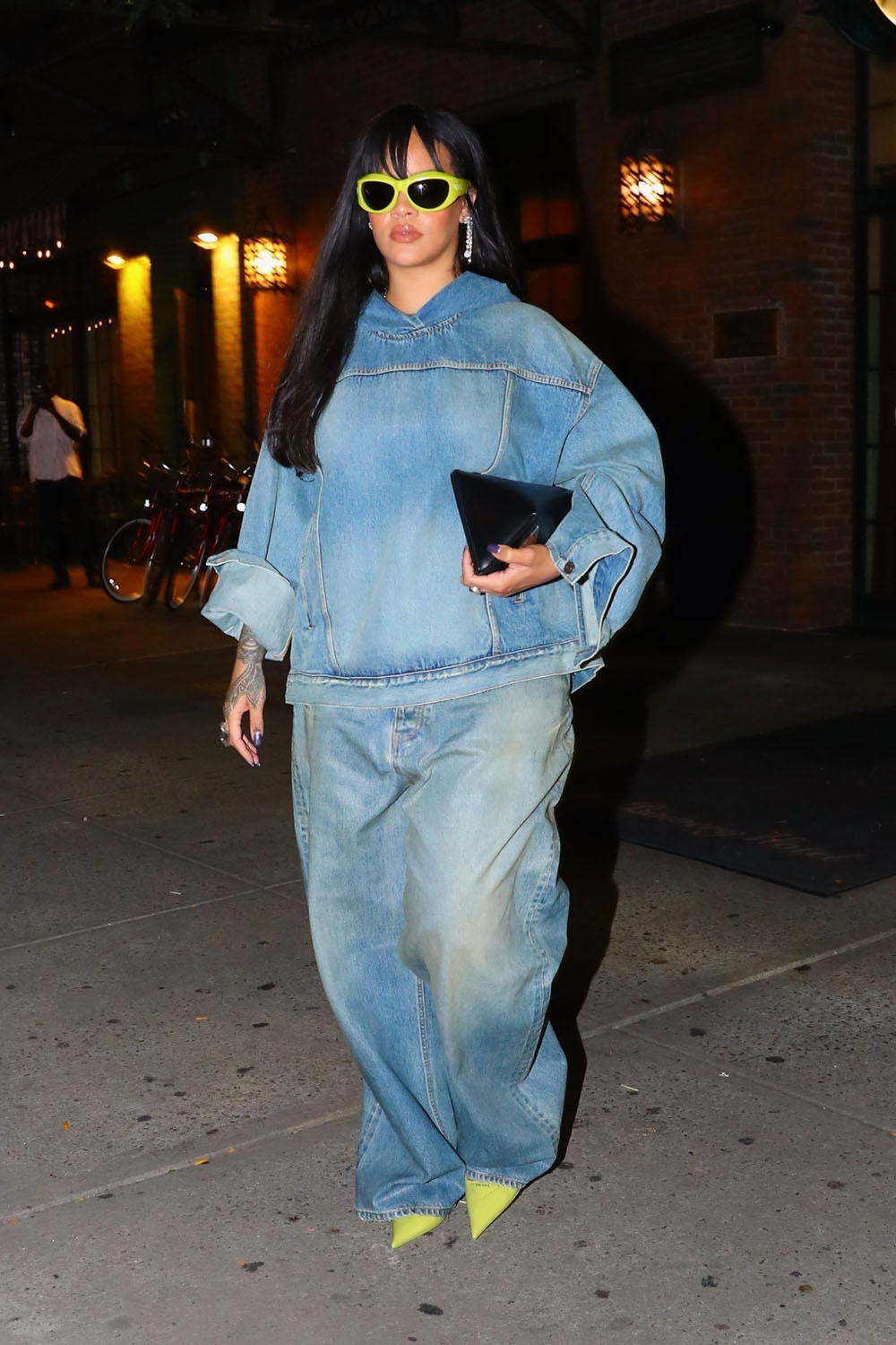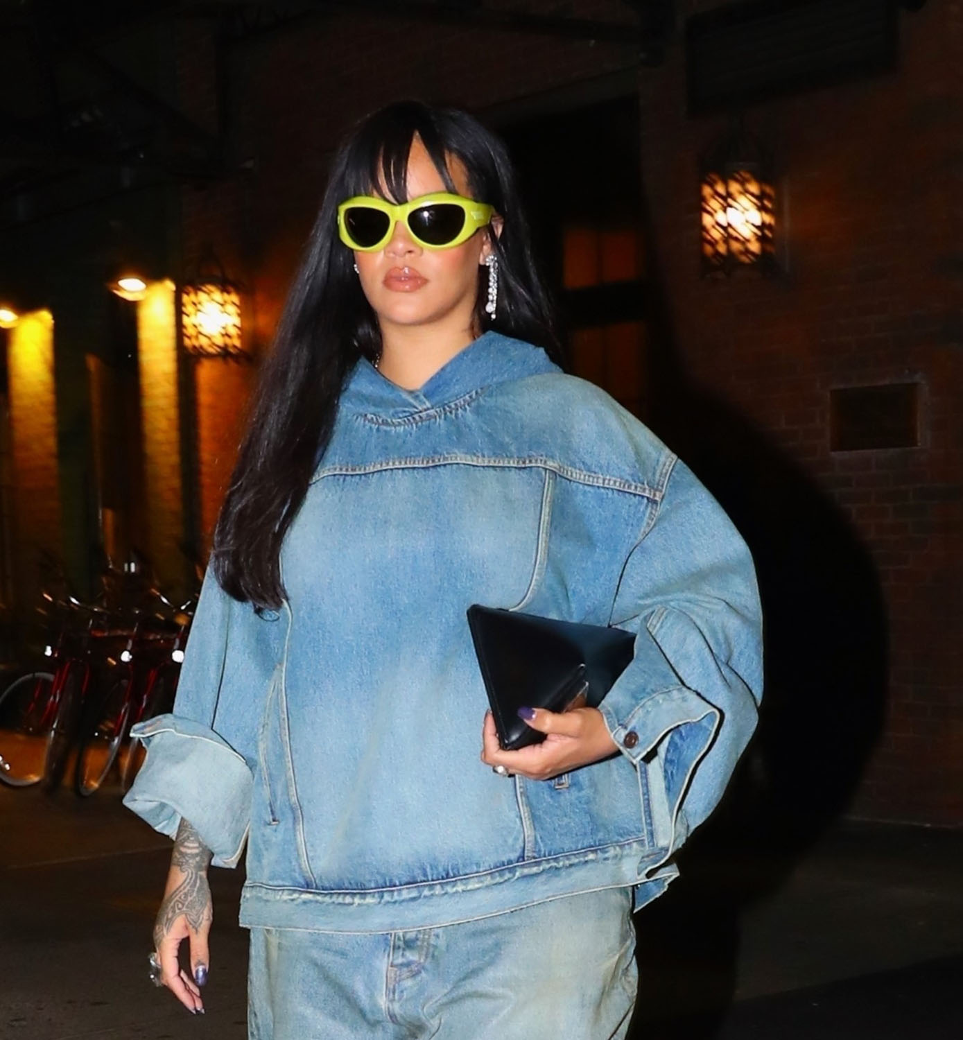 On Saturday Rihanna and Rocky were seen at a party, sending the paps into a frenzy because look at her wearing the sh-t out of this bustier and leather skirt situation. The next night she stepped out to meet some friends and the vibe was a lot more casual: a Balenciaga denim set, and you know what put this look over the top? That's a hoodie. A denim hoodie, like full denim, even the hood. That’s the part you don’t see that often. Not that it hasn’t been done before but I’ve seen it where the denim is a super super soft wash – and that doesn’t seem to be the case here with RiRi’s.