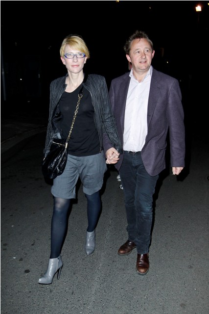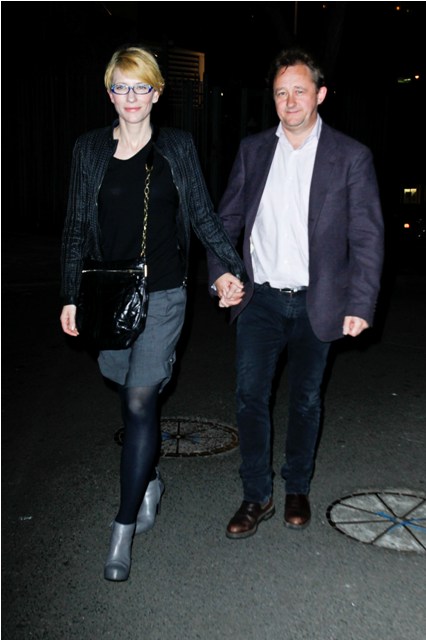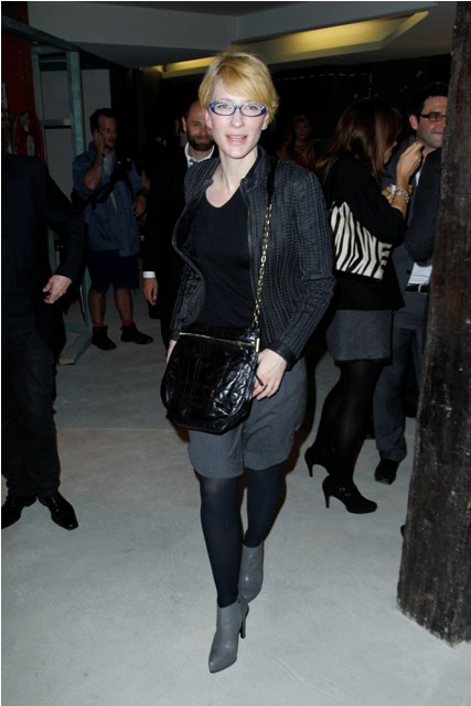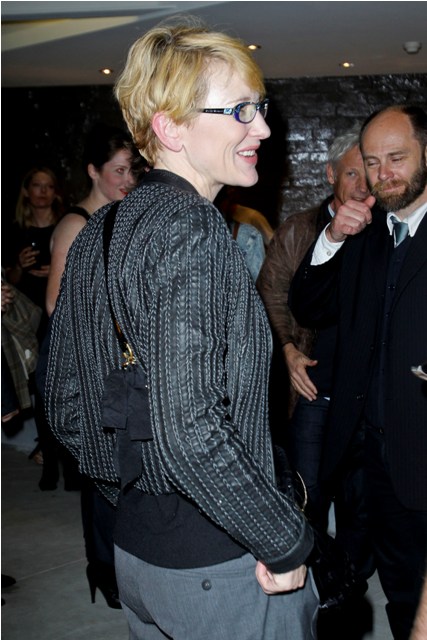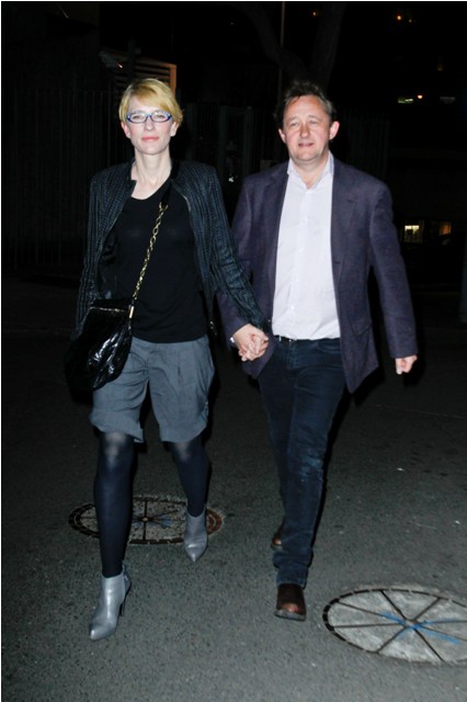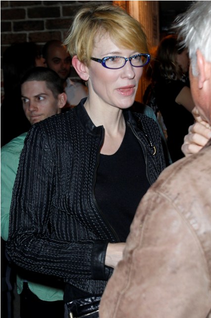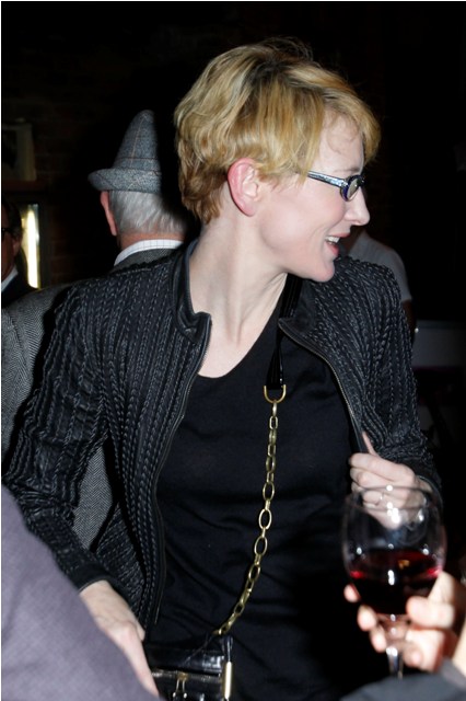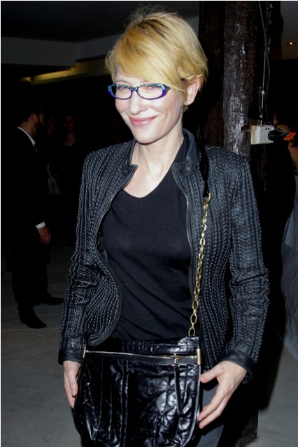 Here’s Cate tonight in Sydney with husband Andrew Upton at the Griffin Theatre’s production of Quack, totally unfussy about her hair, and still steezier than everyone, in Australia and beyond, with a crazy jacket I want so badly and purple rimmed glasses that seem to match her husband’s jacket, a little tacky with those stones on the top edge but somehow, it’s Cate, so it works.