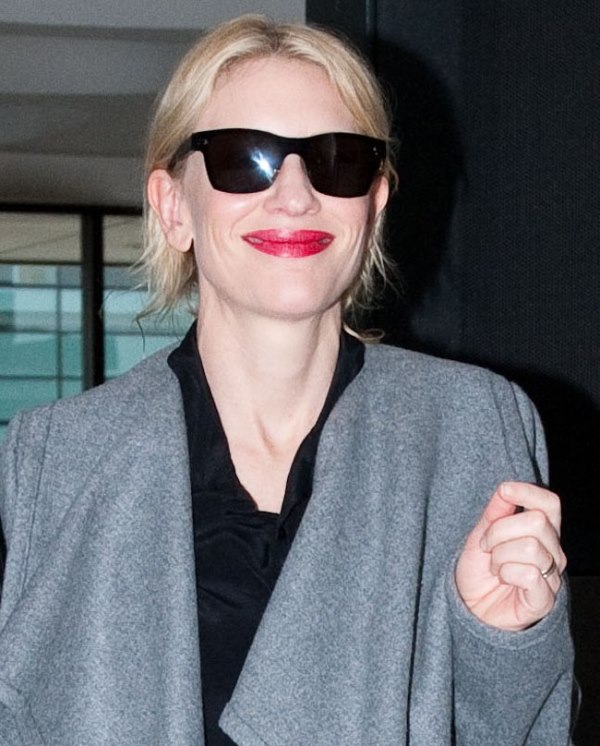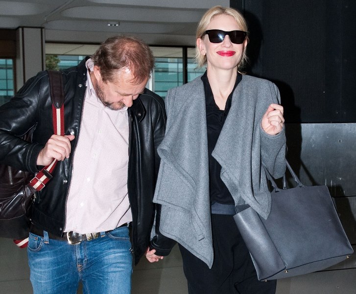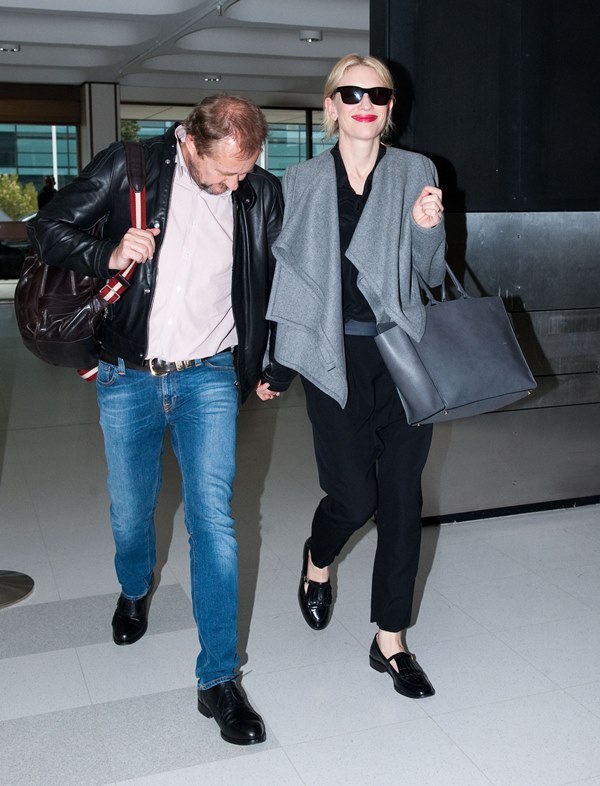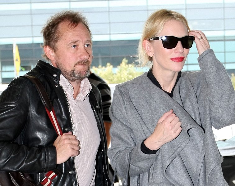 So here's Cate making her way from Australia over to LA with husband Andrew Upton. She'd returned home for a week or so in between award season events. And I love this. Spend as little time in LA as possible. By the way, it's a torrential downpour here in LA right now. I'm writing this from the red carpet where we're shooting etalk and the wind and the water is wreaking havoc, especially since no one here is used to driving in it. They're saying it could be like this on Sunday. That could f-ck up a lot of hair and shoes. Maybe there'll be an Oscar miracle.
