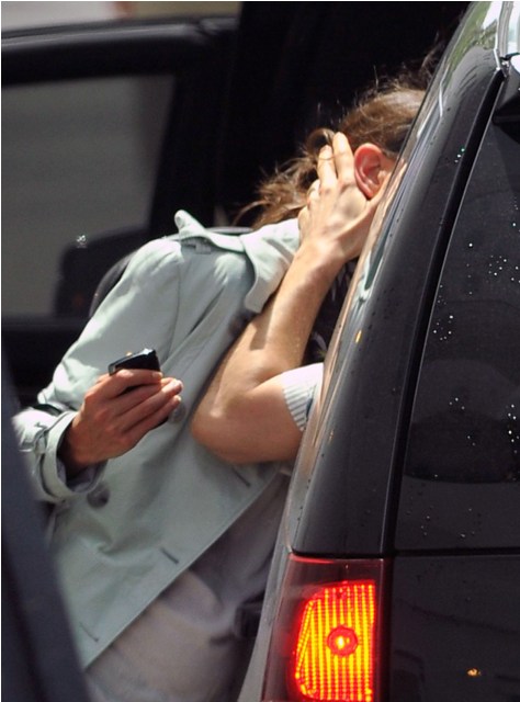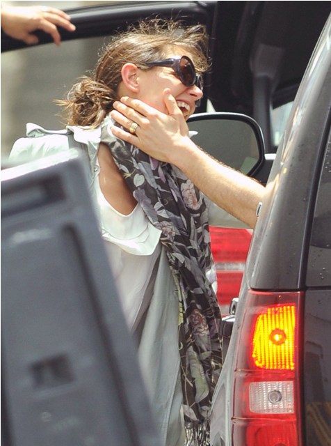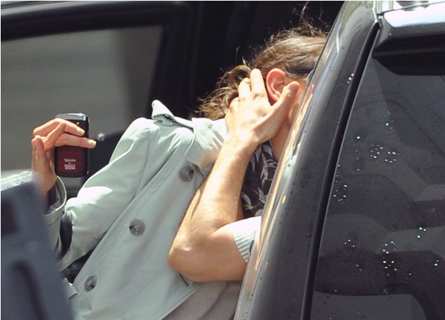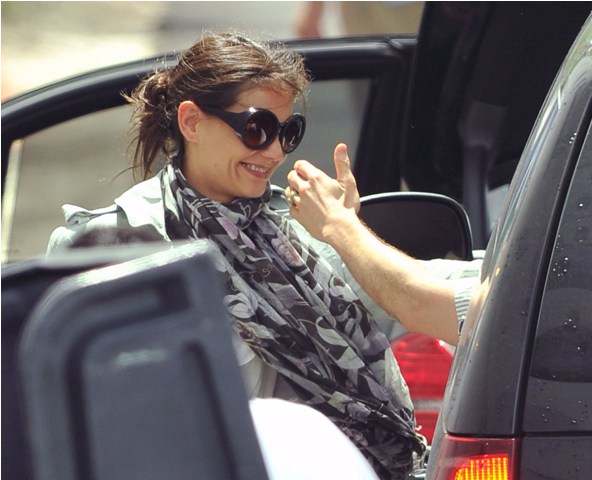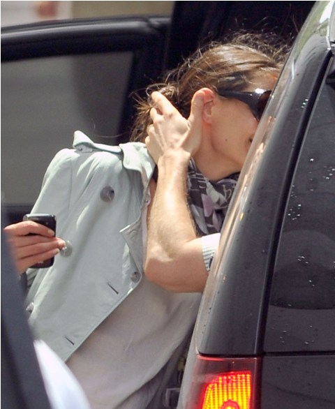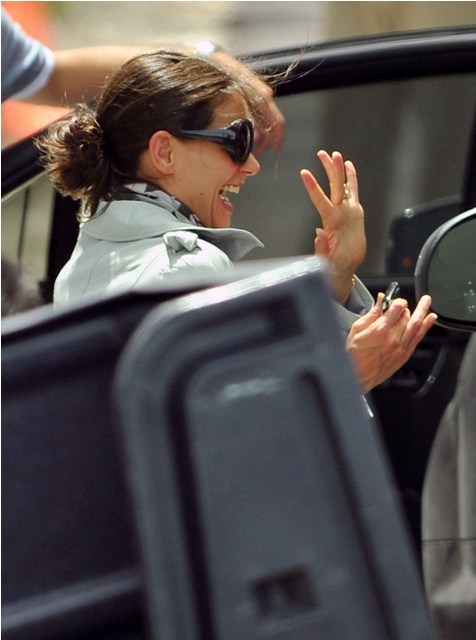 Maybe it’s just me, but these shots of Katie, saying goodbye to Tom before heading to Paris, are cracking me up. It’s only his arm! Like he’s some kind of arms dealer. Or Greta Garbo. A blessing from the SUV. And look how grateful and happy she is too. Because she feels truly fortunate to receive his absolution for daring to go to a fashion show? Or is it relief to be away for a few days?