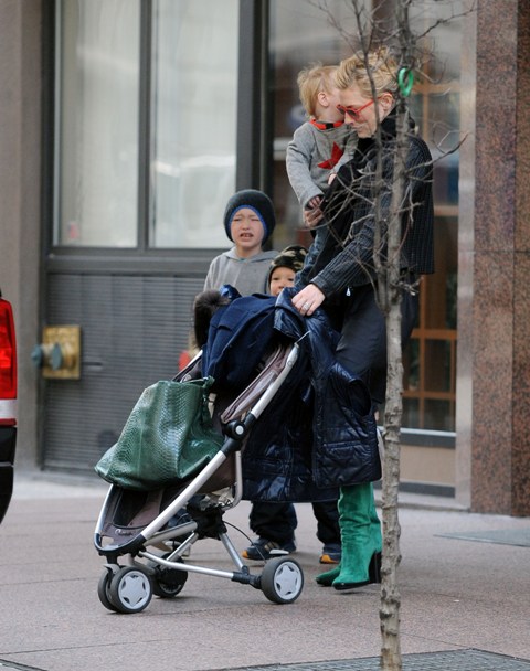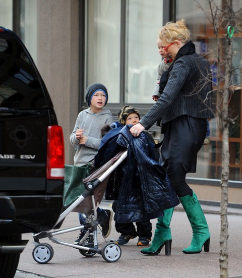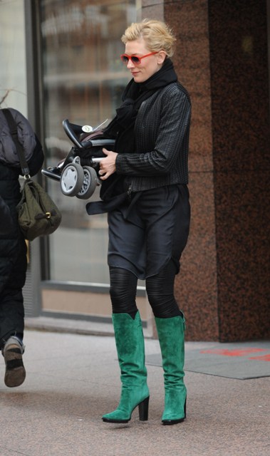 She’s managing her three boys, getting them all into the car, running errands, and killing it in green boots with red trim shades.