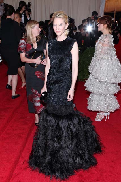 I’m not saying it sucks. I’m not saying it’s Paula Patton. But by Cate Blanchett standards, I am underwhelmed. It’s fitted black with a high collar and another f-cking feathered skirt. And it’s McQueen. It has to be the tamest, most restrained McQueen in the collection. Check back on Florence Welch for comparison here. Cate’s dress isn’t much of a conversation, is it? You won’t be talking about it next week, in 6 months, next year.