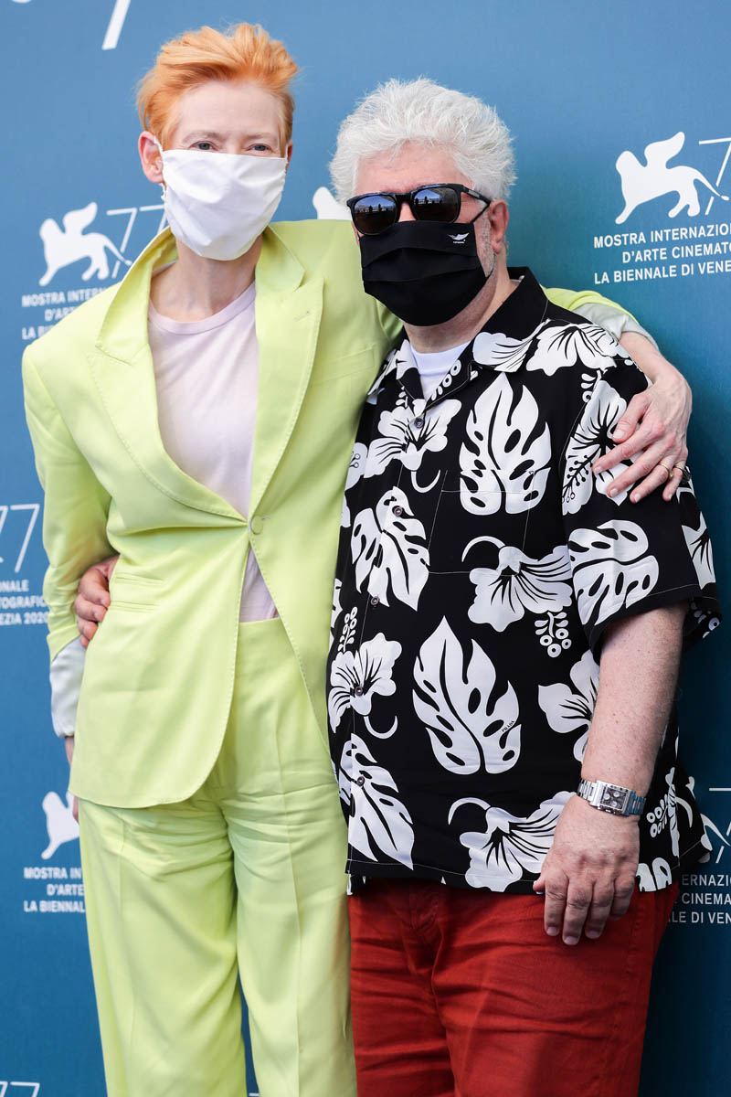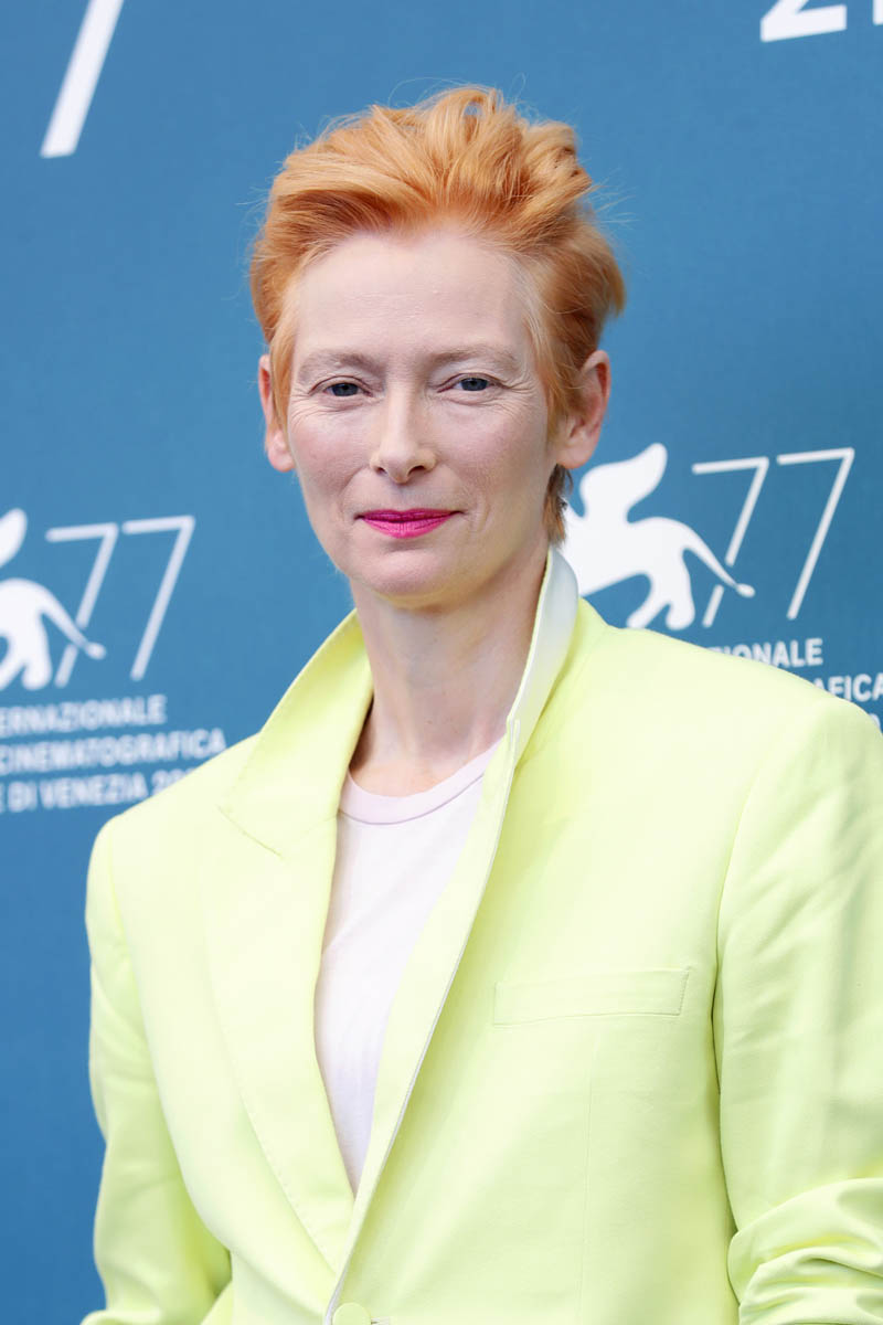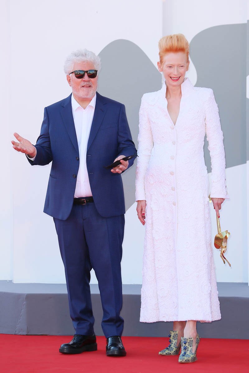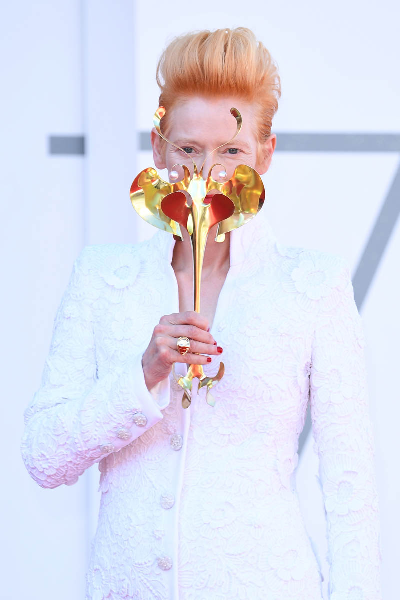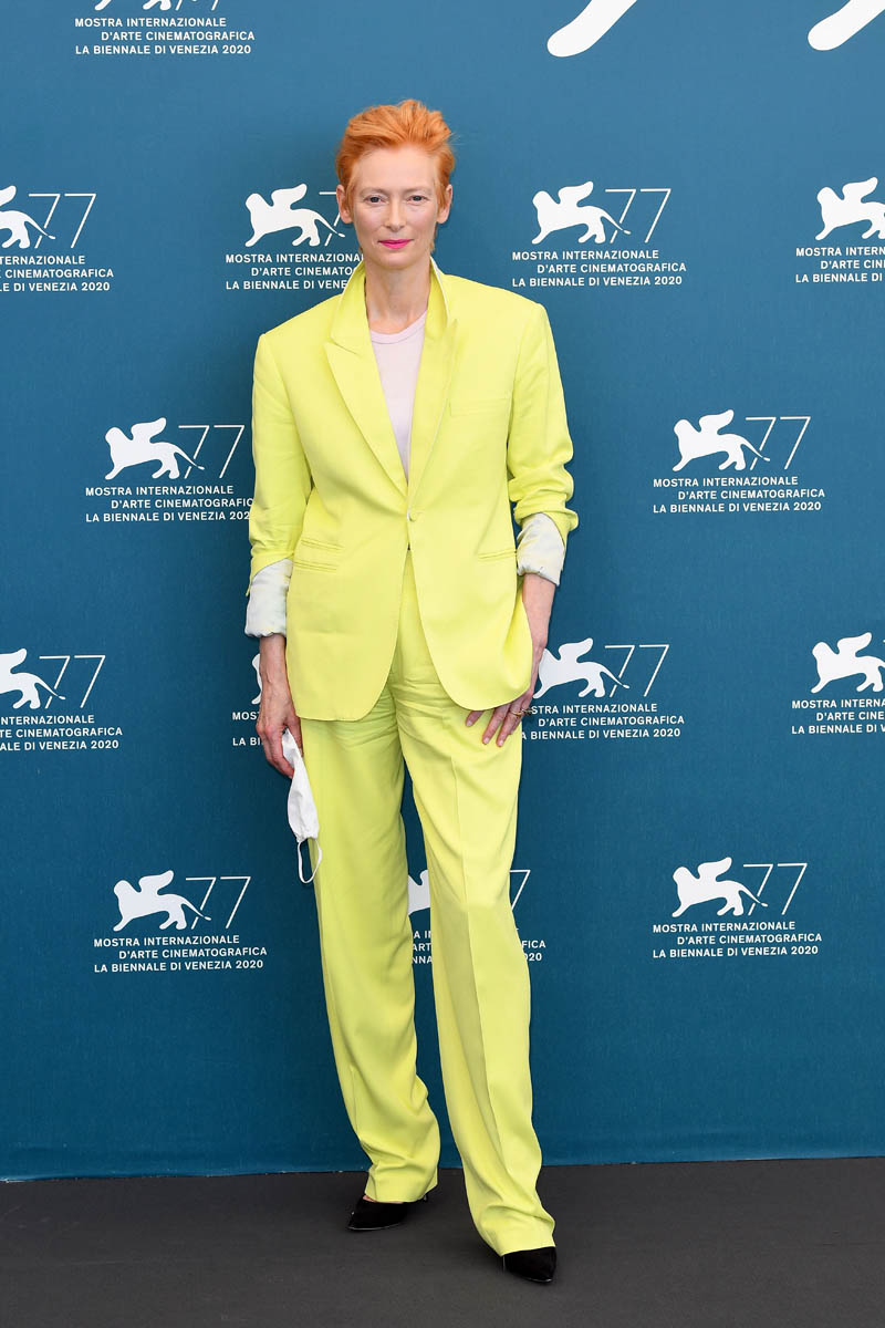 Now back to the fashion, Tilda went with white last night at the gala to receive her lifetime achievement award. It’s a gorgeous fit, this long jacket dress, and the hair is perfect, and she accessorised with a Venetian mask. Earlier in the day, Tilda was in a bright yellow suit for the photo call with Pedro Almodovar.