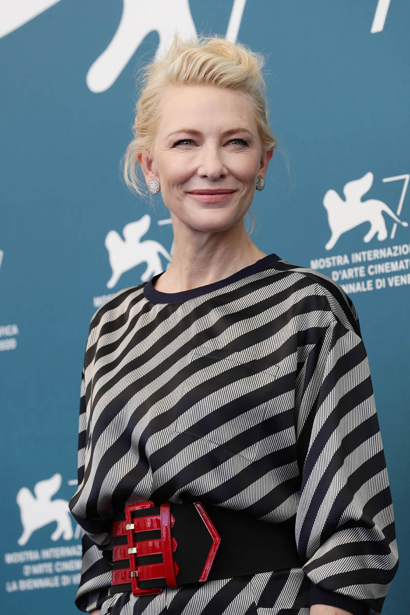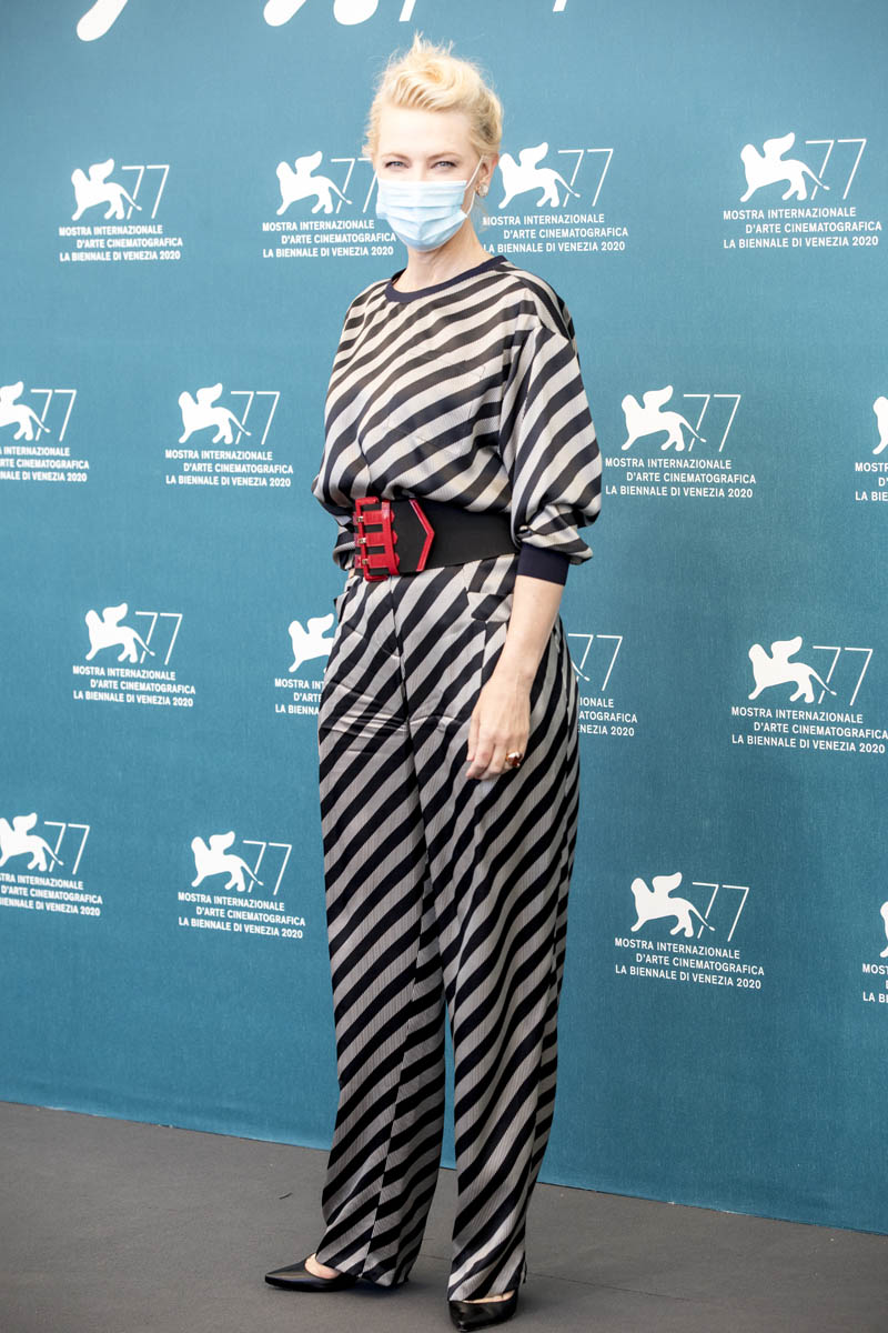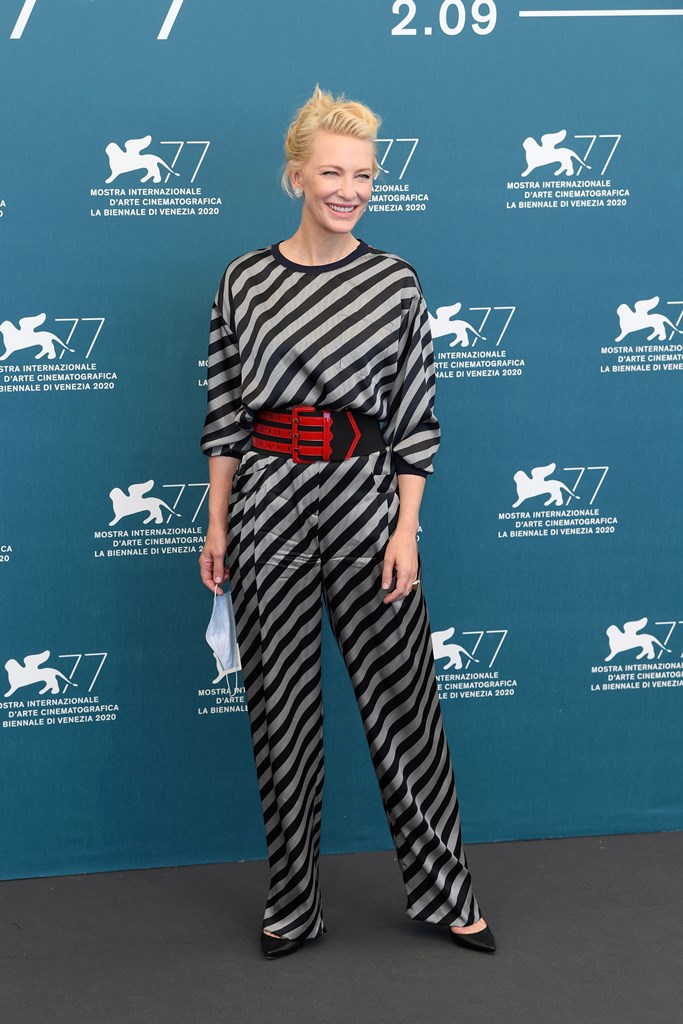As for Cate, obsessed with the grey and black diagonal stripes she wore for the photo call, with a red striped belt. Cate kept the mask on for group shots and took it off for solos: