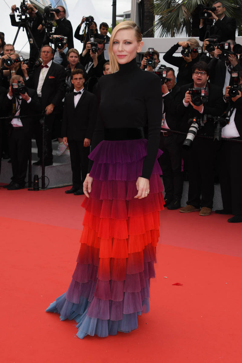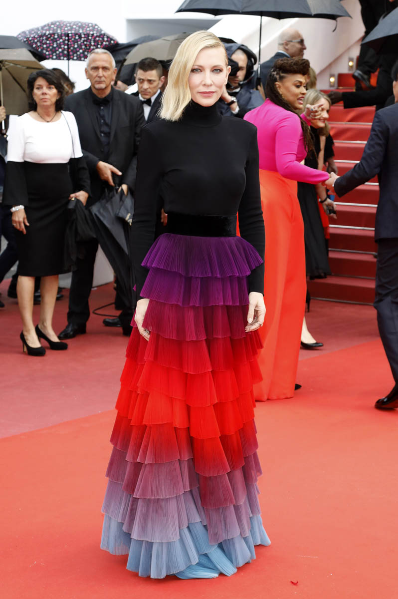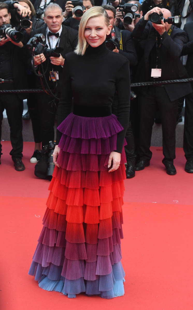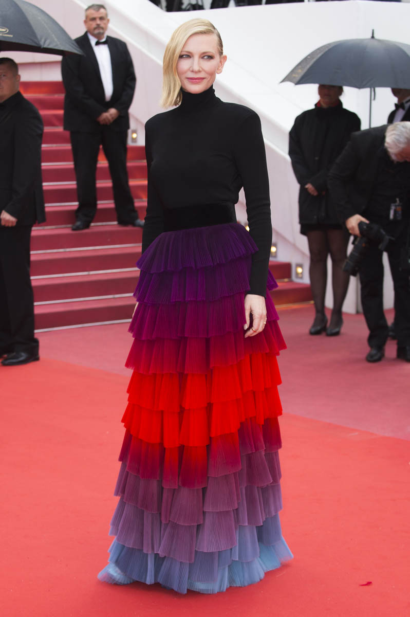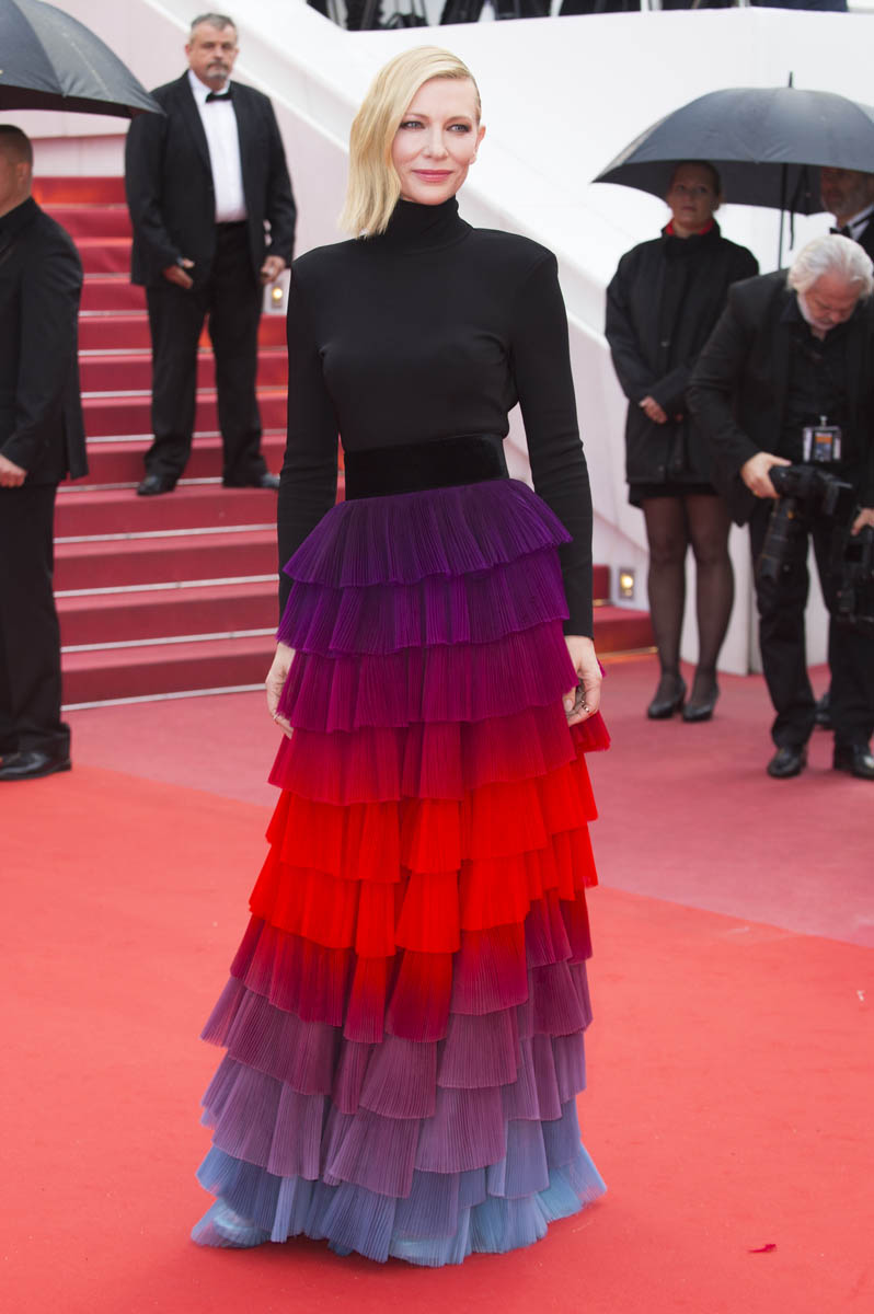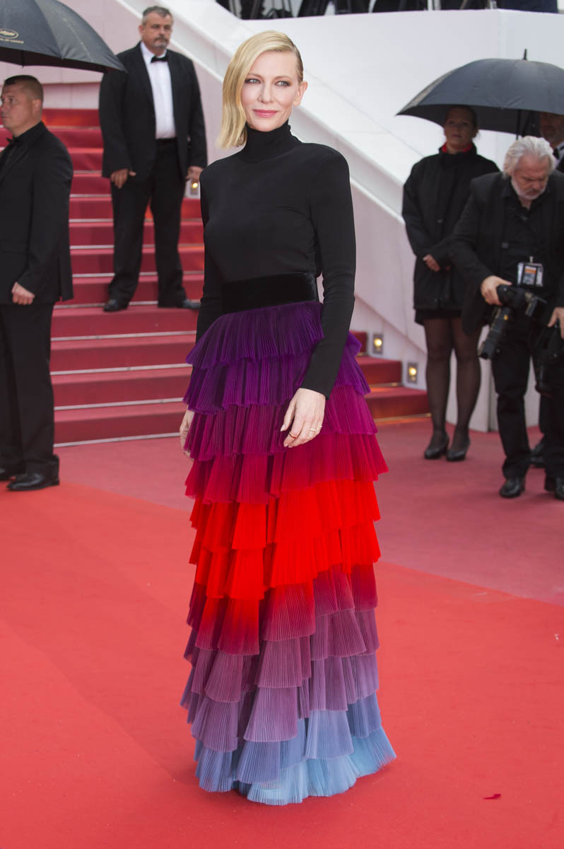 You know why it’s so amazing? The black turtleneck. Because it’s not like we’ve never seen a rainbow tiered skirt before. We just don’t often see people resisting the urge to make it full-body. I wouldn’t care for this it if was full-body. Picture it. A full-body situation here is so much less special. It’s the black top that makes the skirt extra special. The black serves up the rainbow, it allows the rainbow to make a bigger impact. And, at the same time, it grounds the rainbow, so that it’s not as annoyingly twee as it would be if it had been extended above the waist. Kate Hudson would have worn it above the waist. Cate Blanchett knows where it should stop and start.