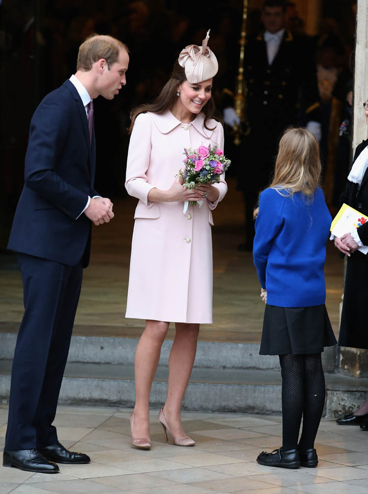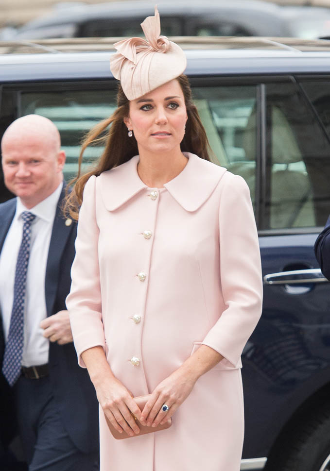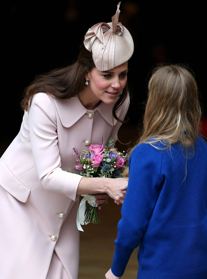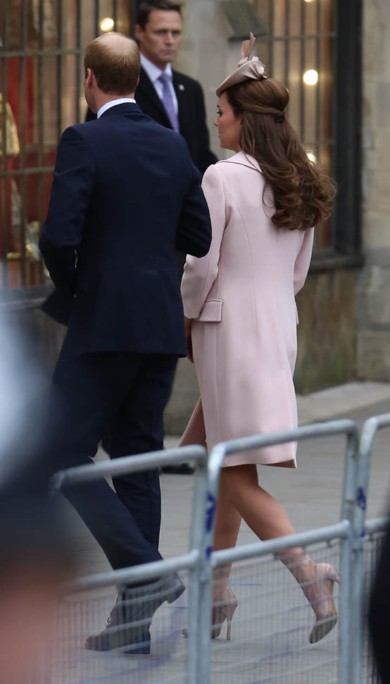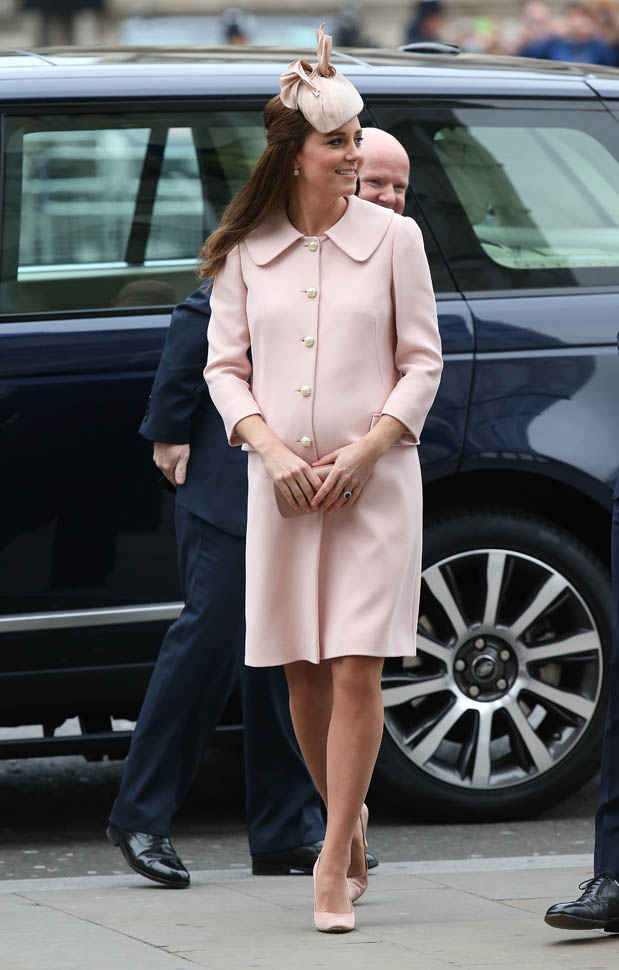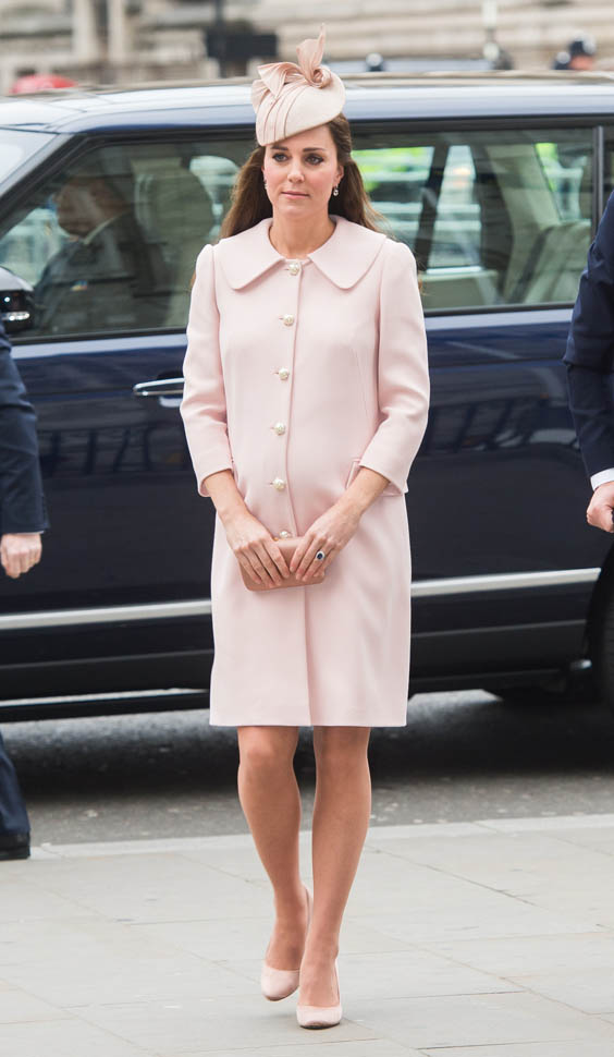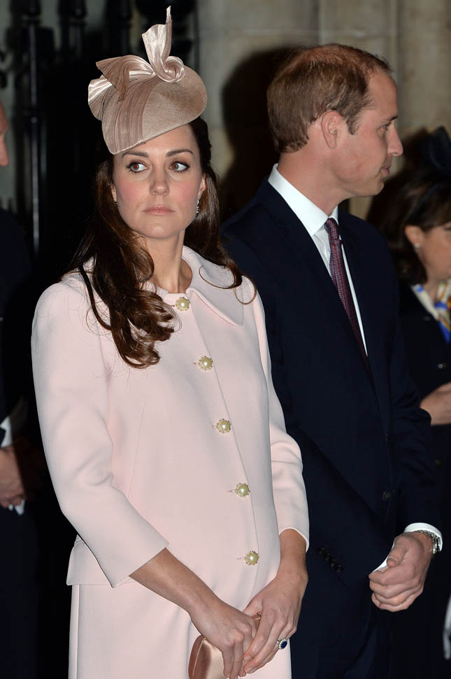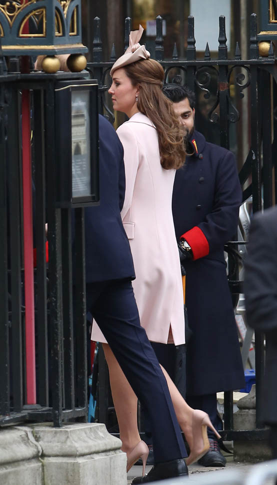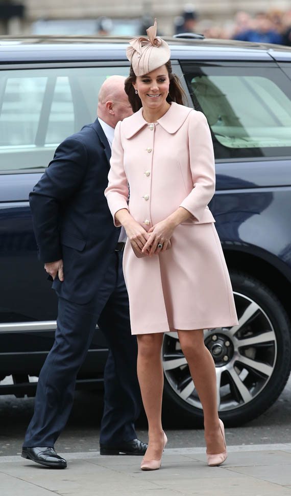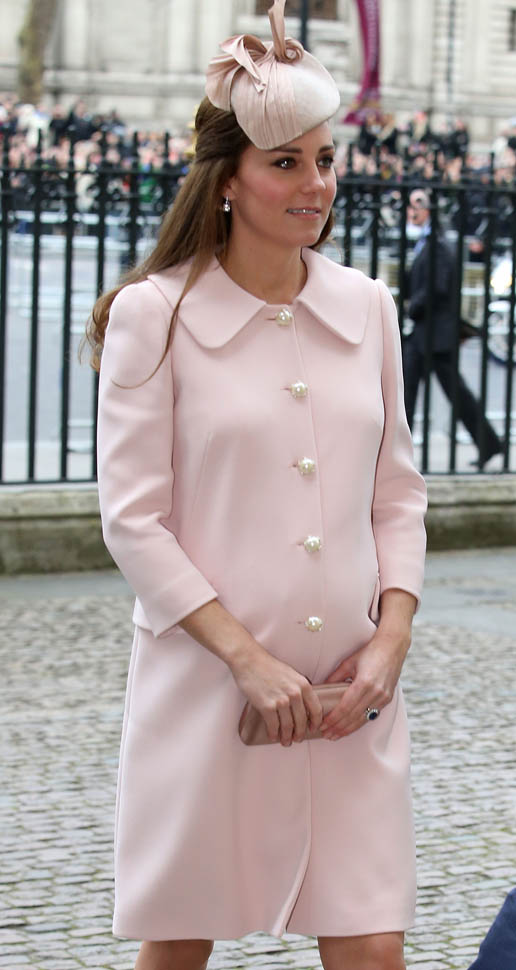 As you can see, it was an all blush day for Kate. From the hat to the coat to the clutch to the (f-cking satin) shoes, it’s pink from head to toe. And I’m sure some idiot is going to take that to mean she’s having a girl.