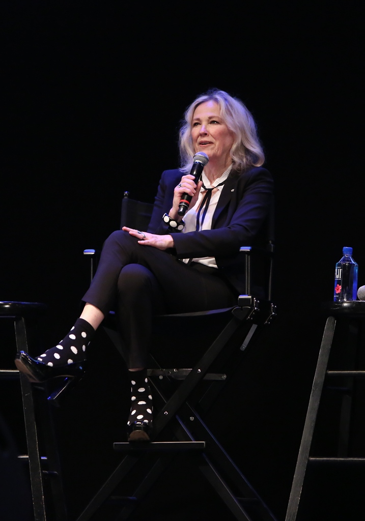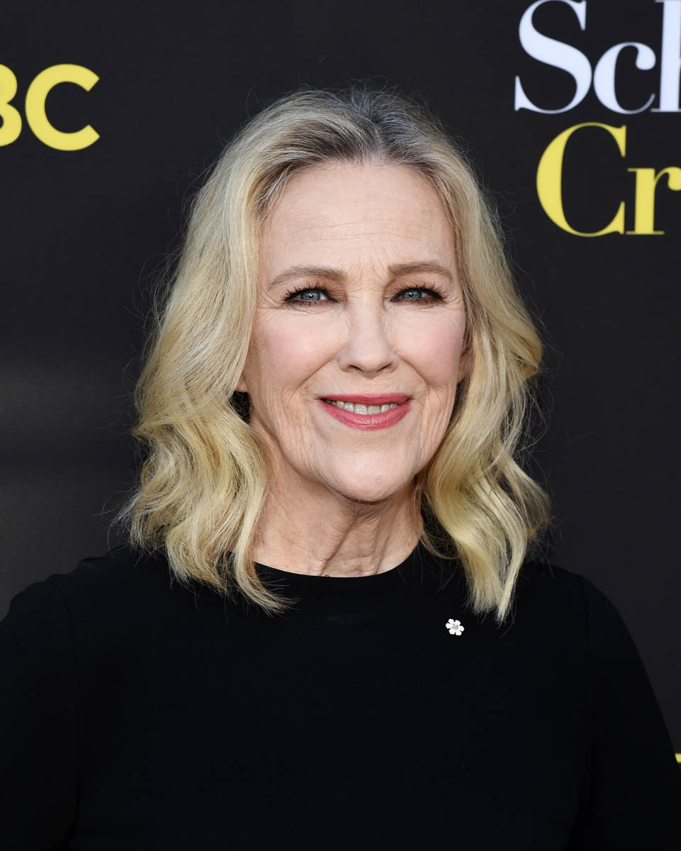 Check out Catherine O’Hara at the FYC Schitt’s Creek event last night in LA. It’s a simple well-cut dress, looks great on her. She’s kicking up the look though with those striped socks. I LOVE this. She did the same thing a few days ago at another Schitt’s Creek campaign stop – again, this is a great suit with a white blouse. But the polka dot socks bring the personality.
