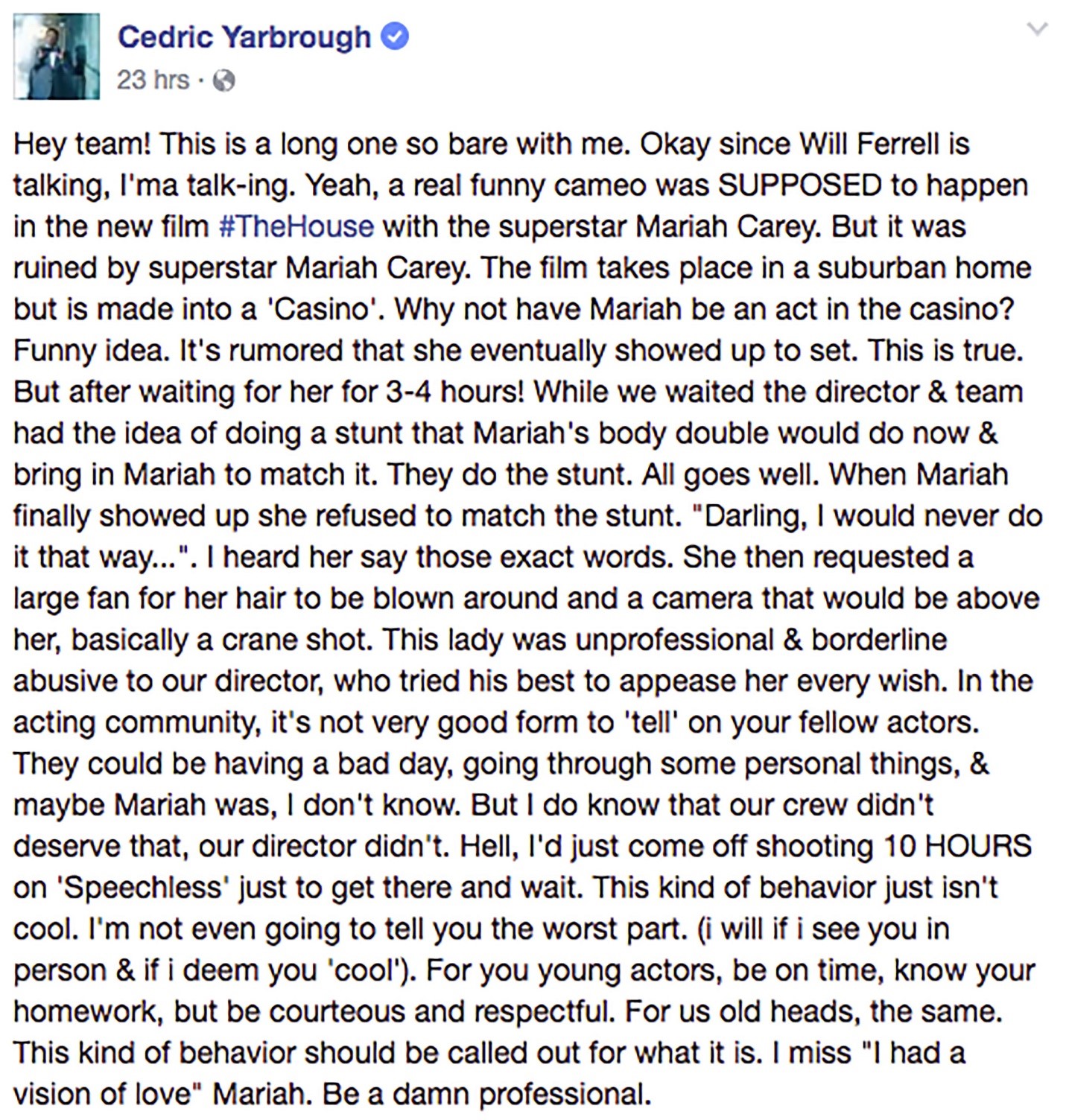 Will was pretty diplomatic, all things considered. Cedric Yarbrough, however, was not. Here’s what he posted on Facebook in a post that’s been taken down but…you know… internet, forever, etc (Source: EW/click image for full text):