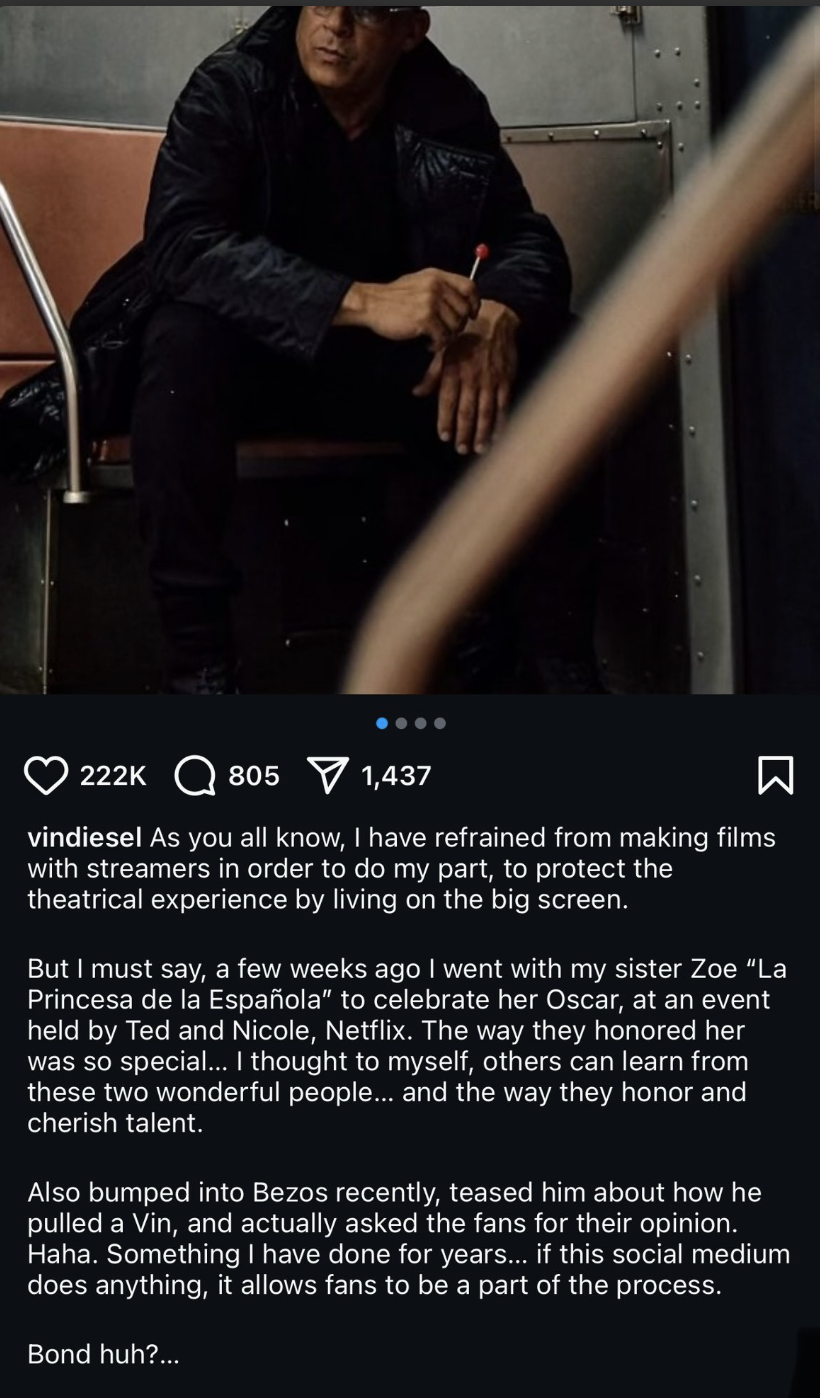 Even though I think Jeff Bezos is tacky, he has the ability to do the funniest thing ever and cast Vin Diesel as James Bond. Vin posted about it and then changed the caption to a Kojak reference – I have no idea why. How could I possibly explain this.