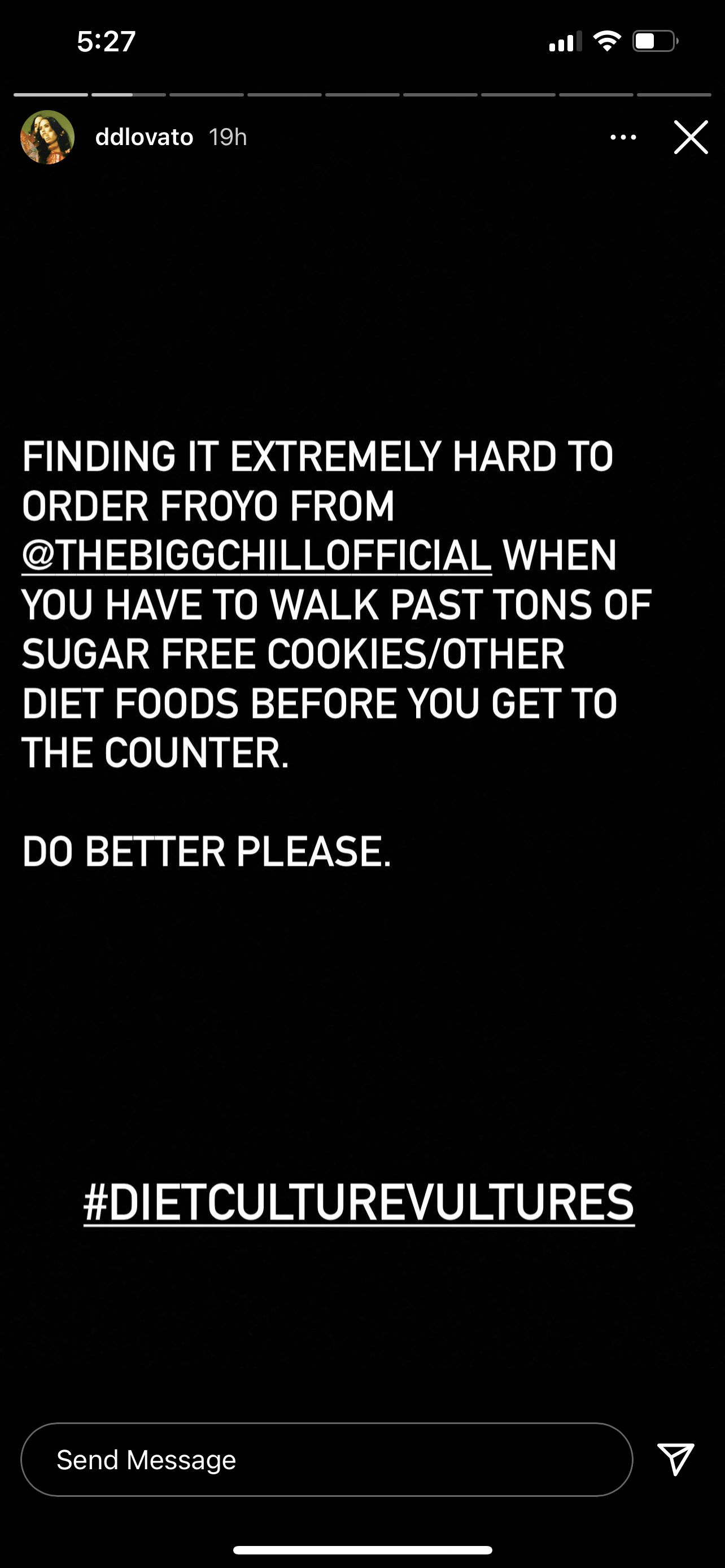 Demi Lovato took to her Instagram stories to complain about a froyo shop perpetuating diet culture with its snack options. Demi is no stranger to social media skirmishes and honestly? This is not her best work. This relatively small shop had about 5k followers and she has the Lovatics. She said she was triggered by the snacks, which is absolutely her experience, no one can argue that. But the question is whose job is it to manage her triggers.