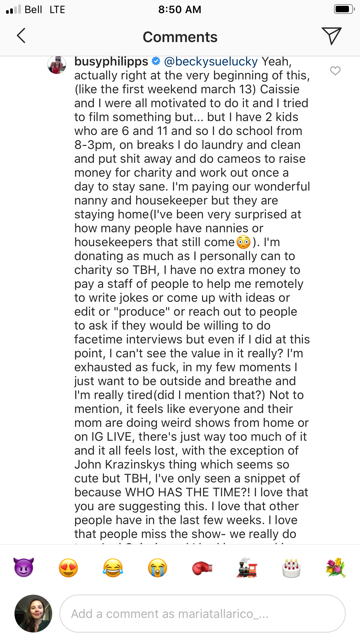 In the comments of this post, someone asked Busy if she would reboot her talk show on Instagram Live. Her answer is quite honest – she’s thought about it, but she doesn’t have the money for production (like off-site editors). Also, there’s the “going Live” bit – everyone is going Live, with varying results. Sometimes it’s embarrassing, but sometimes it’s like a second job: Miley Cyrus’s Bright Minded talk show is pulling in several big name guests every night (seriously, it’s as good as any late night show) and the other one that is highly produced is John Krasinski’s Some Good News. But back to Busy’s point: John is putting some time and money into this, to have it cut together and all the coordination between celebrities (like the JoBros and Billie Eilish); it’s light hearted entertainment, but that doesn’t mean it’s easy to do.