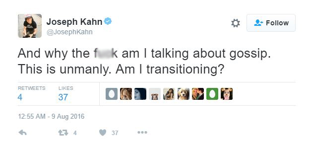 So this guy, Joseph Kahn (he directs Taylor Swift videos) goes out of his way to comment on/insert himself into stories but thinks gossip is feminine and thus beneath him? And the transgender joke, very edgy (in 1986).