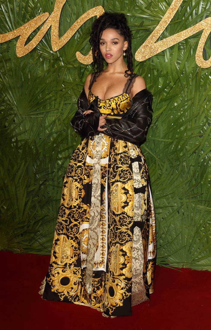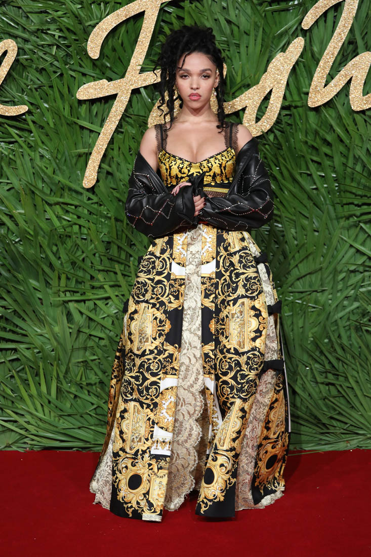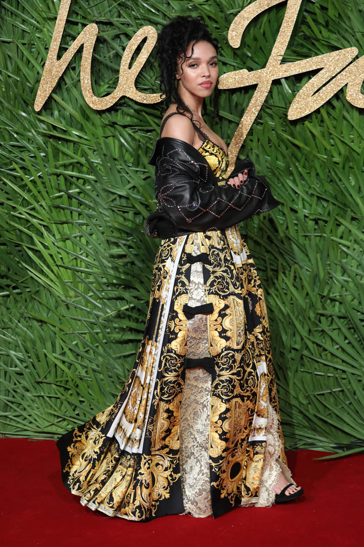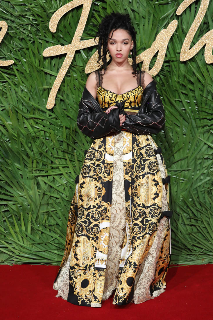 FKA twigs looks like she stepped out of Baroque painting. It’s a very dramatic Versace dress, but it doesn’t overpower her.