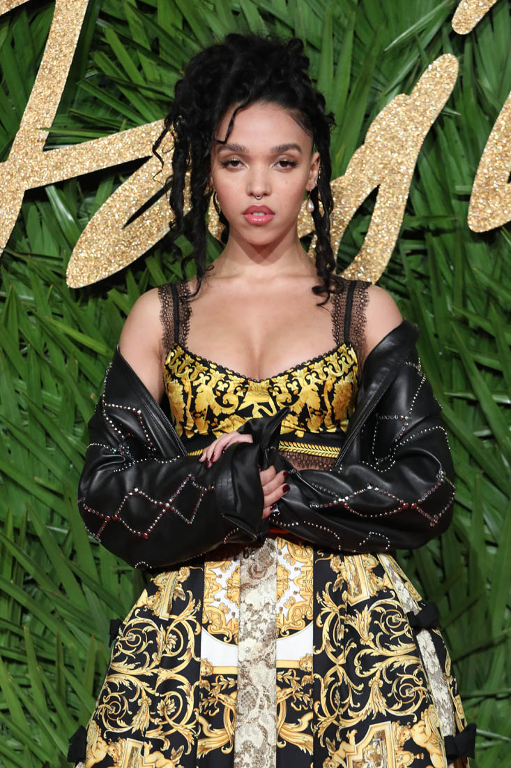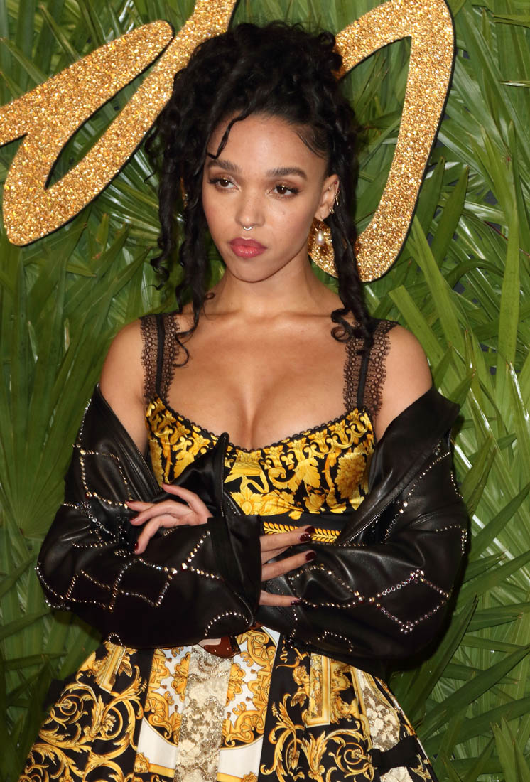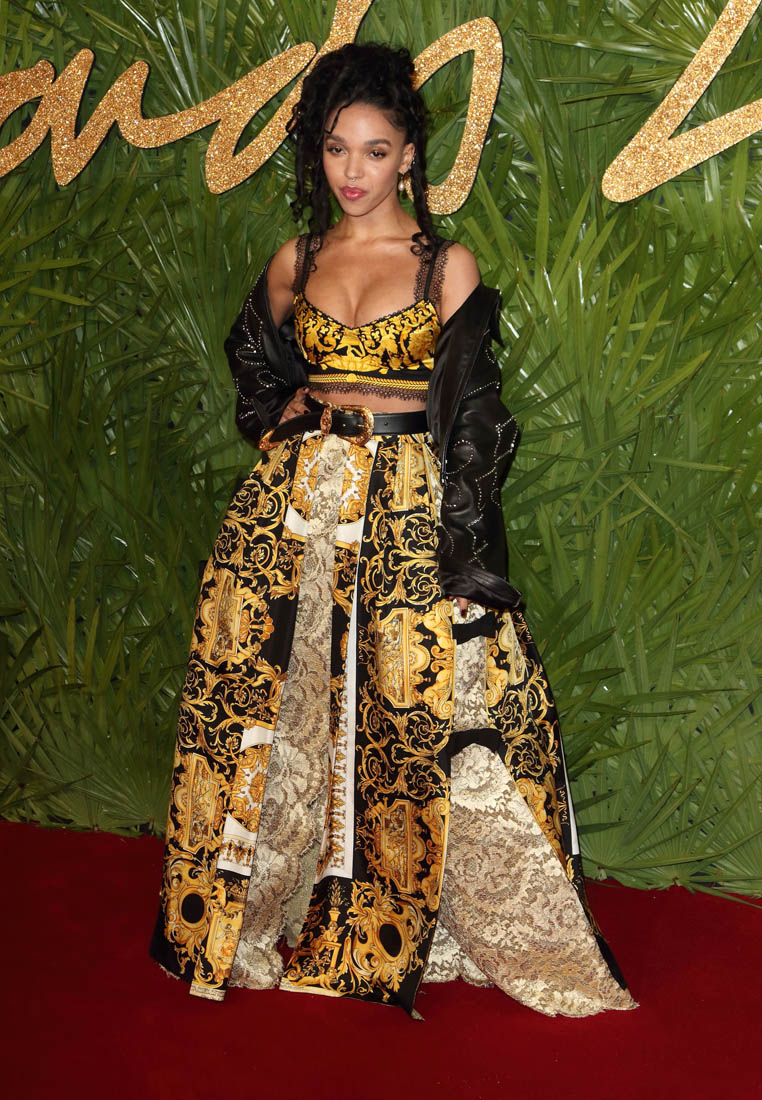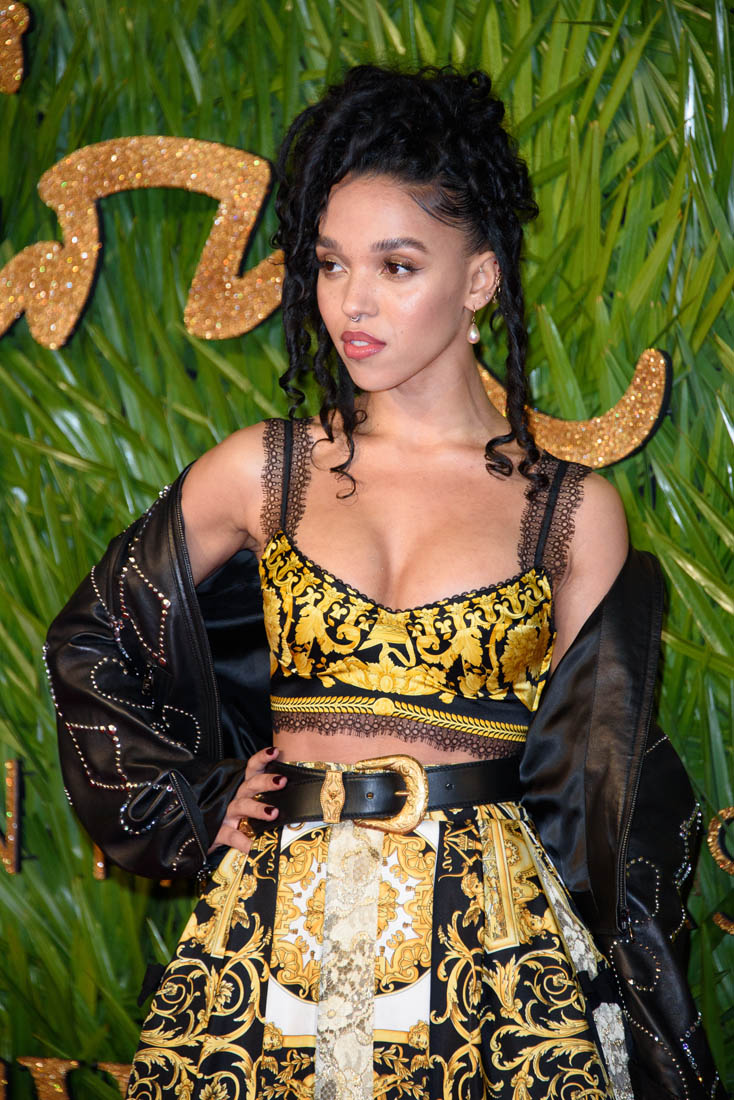 FKA twigs looks like she stepped out of Baroque painting. It’s a very dramatic Versace dress, but it doesn’t overpower her.