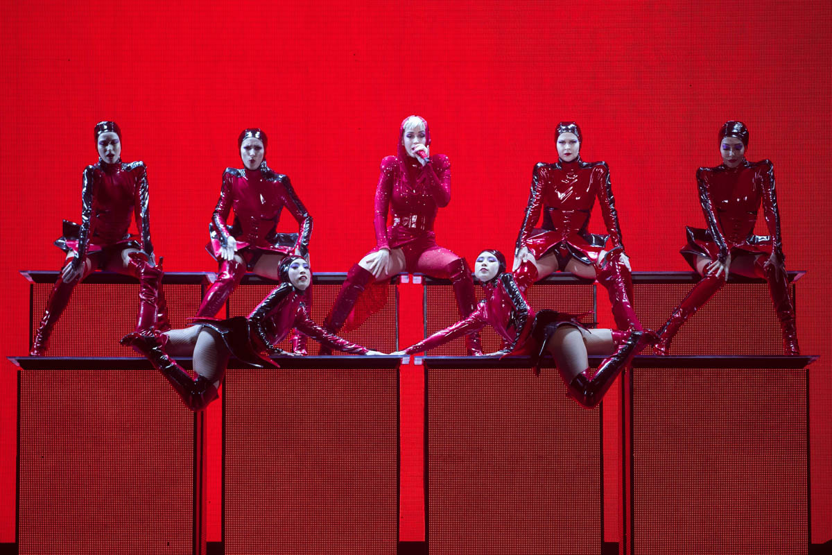 Katy Perry’s American Idol wardrobe is not coming together well. There is a style instinct that seems to be missing here – this is not color-blocking or monochromatic, but it’s also not clashing. Three shades of pink, two versions of stonewash, hoop earrings that don’t stand out because of the fur collar, and a severe brow and lip (which was probably supposed to juxtapose the feminine pinks) – there’s too much going on. I think she should lean into her hair more, let that be the focal point of more of her looks (especially for TV).