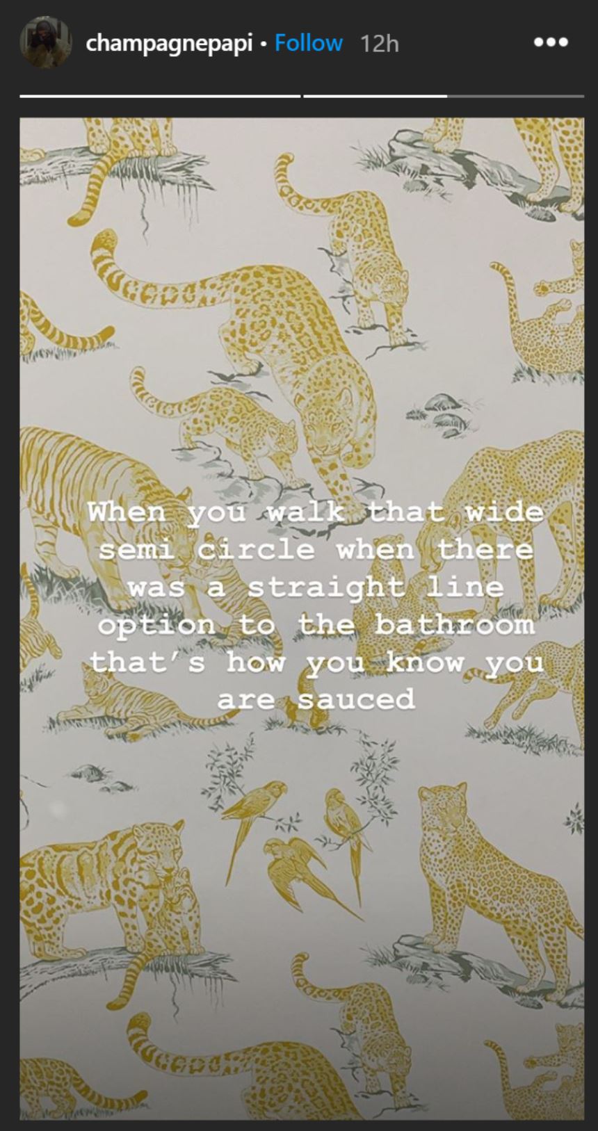 What Drake is saying here might be true, but also, how many of us have the space in our homes to walk a semicircle to the bathroom, LOL? If I was ever invited to Chateau Drake, I’d walk as many semicircles on the way to the bathroom as I could, sauced or not, because there would be so much to snoop at.