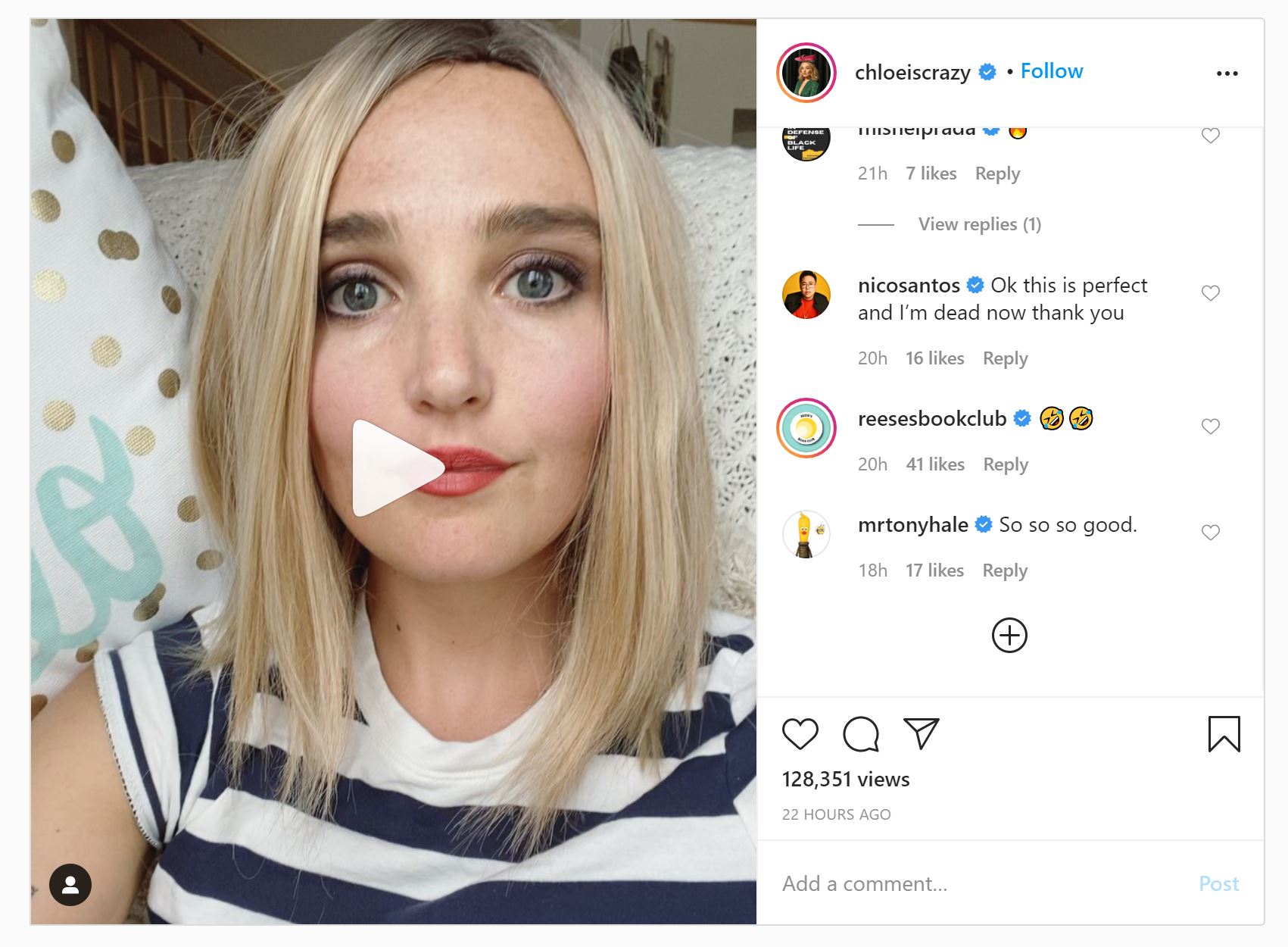 It’s Emmy nomination season and potential nominees are making their final pushes with their For Your Consideration campaigns on social media since, you know, people should still be in lockdown. Chloe Fineman is campaigning for Reese Witherspoon, sort of. This is a Reese impression but it’s also a commentary on what awards campaigning is like during the time(line) of COVID-19. Chloe’s making a case that she could be the next breakout star of Saturday Night Live. And Reese’s Book Club approves.